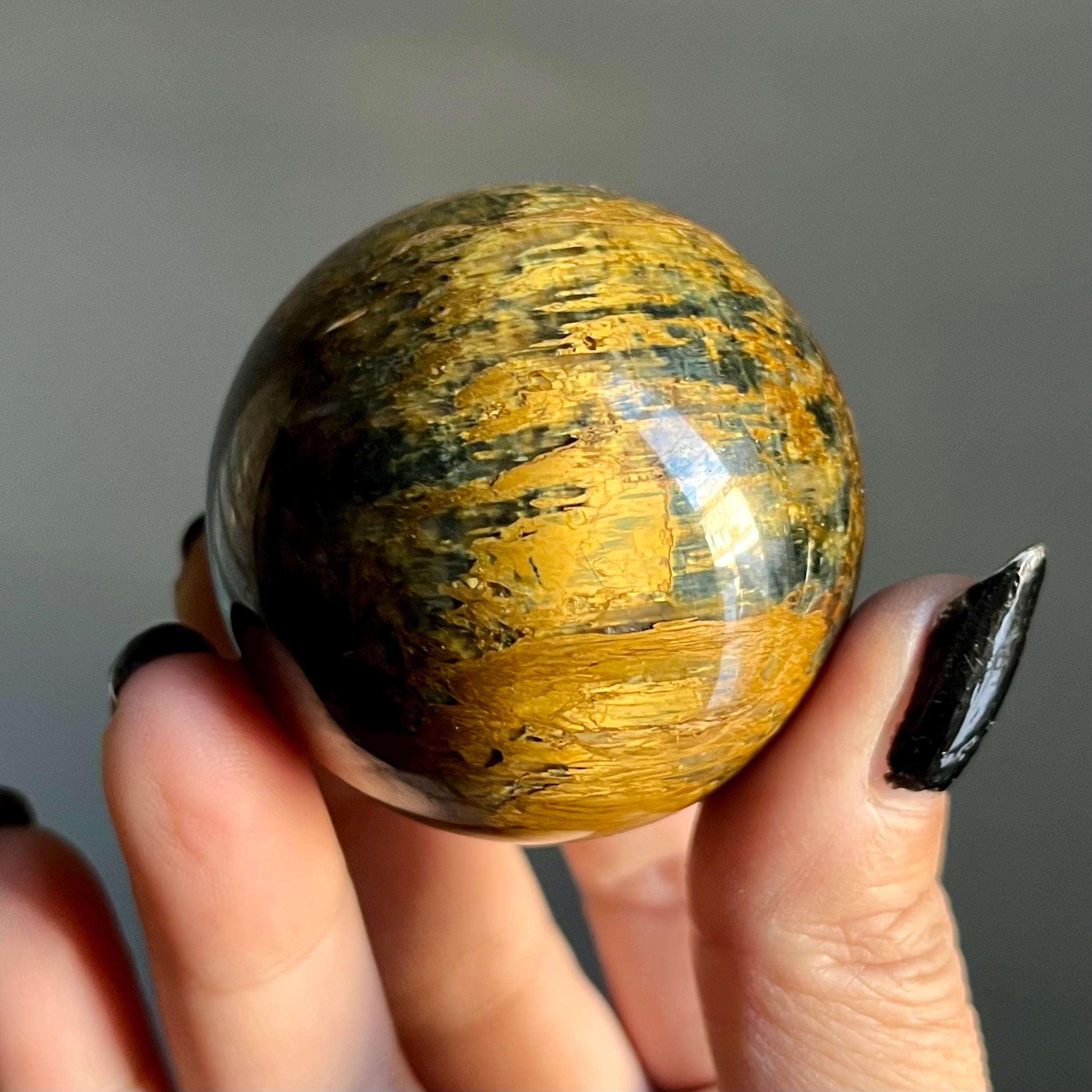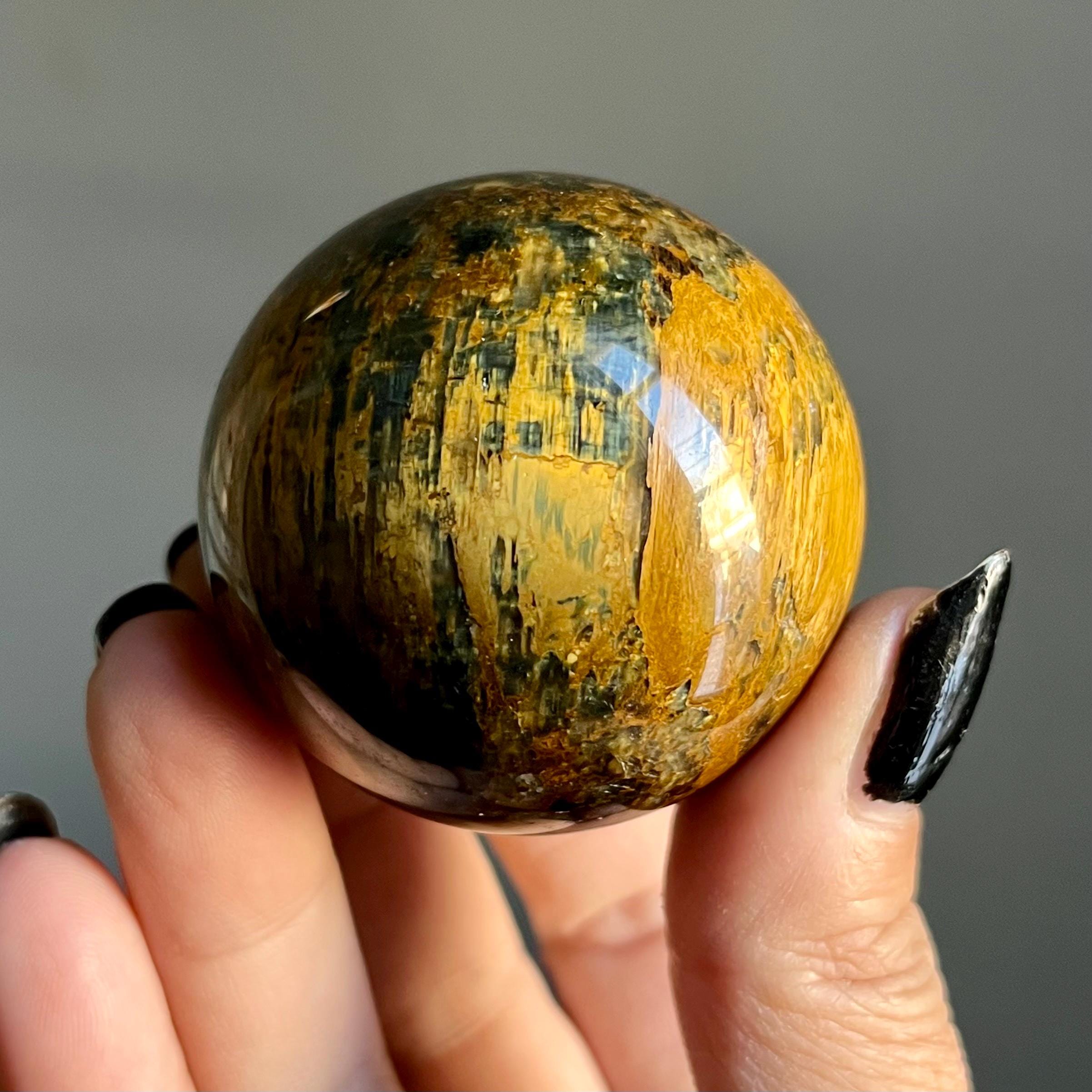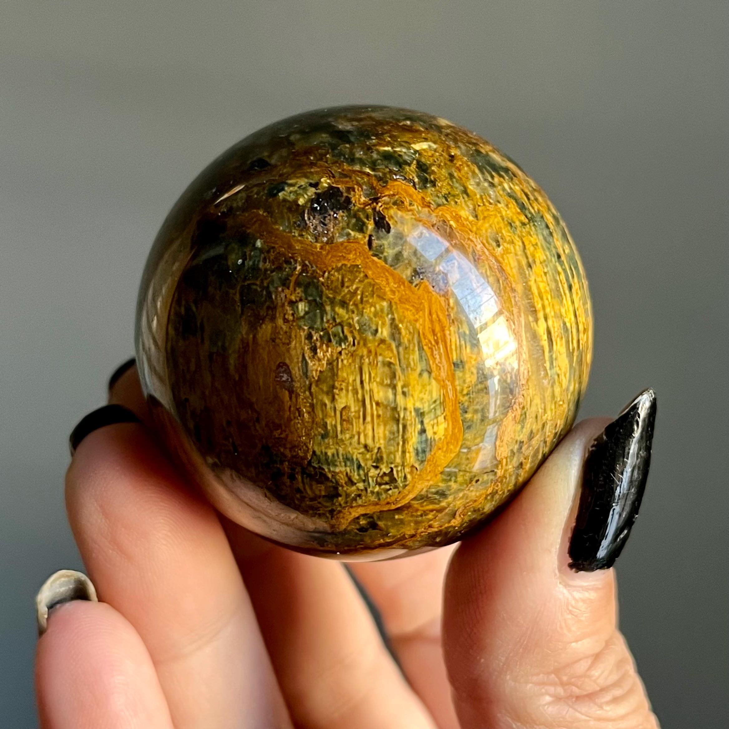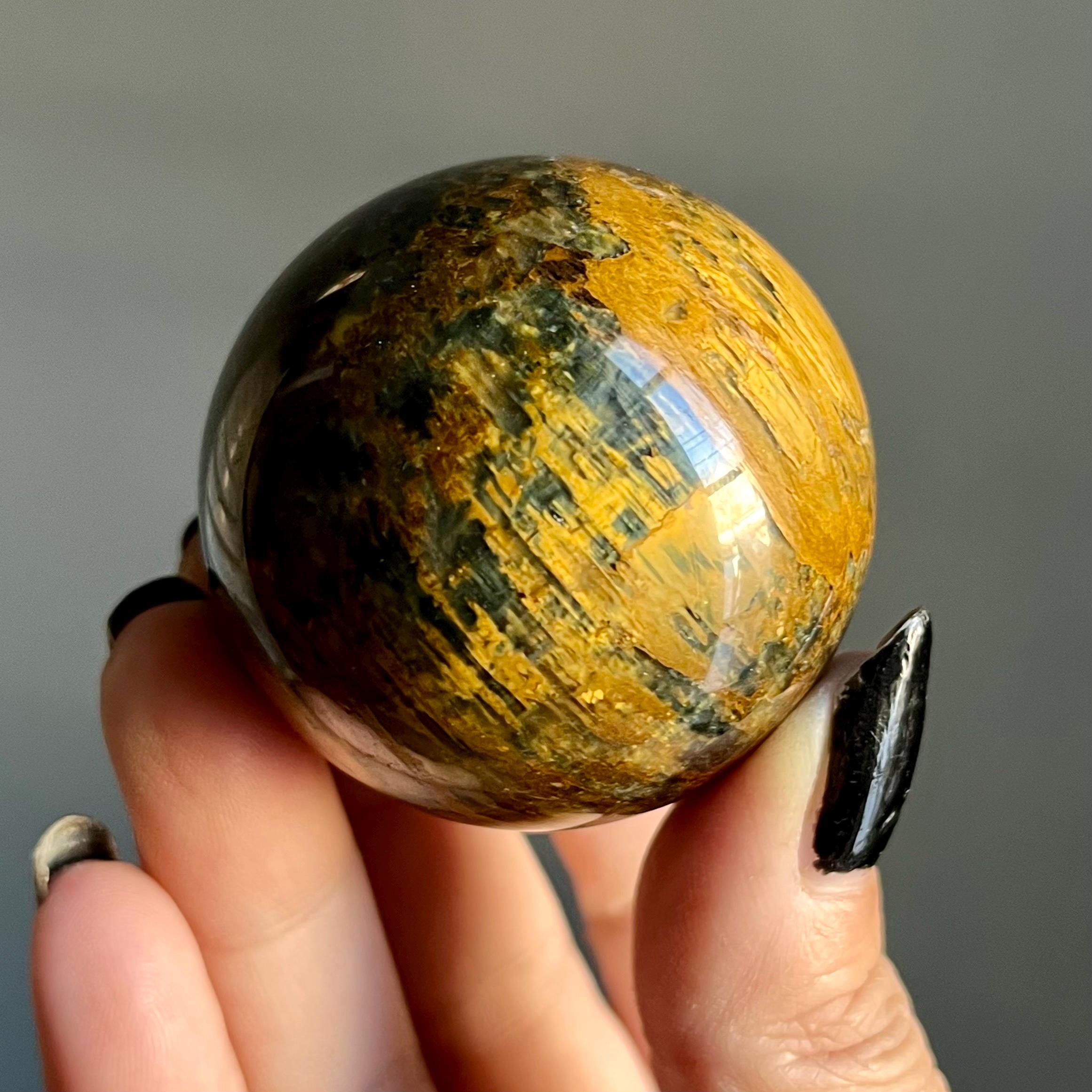 Found in the deserts of Namibia, this extraordinary, multicolored amphibole sphere is a pseudomorph of crocidolite (a member of the riebeckite family).