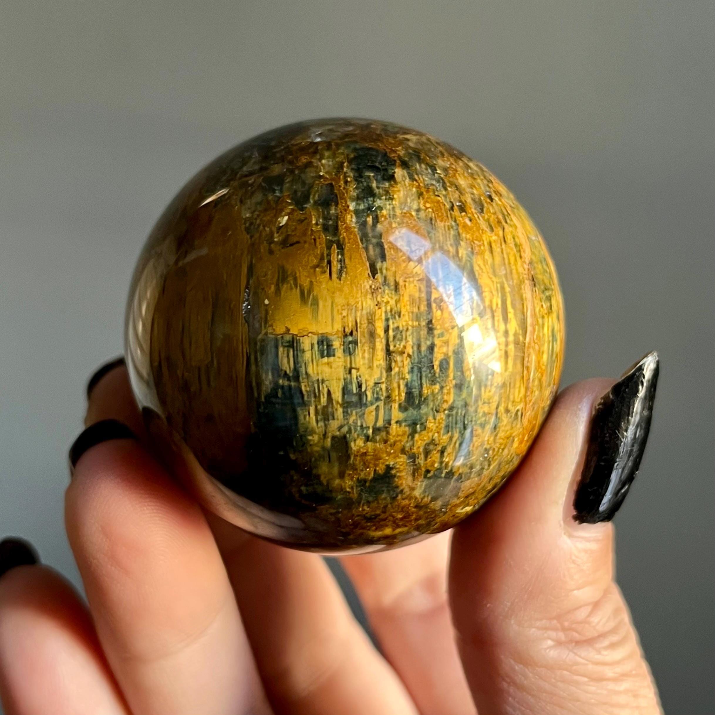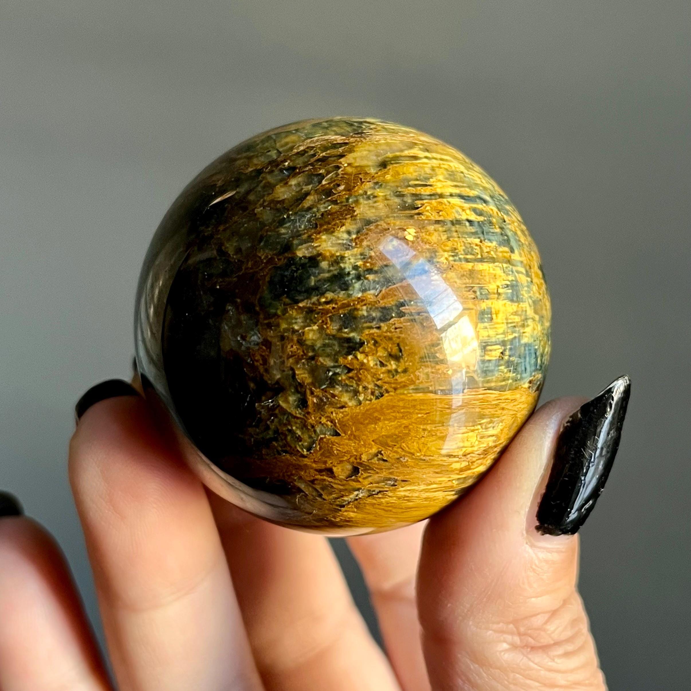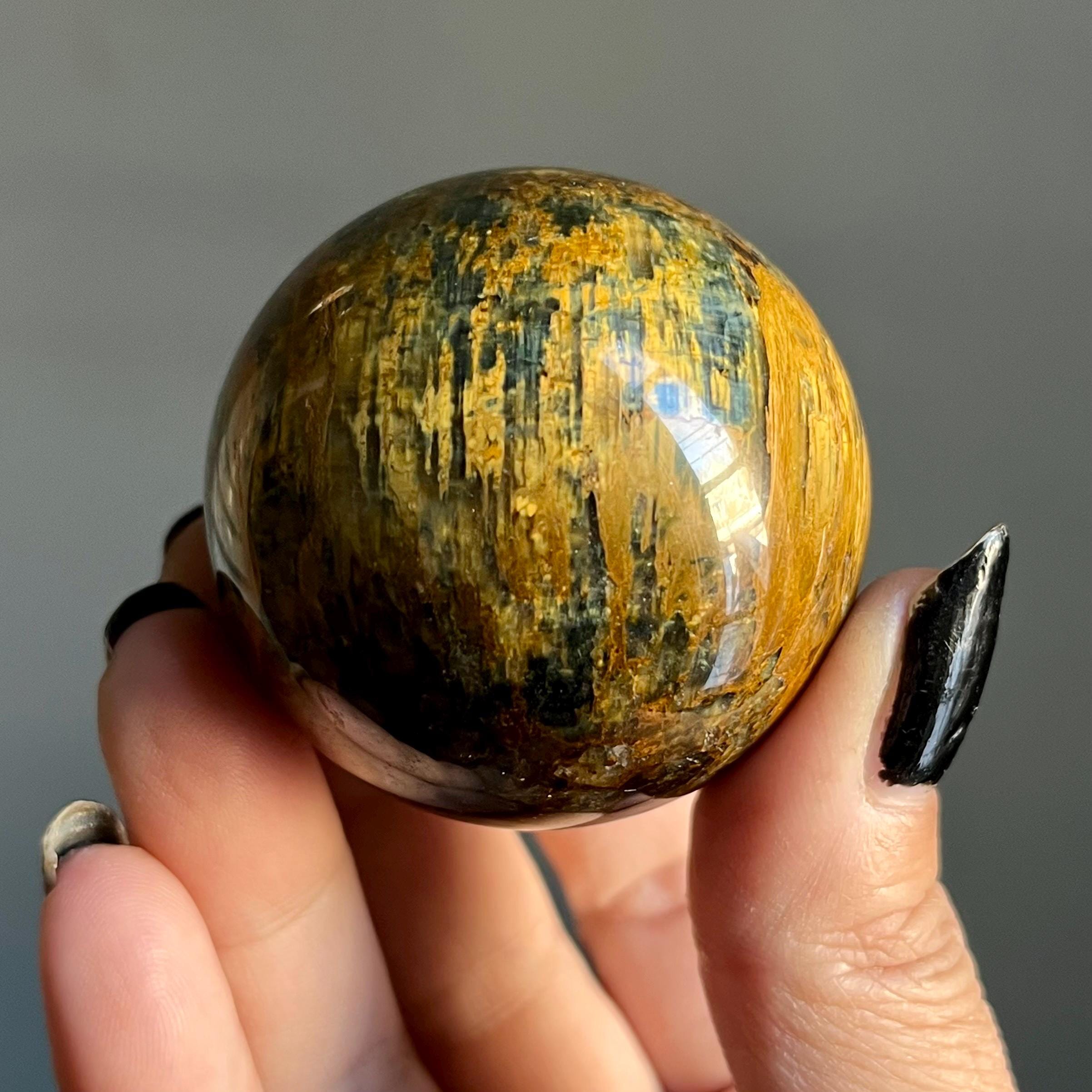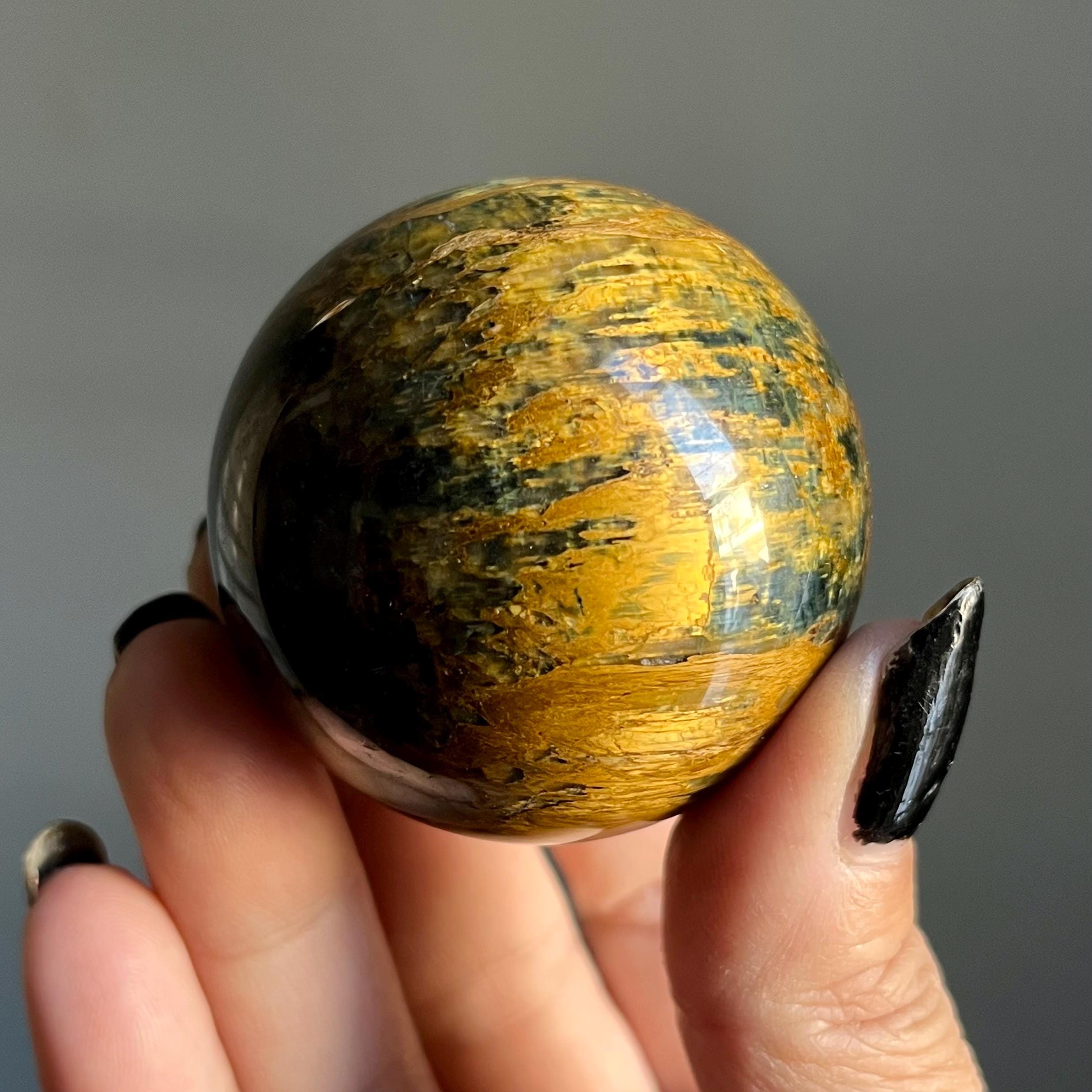 This rare blue pietersite crystal sphere radiates with stunning blue flash and brilliant golden fire, manifesting amidst a sea of varying, swirling shades of blue.