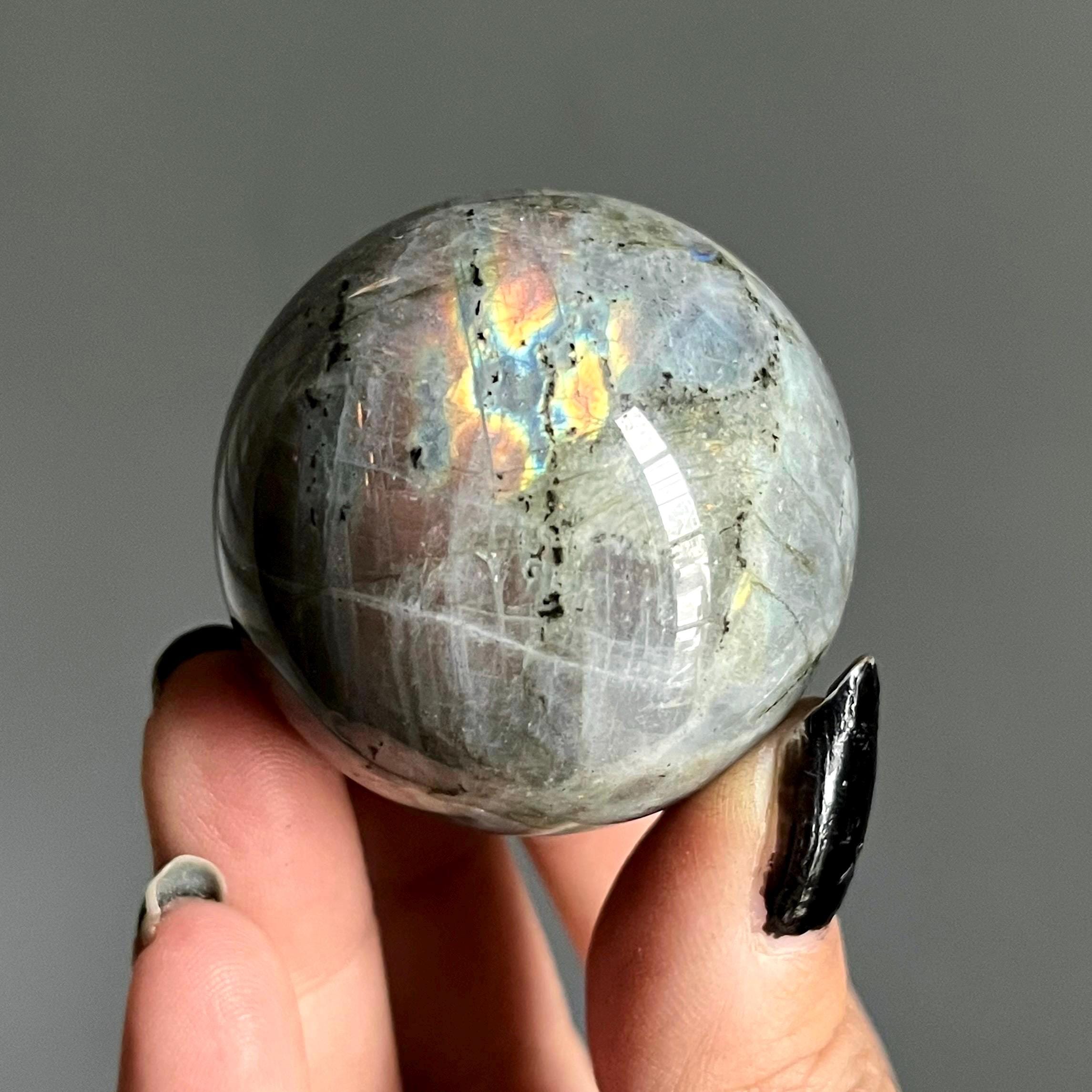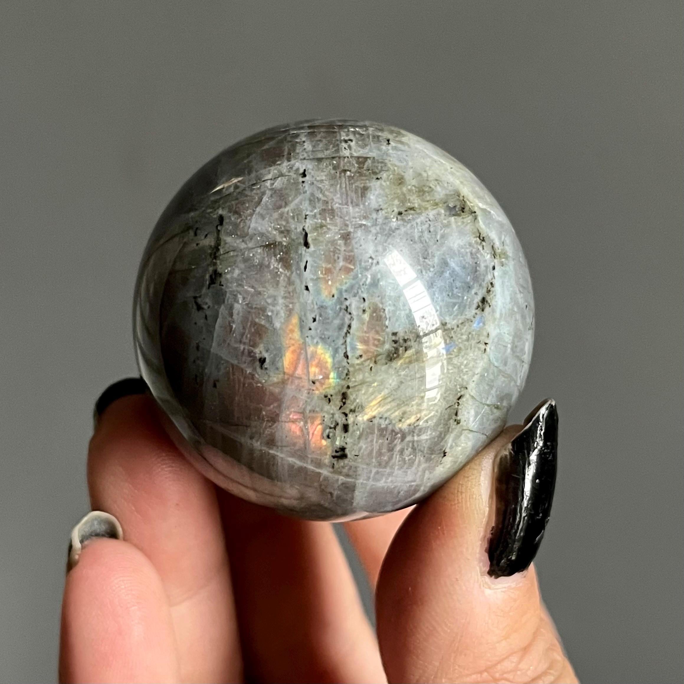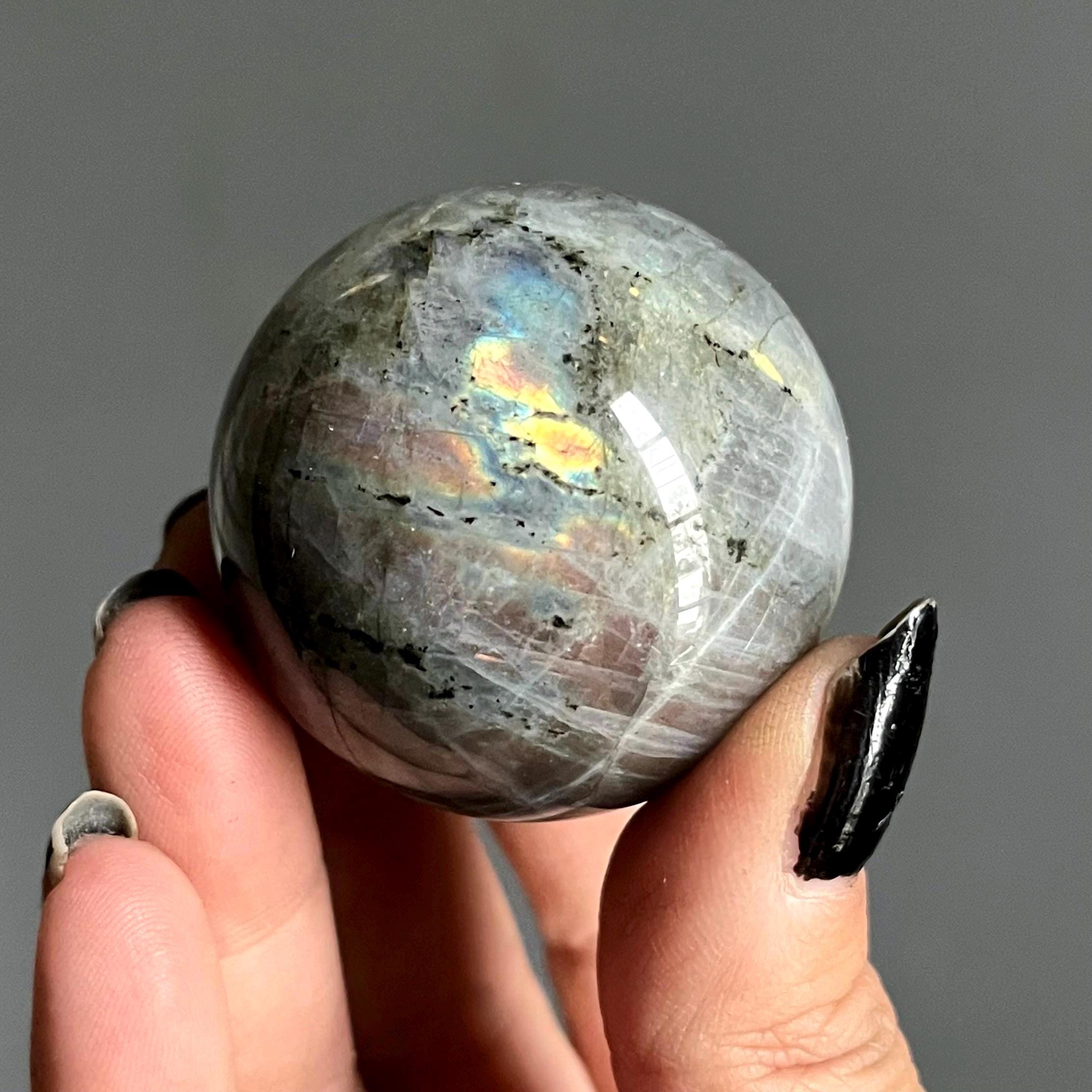 This rare crystal sphere radiates from the inbetween, held in the spaces where rainbow labradorite and moonstone coexist.