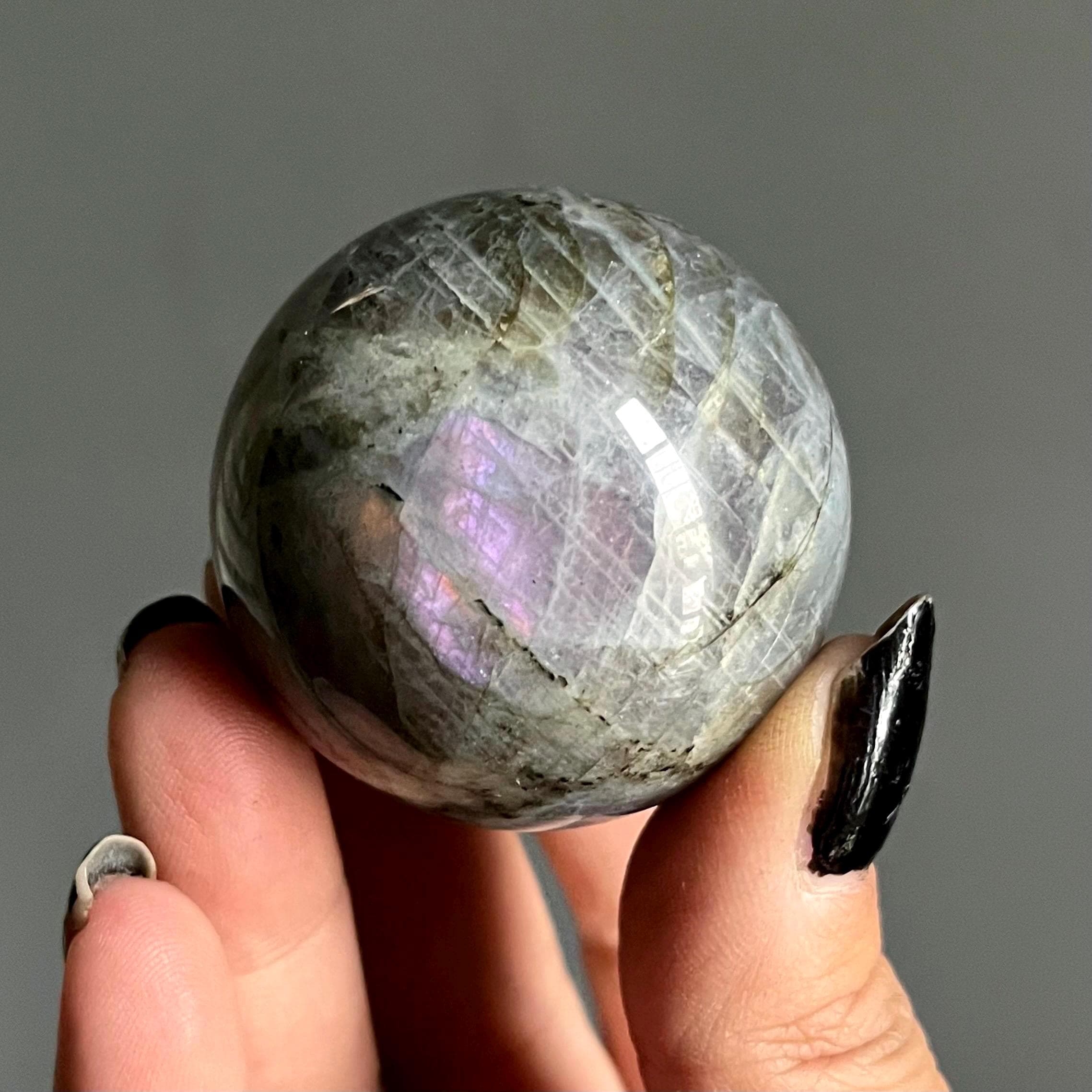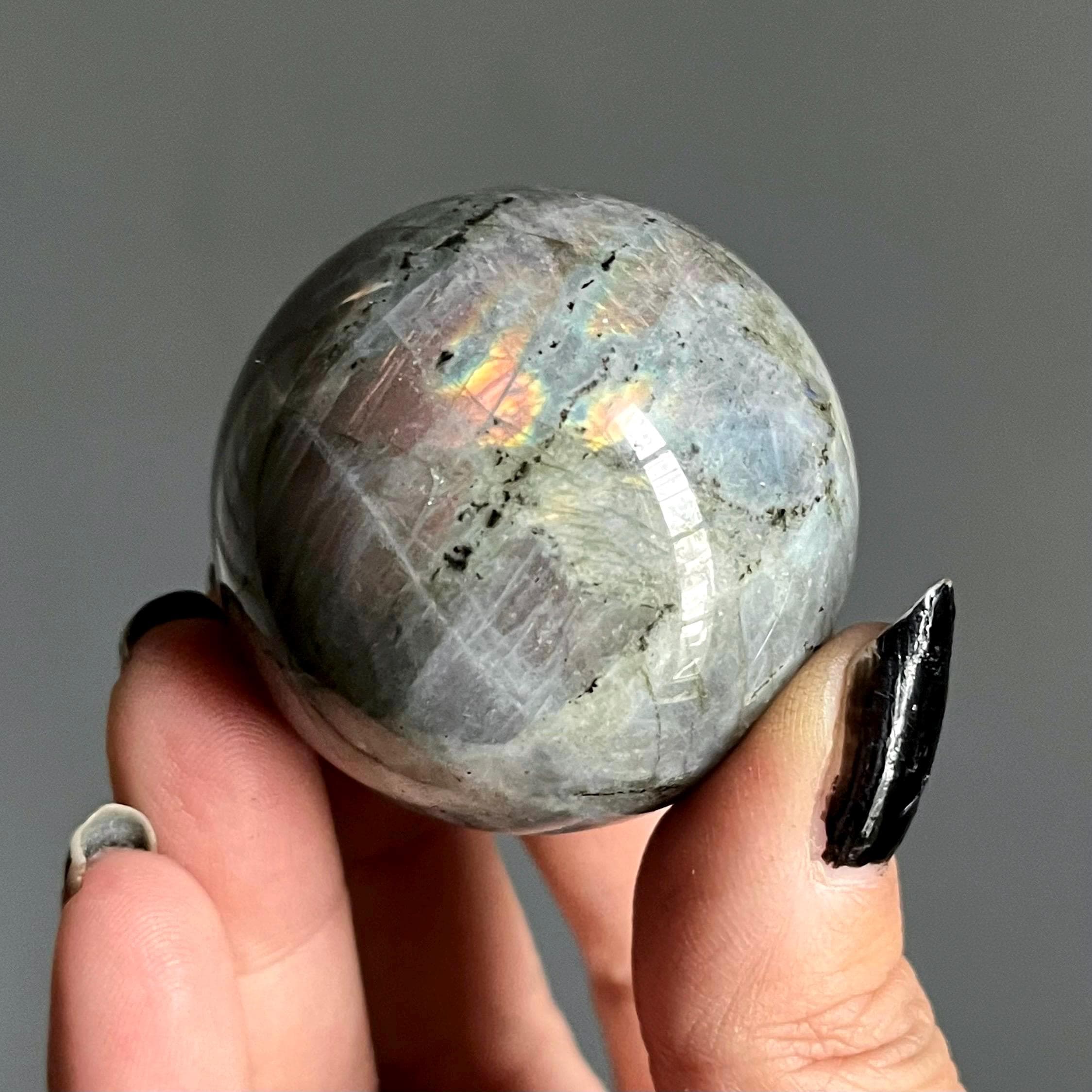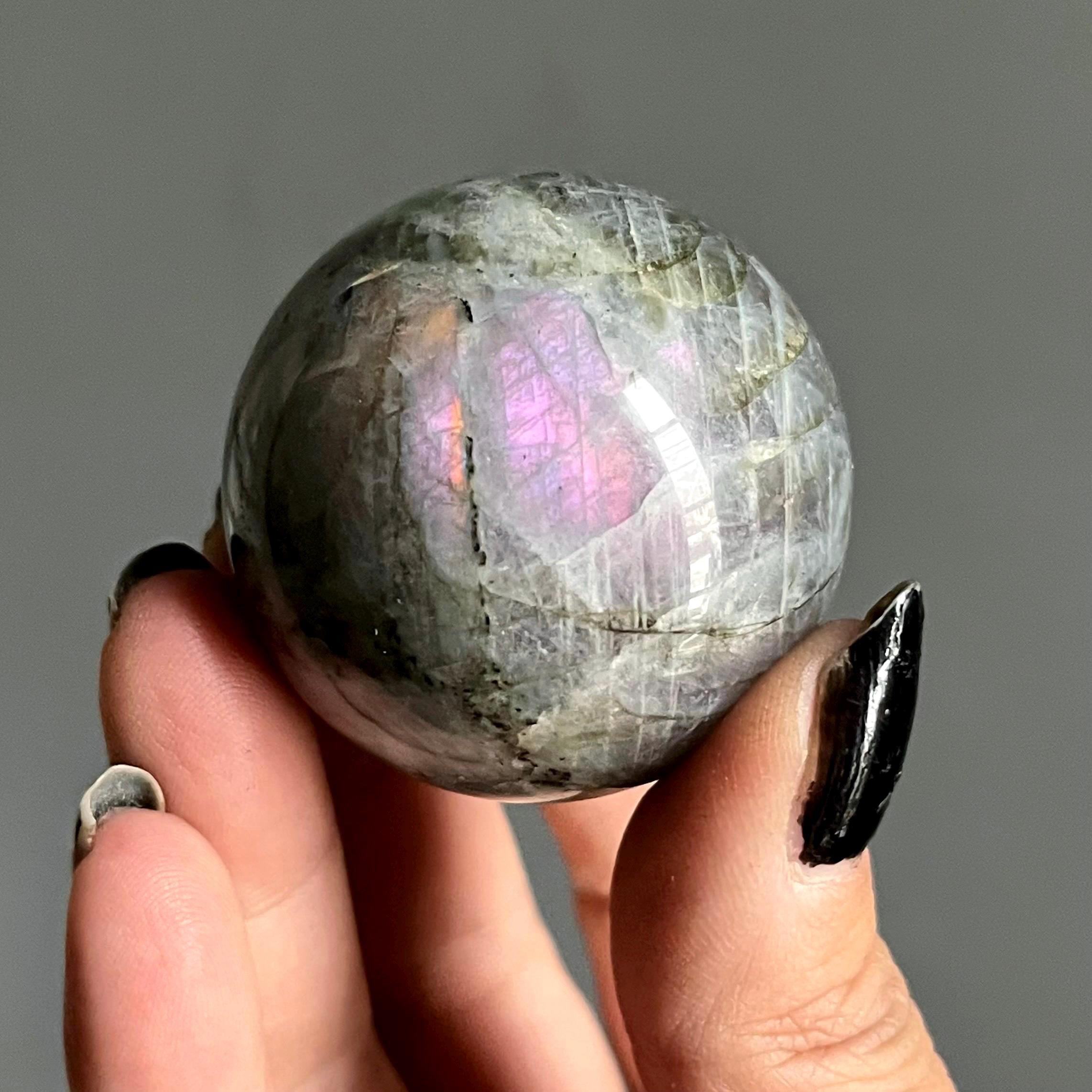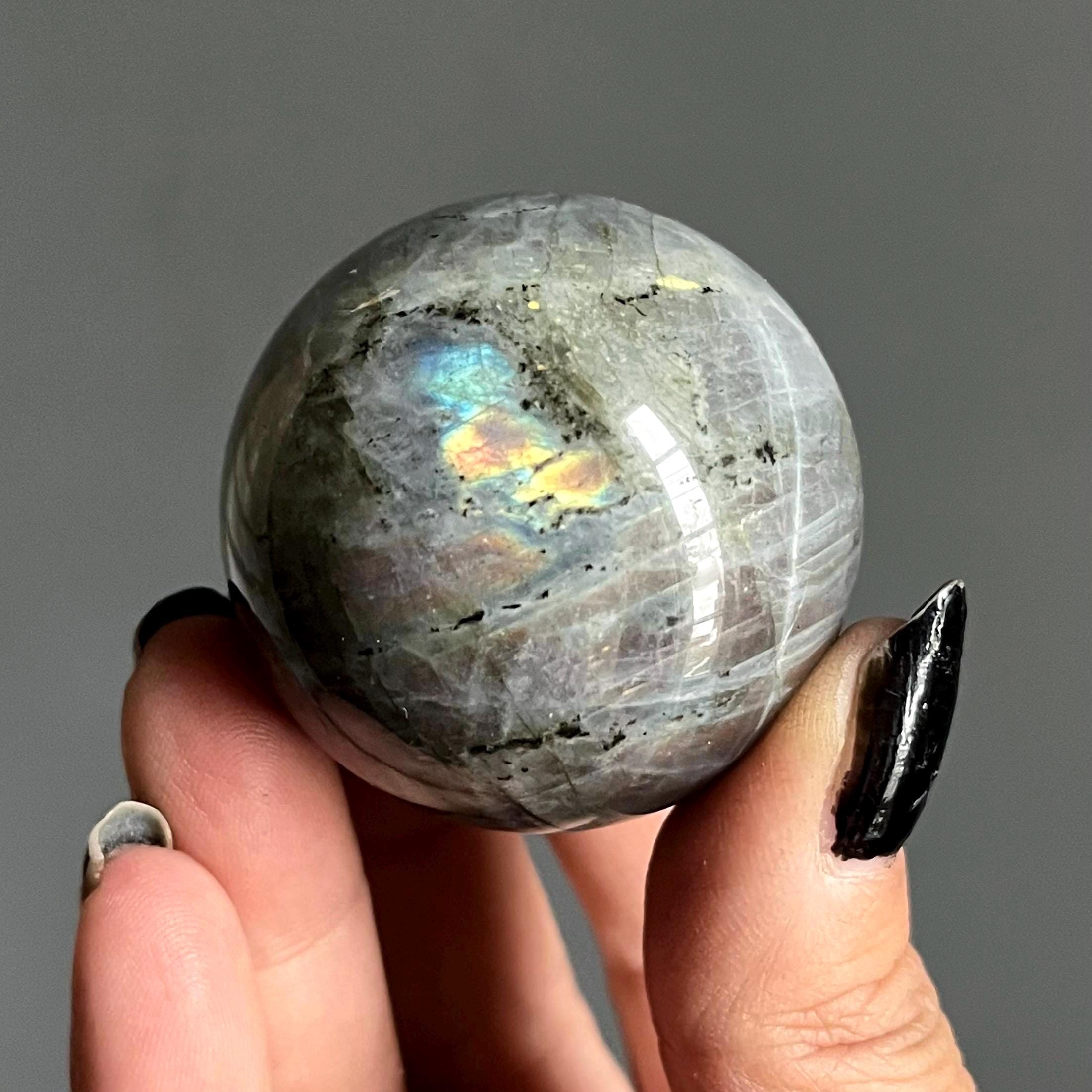 This rare crystal sphere radiates from the inbetween, held in the spaces where rainbow labradorite and moonstone coexist.