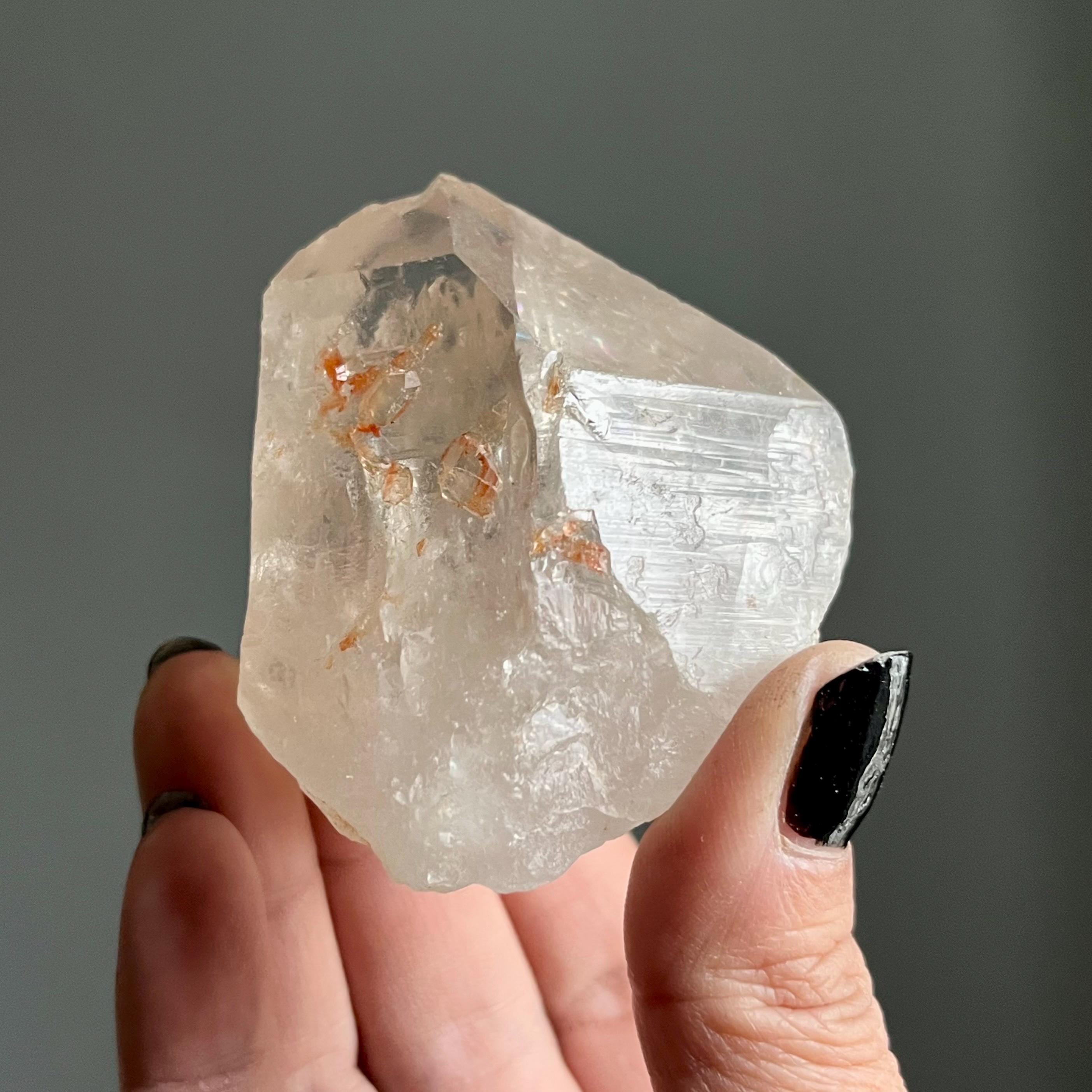 This rare crystal being displays some of the most extraordinary, aesthetic lighting struck inclusions I’ve witinesed, markings raining down from the termination.