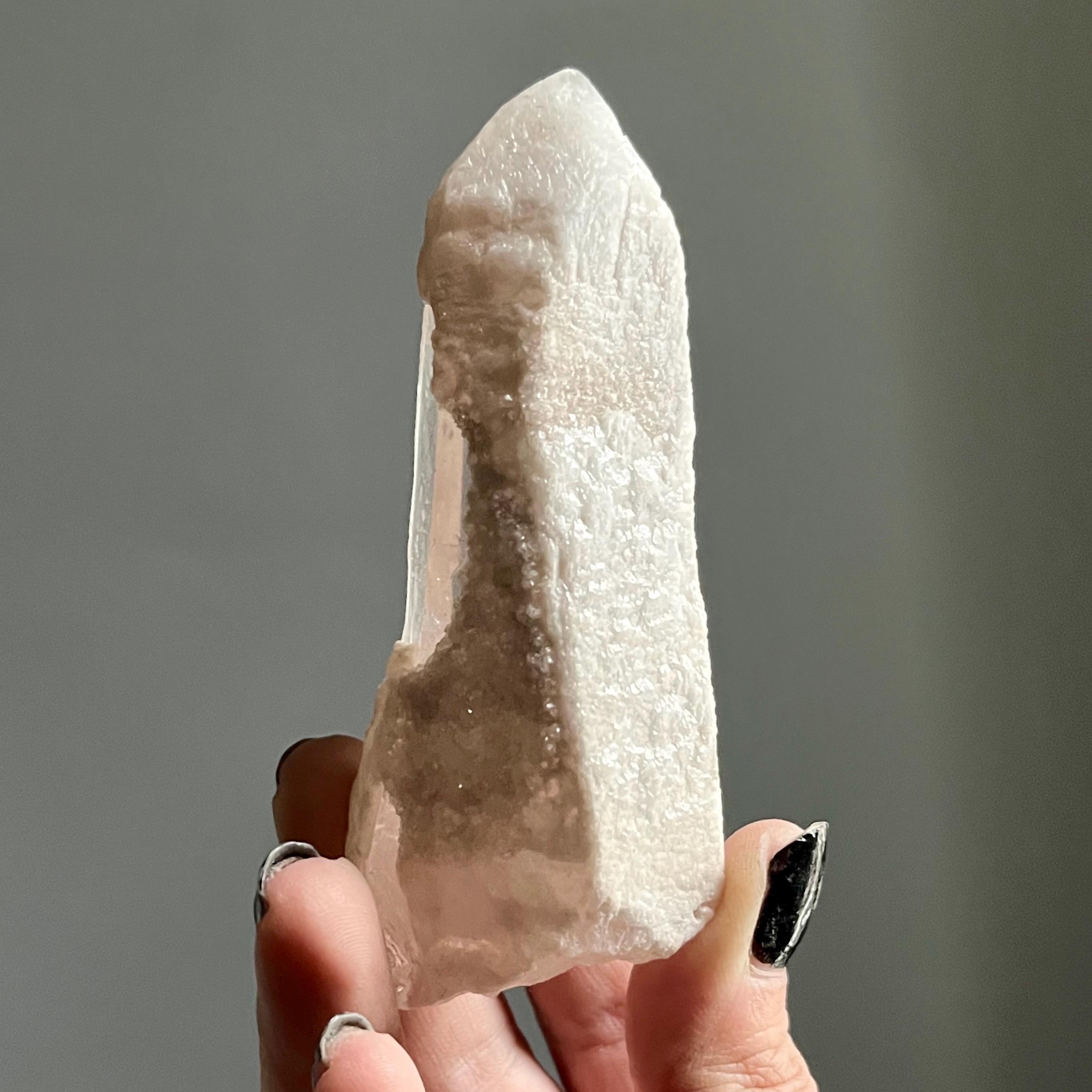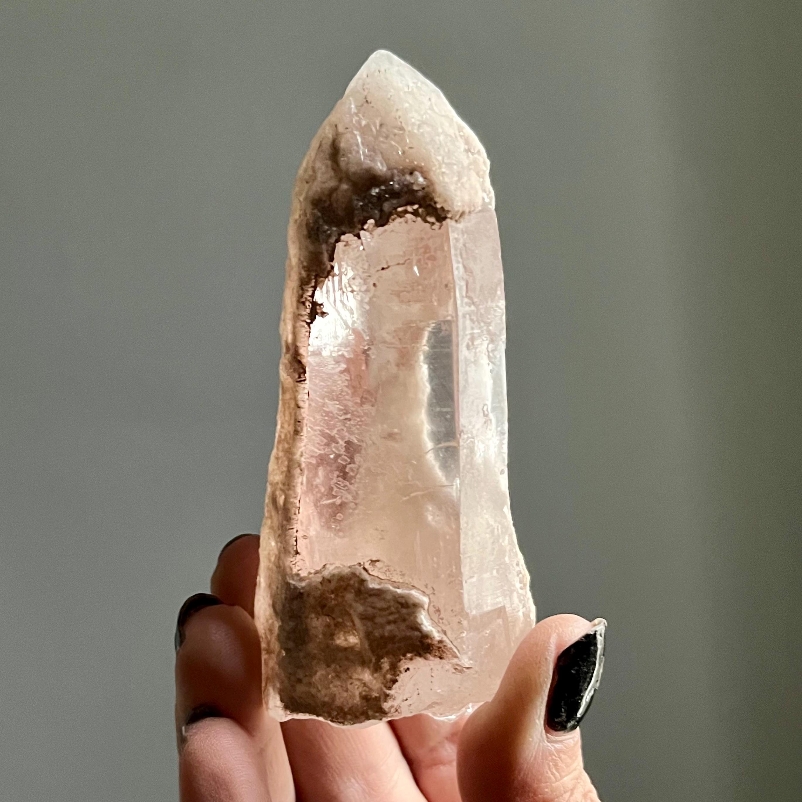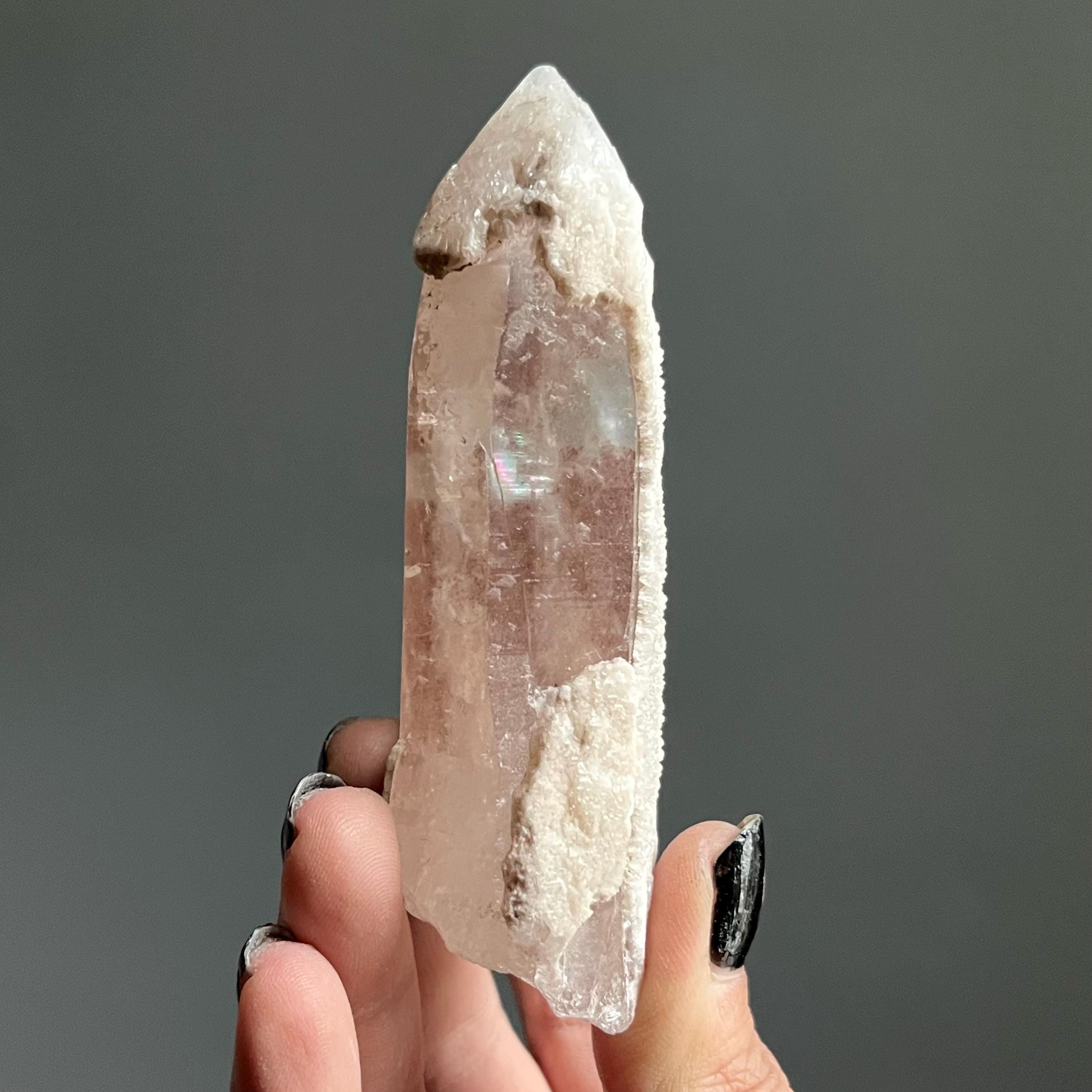 This extraordinary pink lemurian is coated in pink hematite which manifests in varying hues, vascillating from soft pink to deeper shades of mauve.