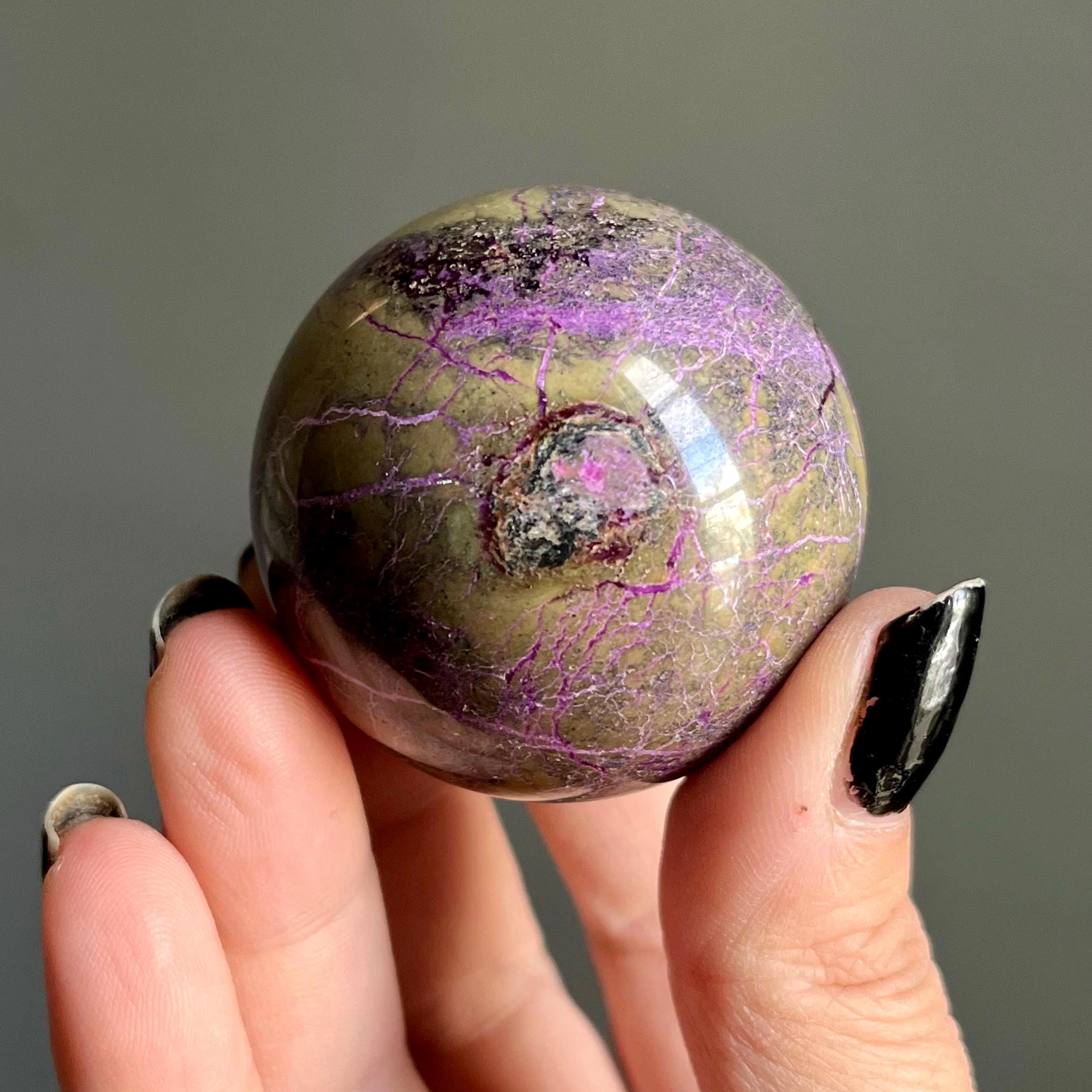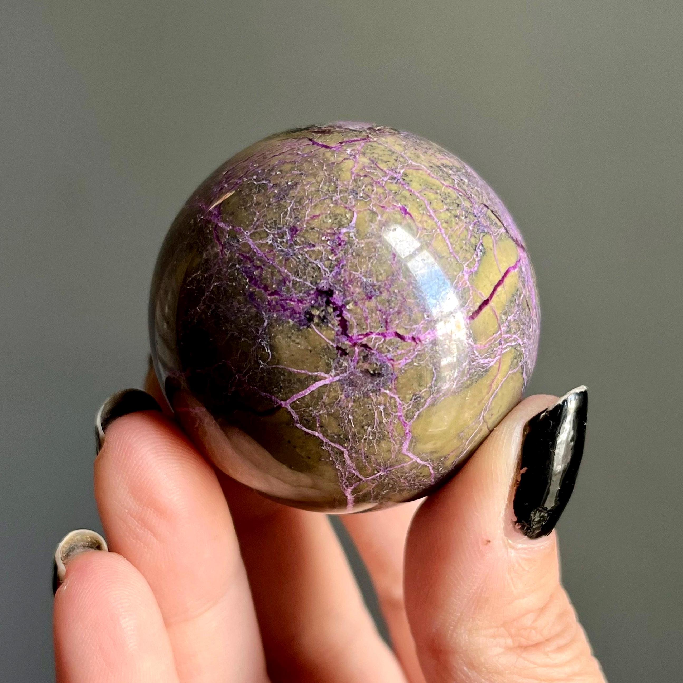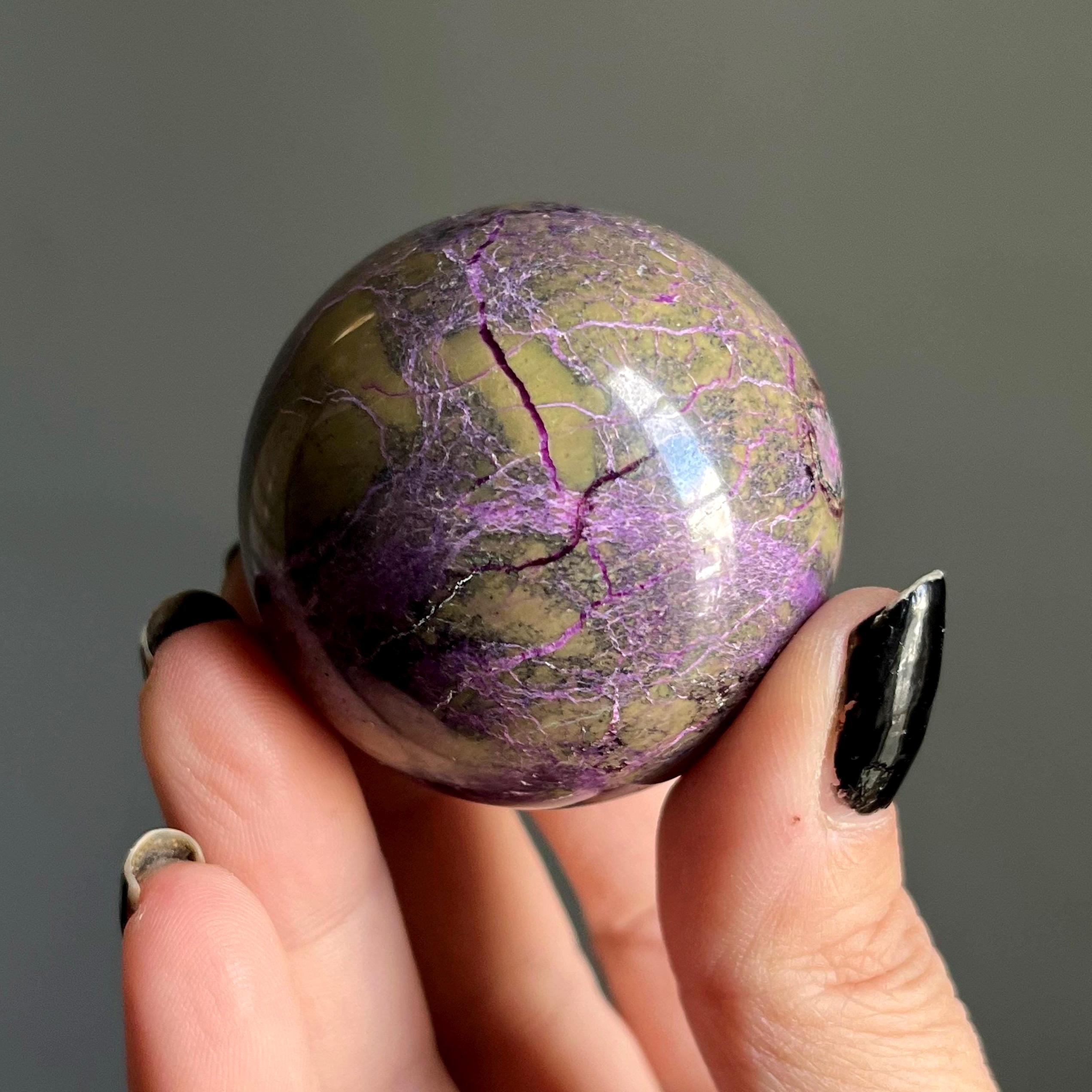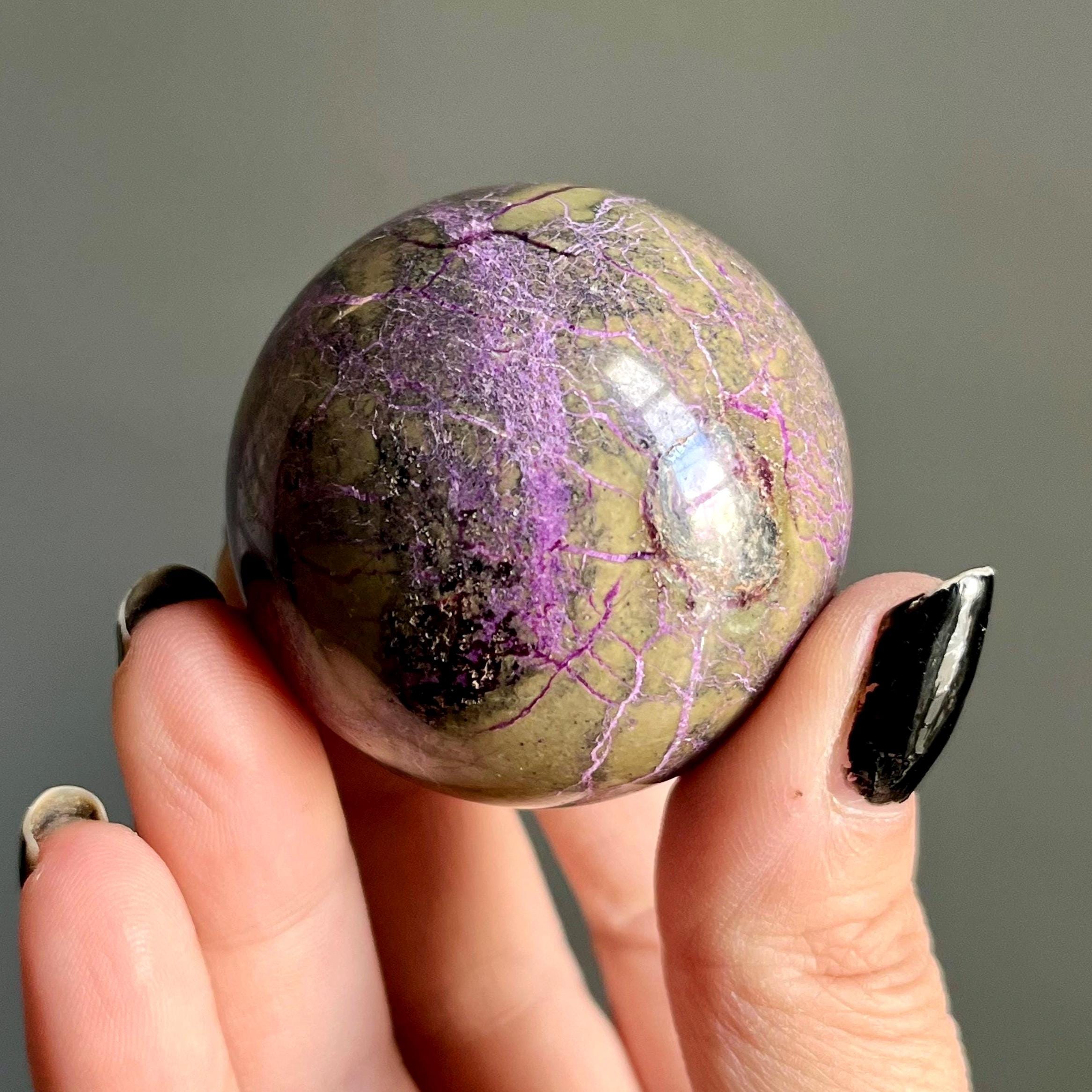 Vibrant metallic purple stichtite branches out around this hand polished stone sphere, a web of radiant purple flash rooting around the rich, mossy green serpentine.