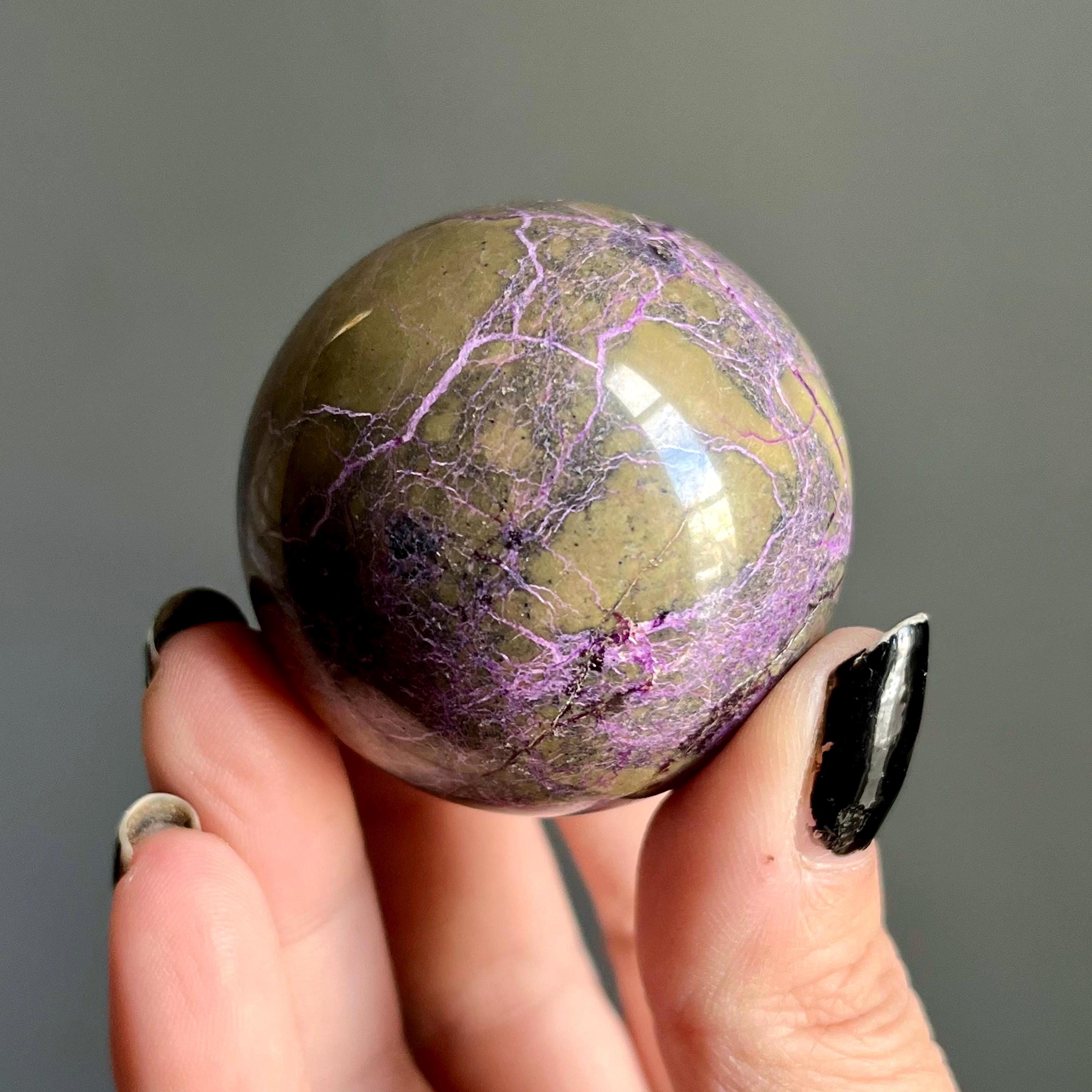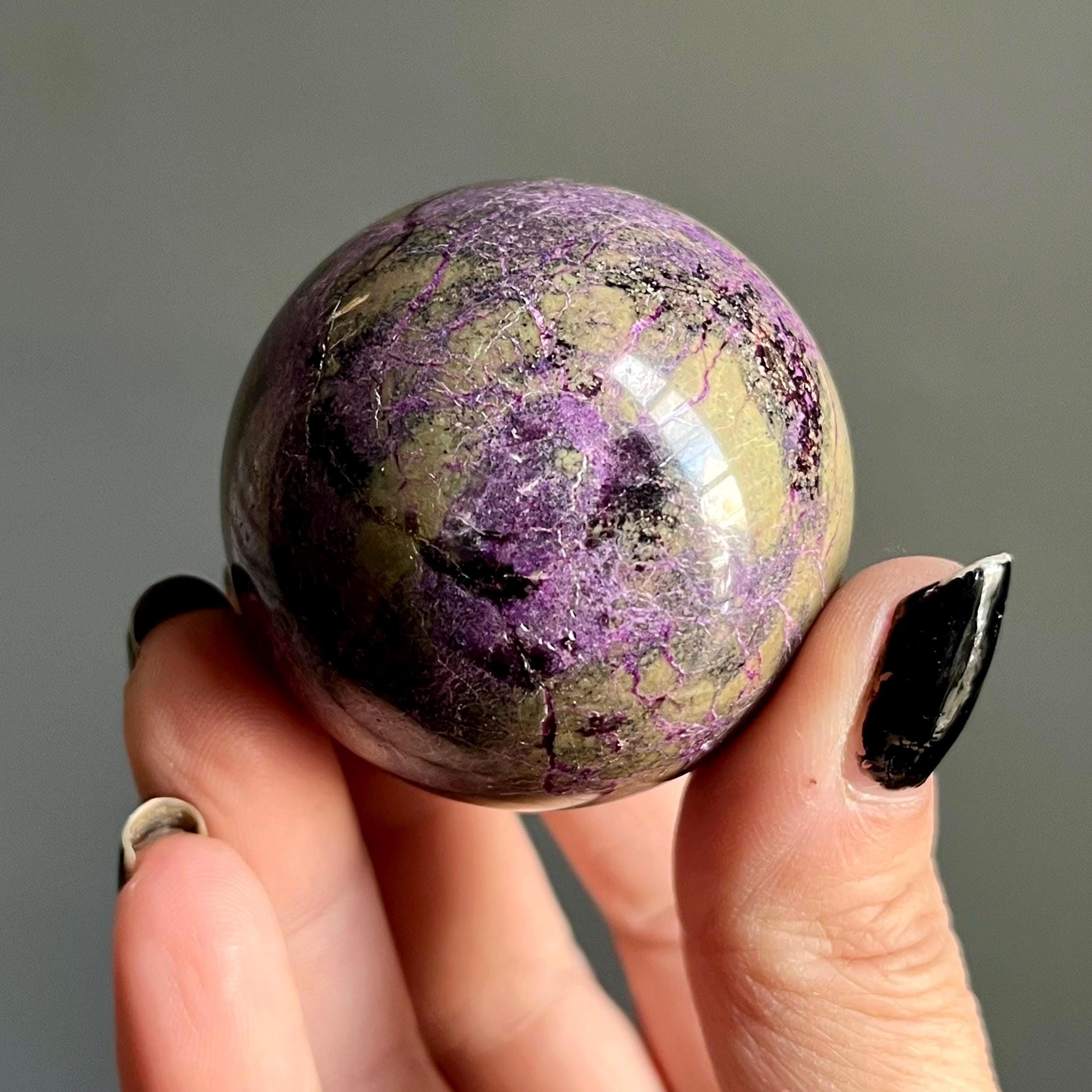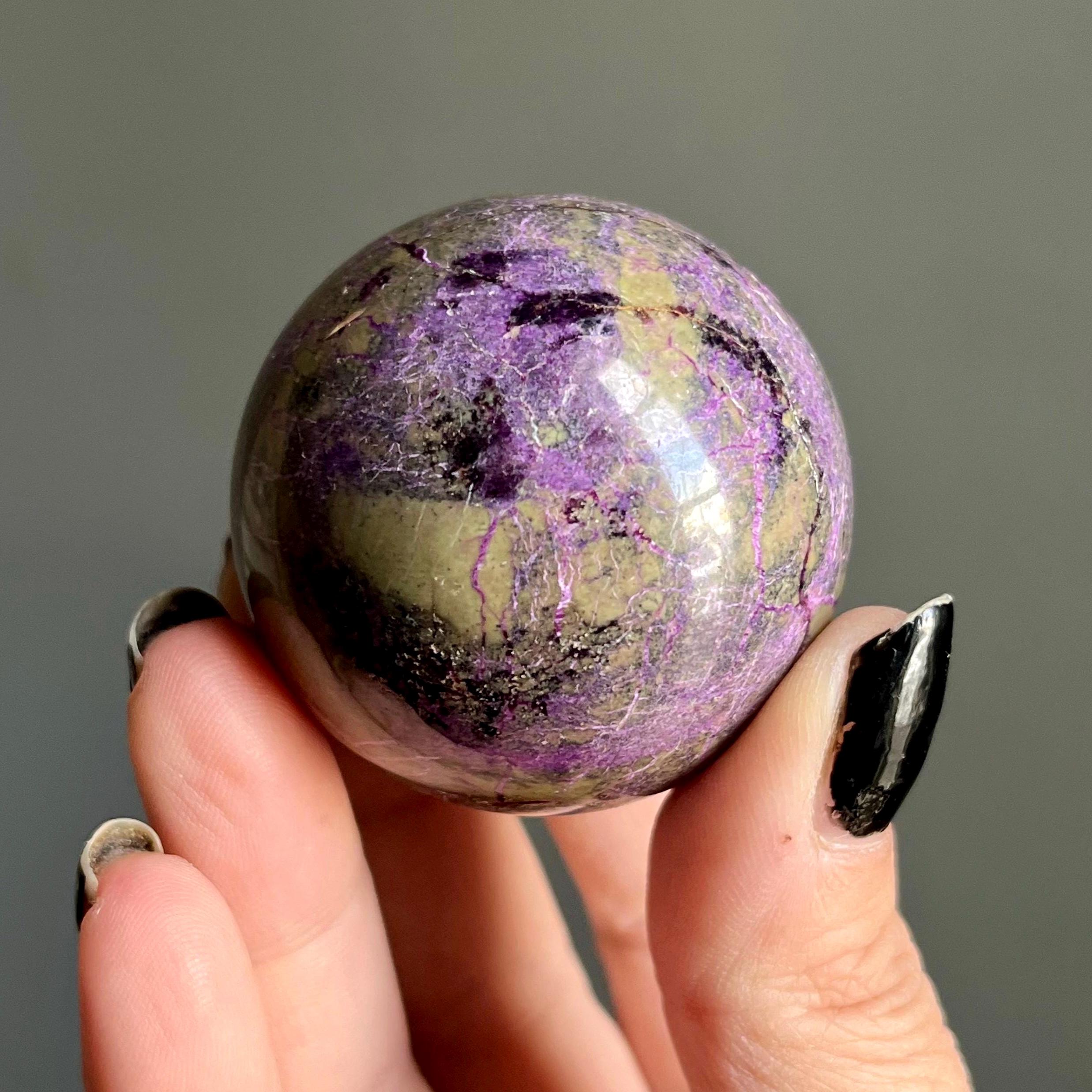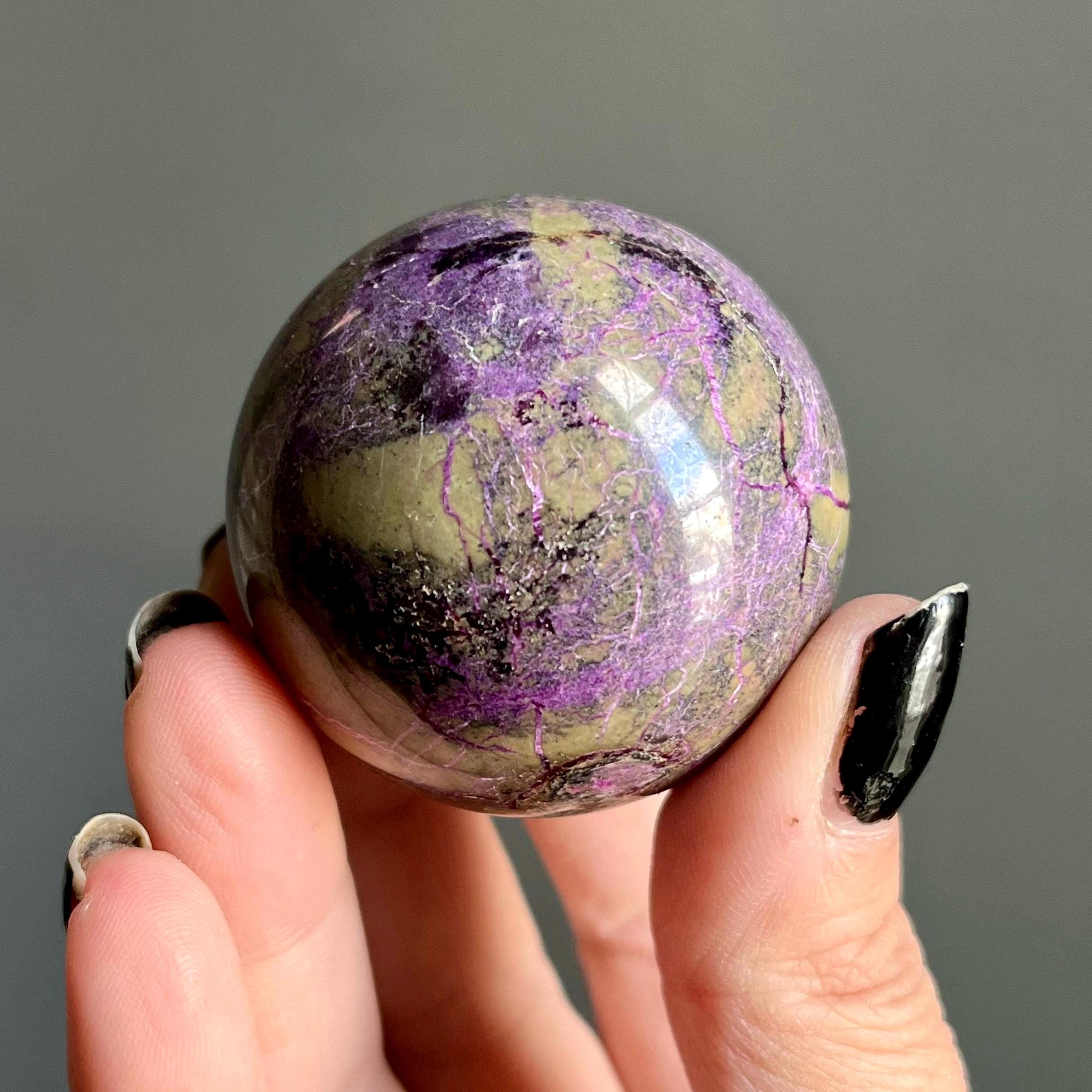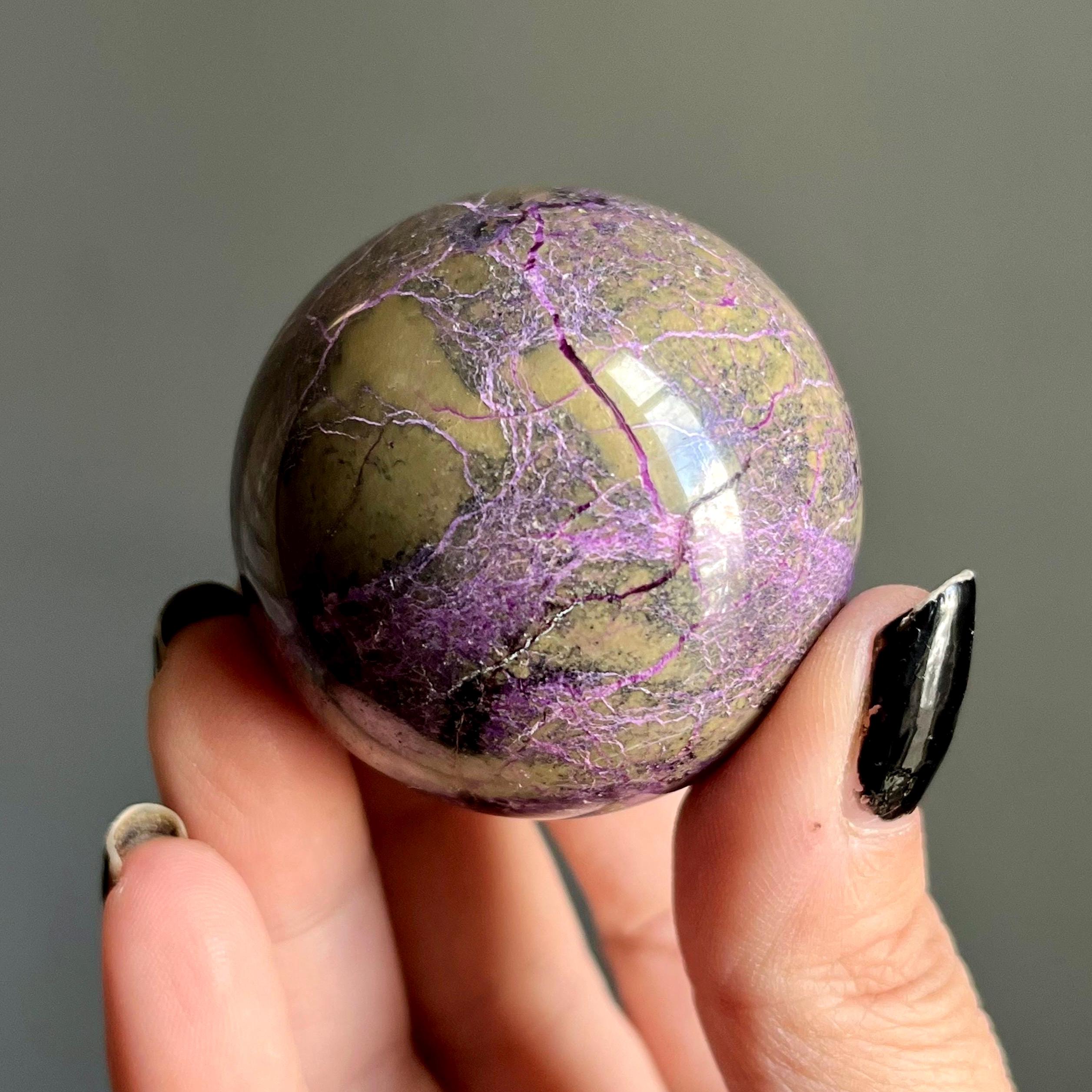 Vibrant metallic purple stichtite branches out around this hand polished stone sphere, a web of radiant purple flash rooting around the rich, mossy green serpentine.