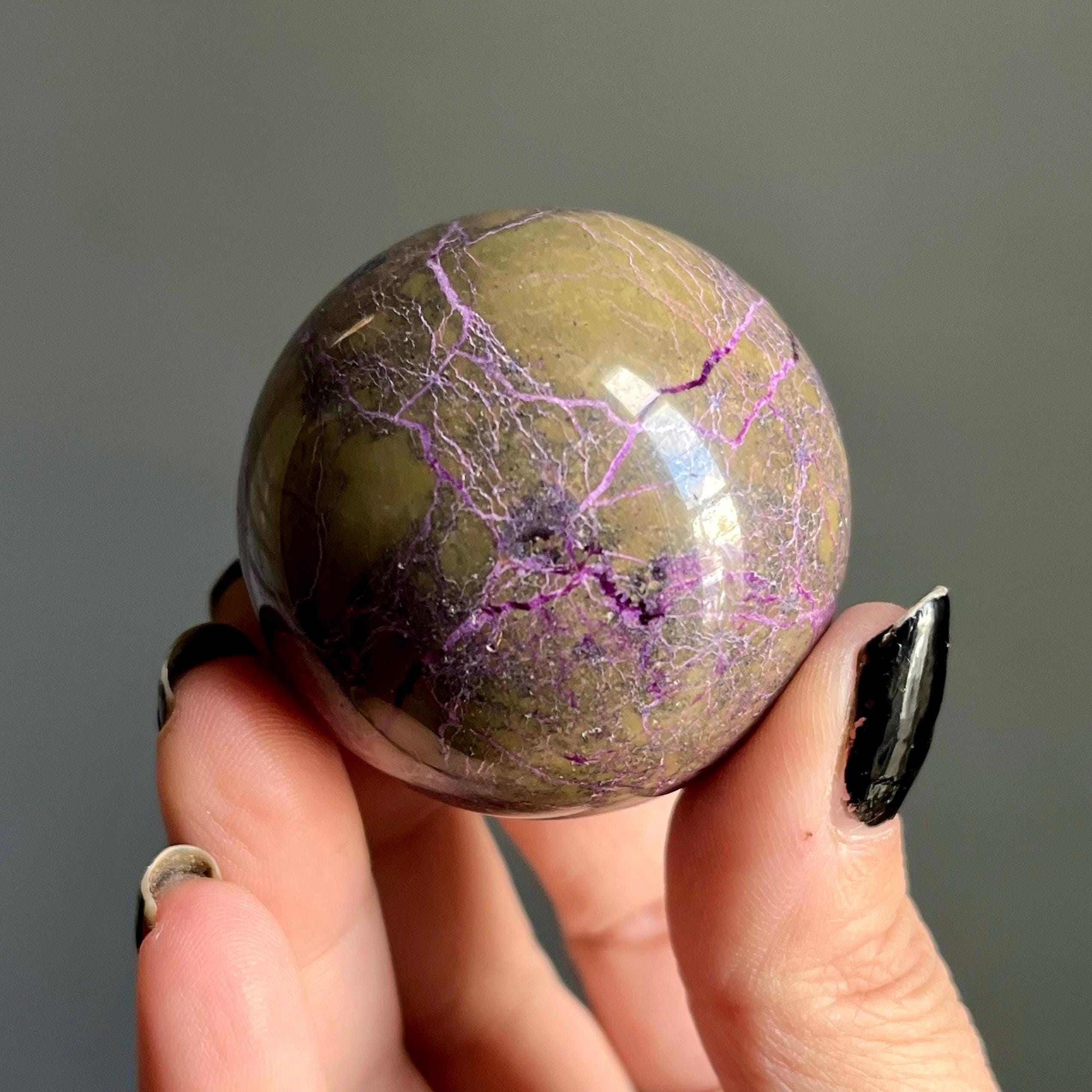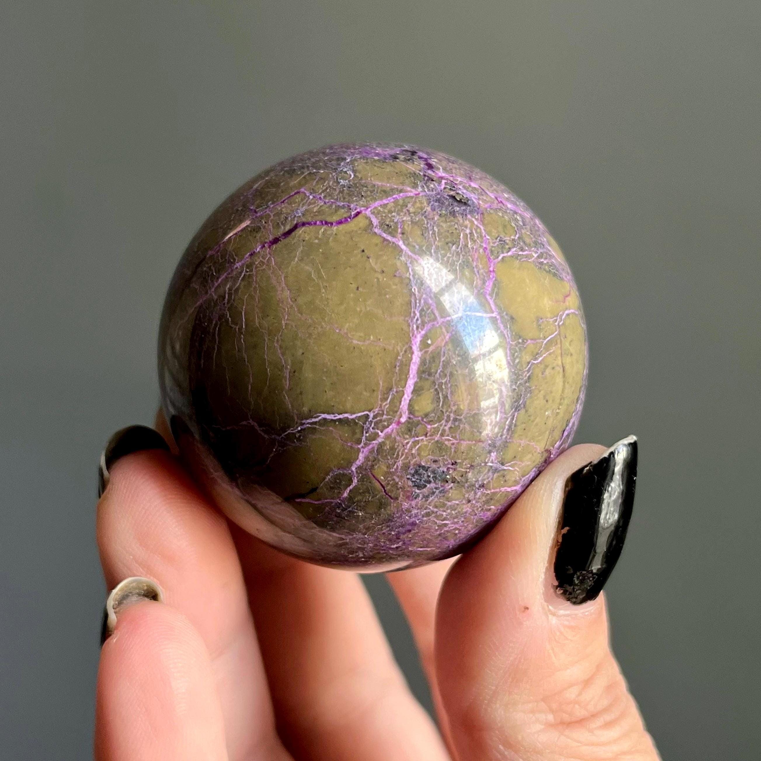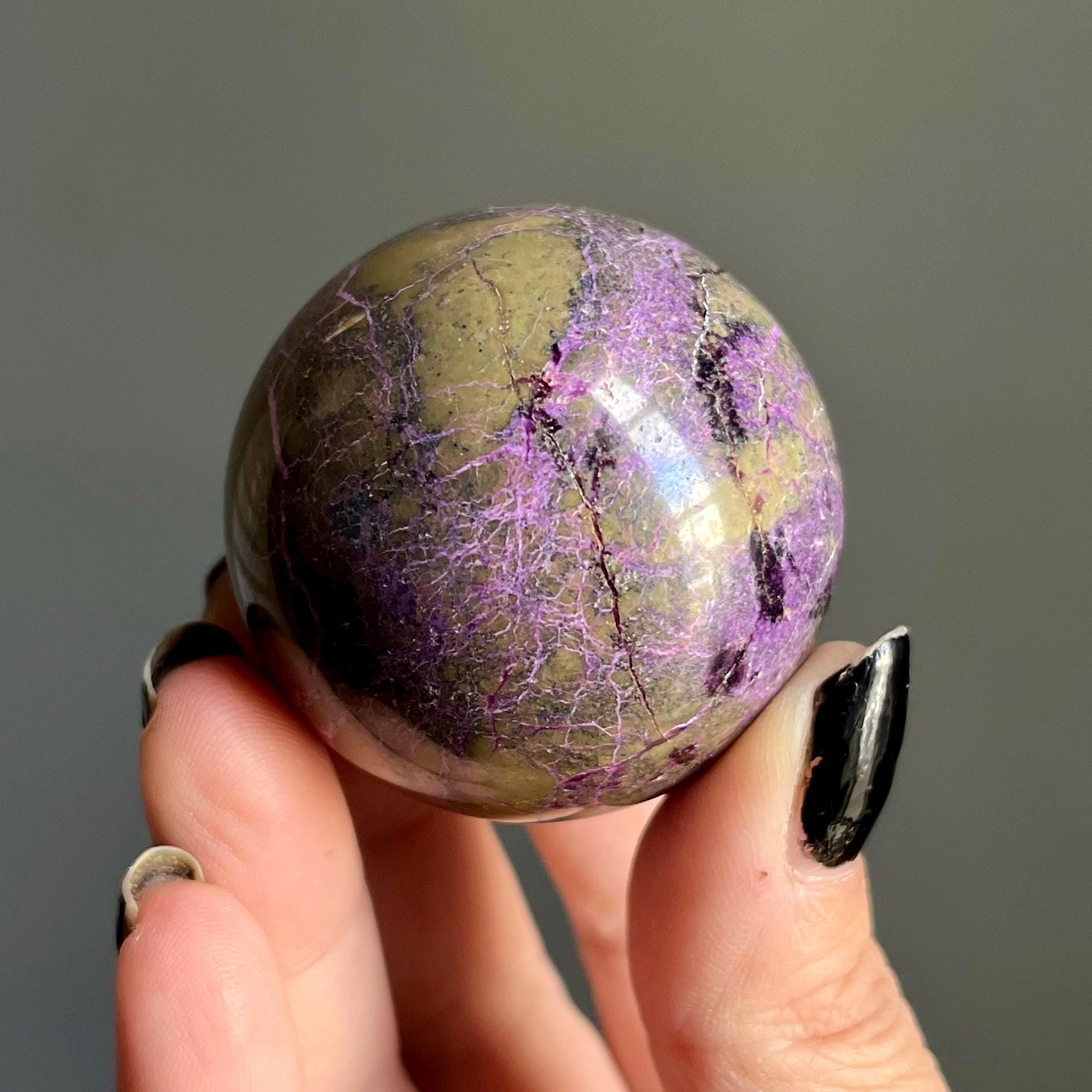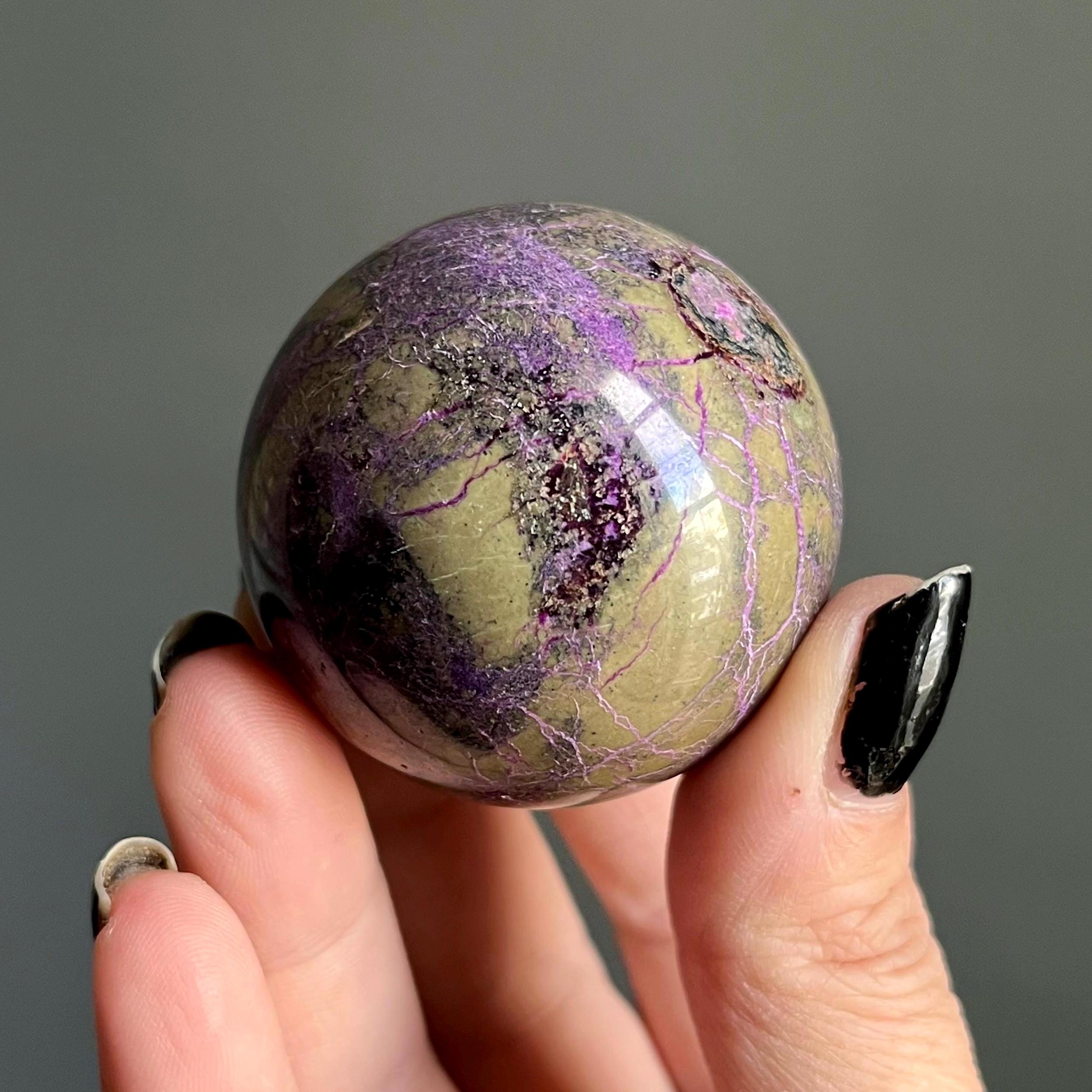 Vibrant metallic purple stichtite branches out around this hand polished stone sphere, a web of radiant purple flash rooting around the rich, mossy green serpentine.