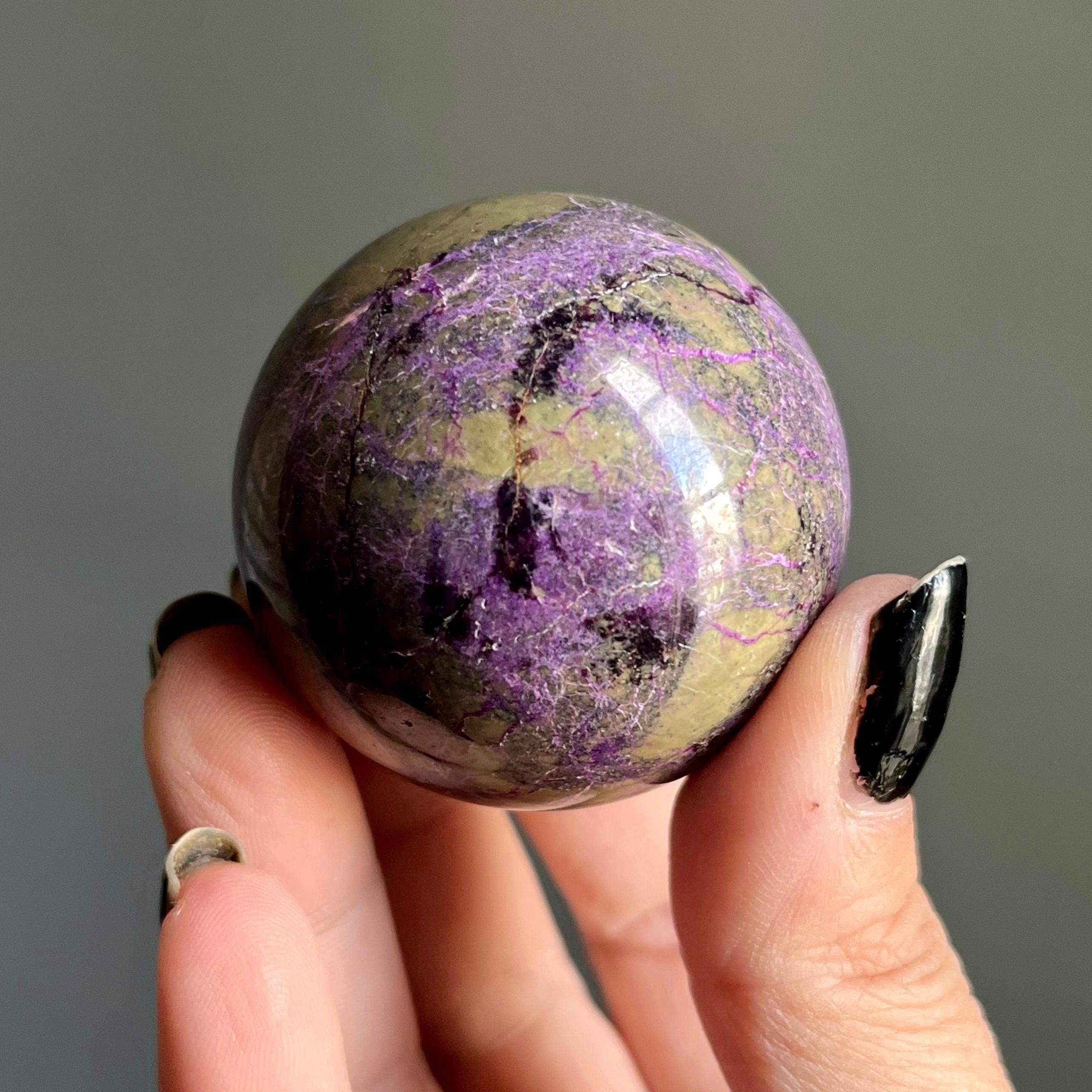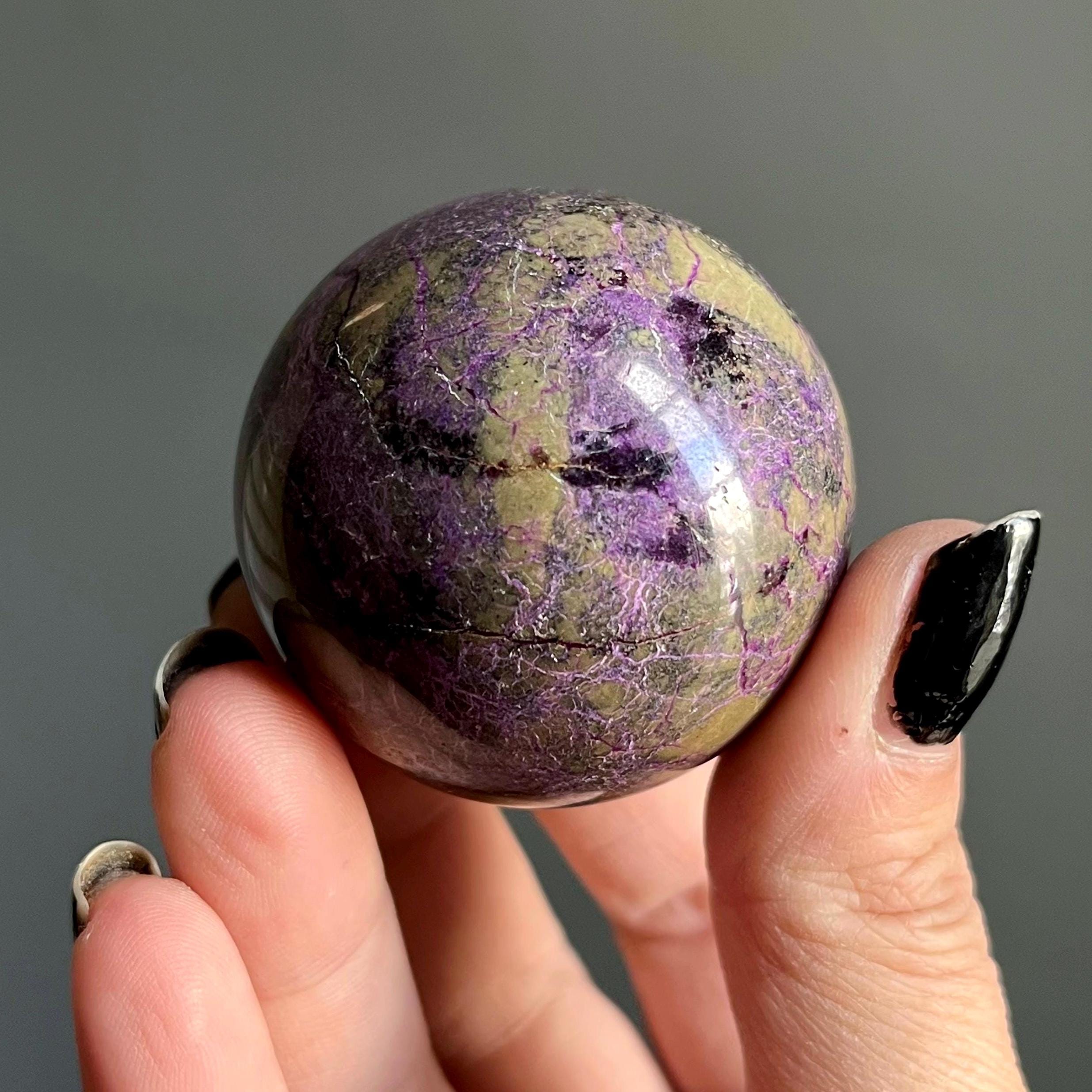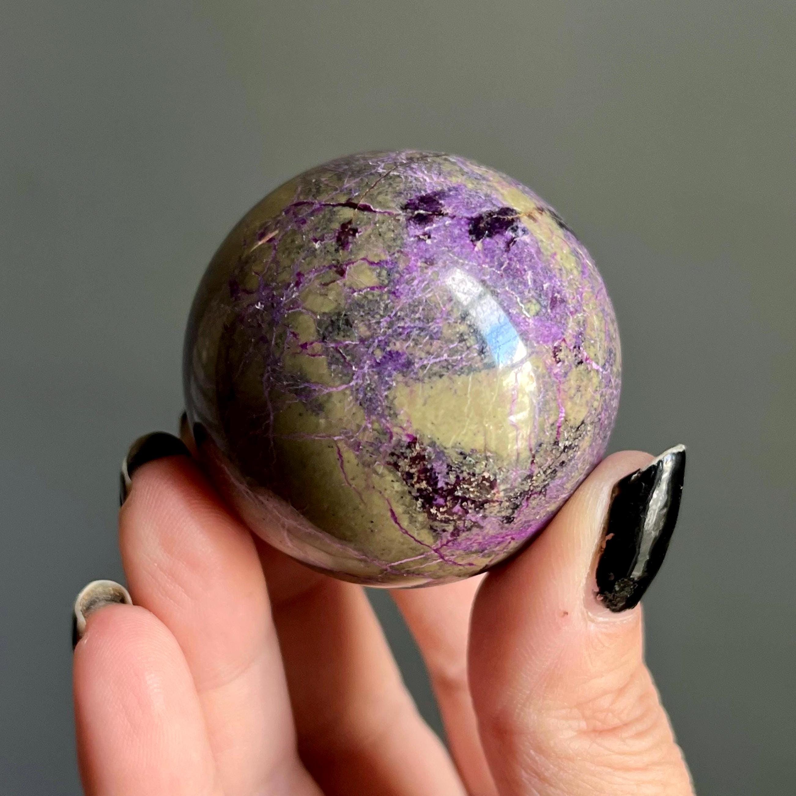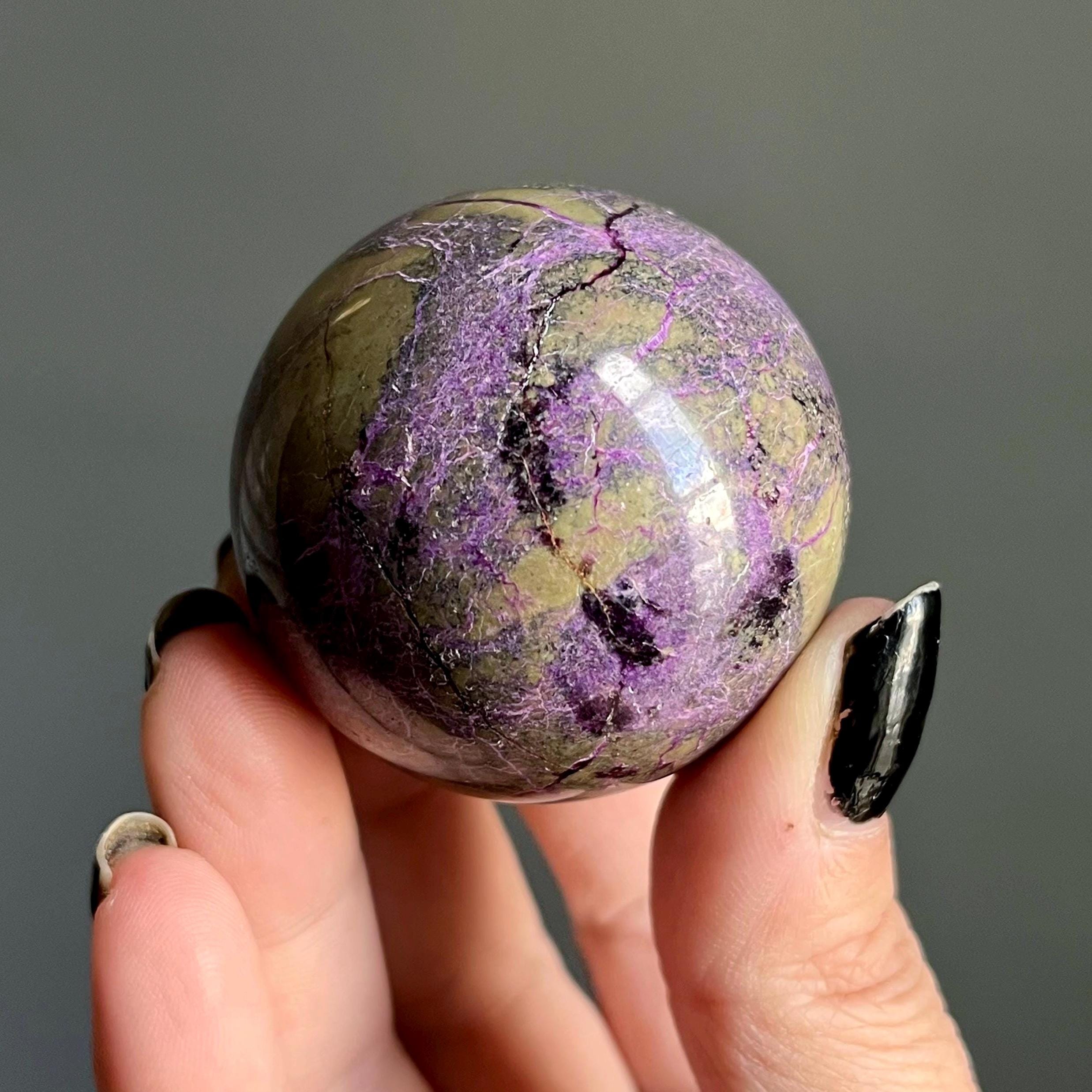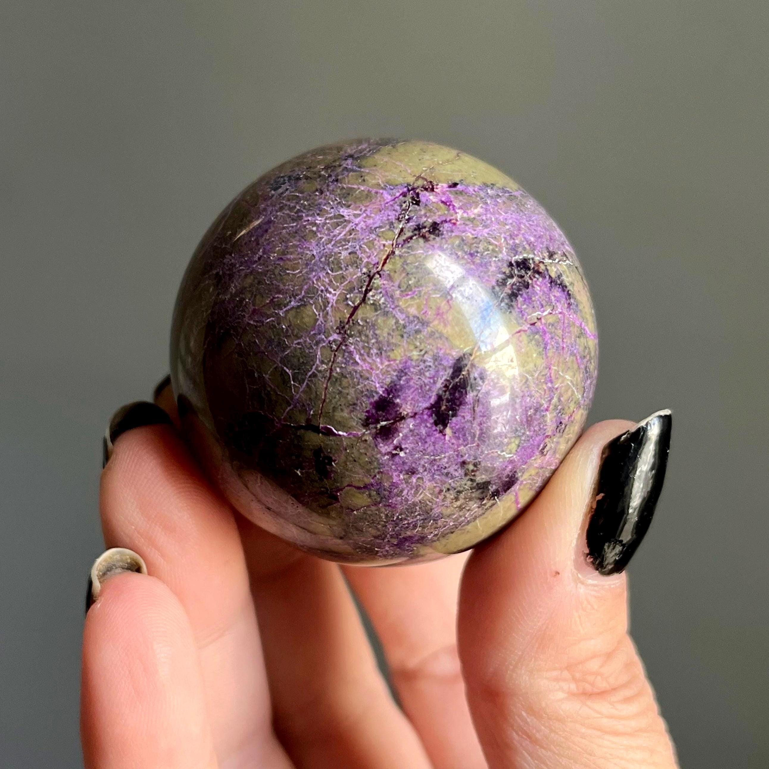 This extraordinary atlantisite crystal sphere alchemizes radiant purple stitchite and shimmering green serpentine with ribbons of rare, deep purple kammererite woven through the piece.
