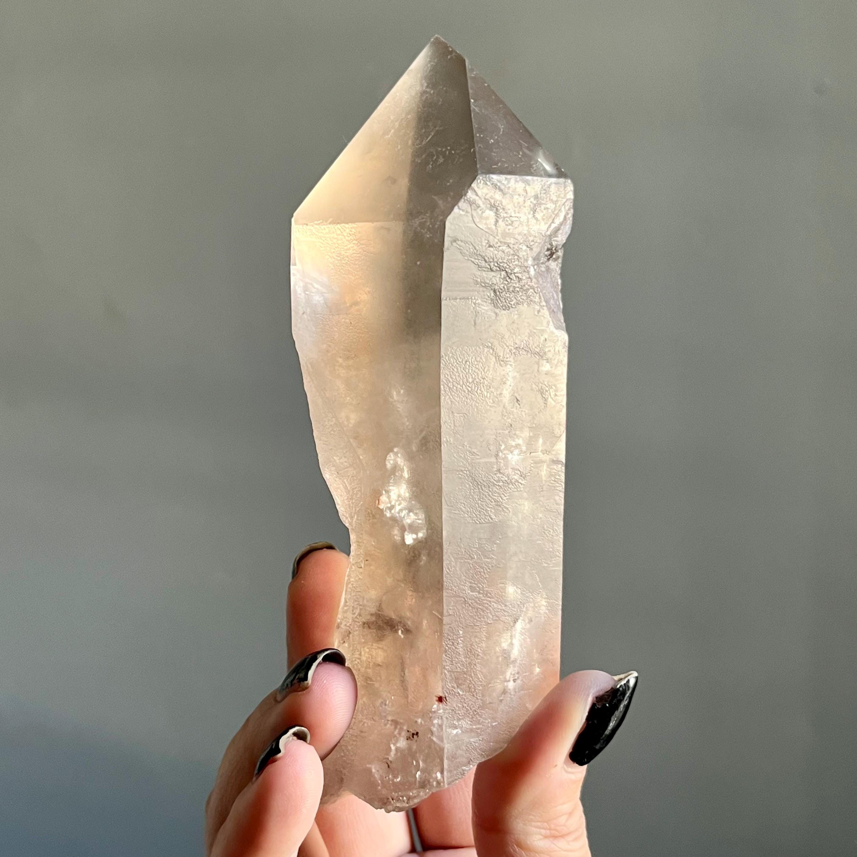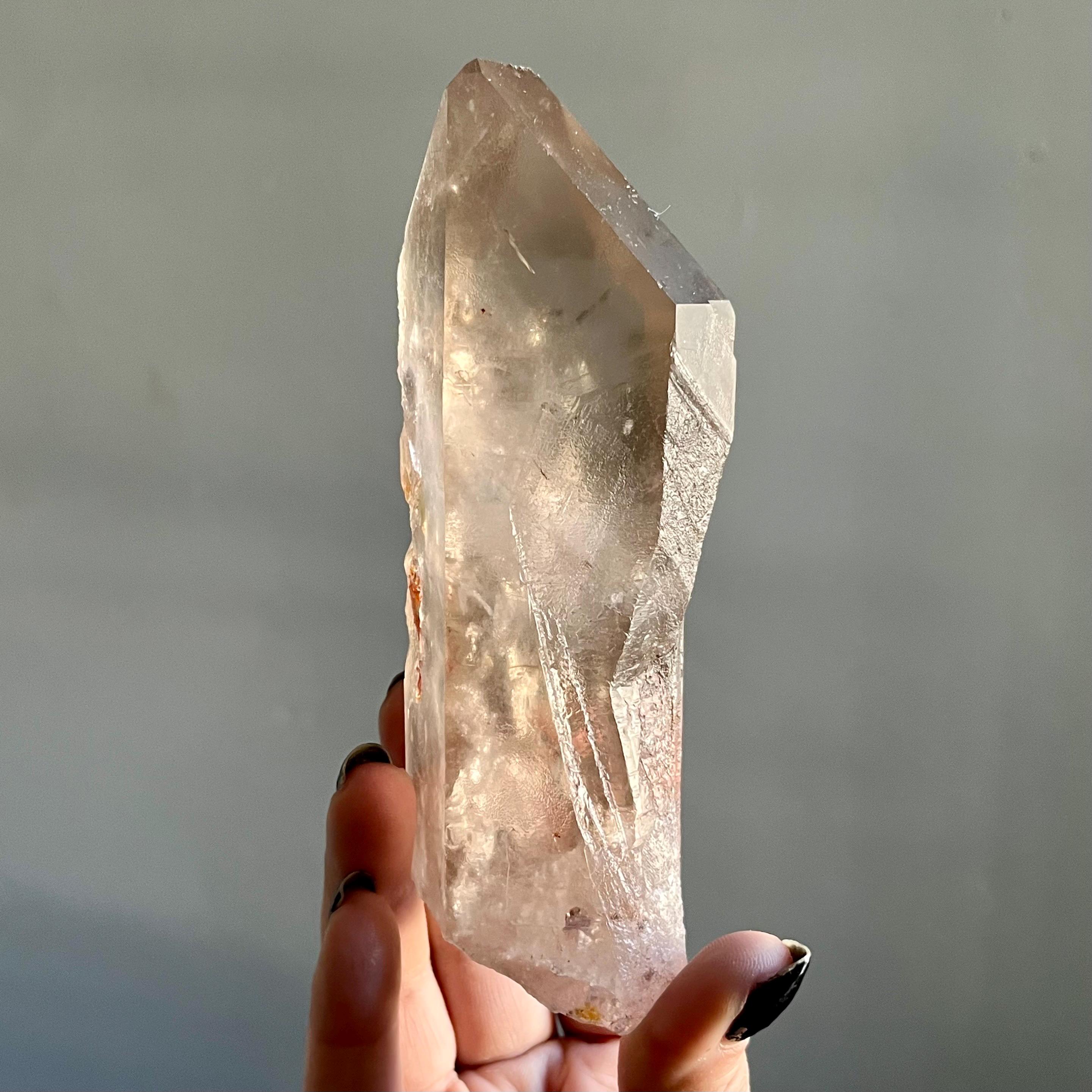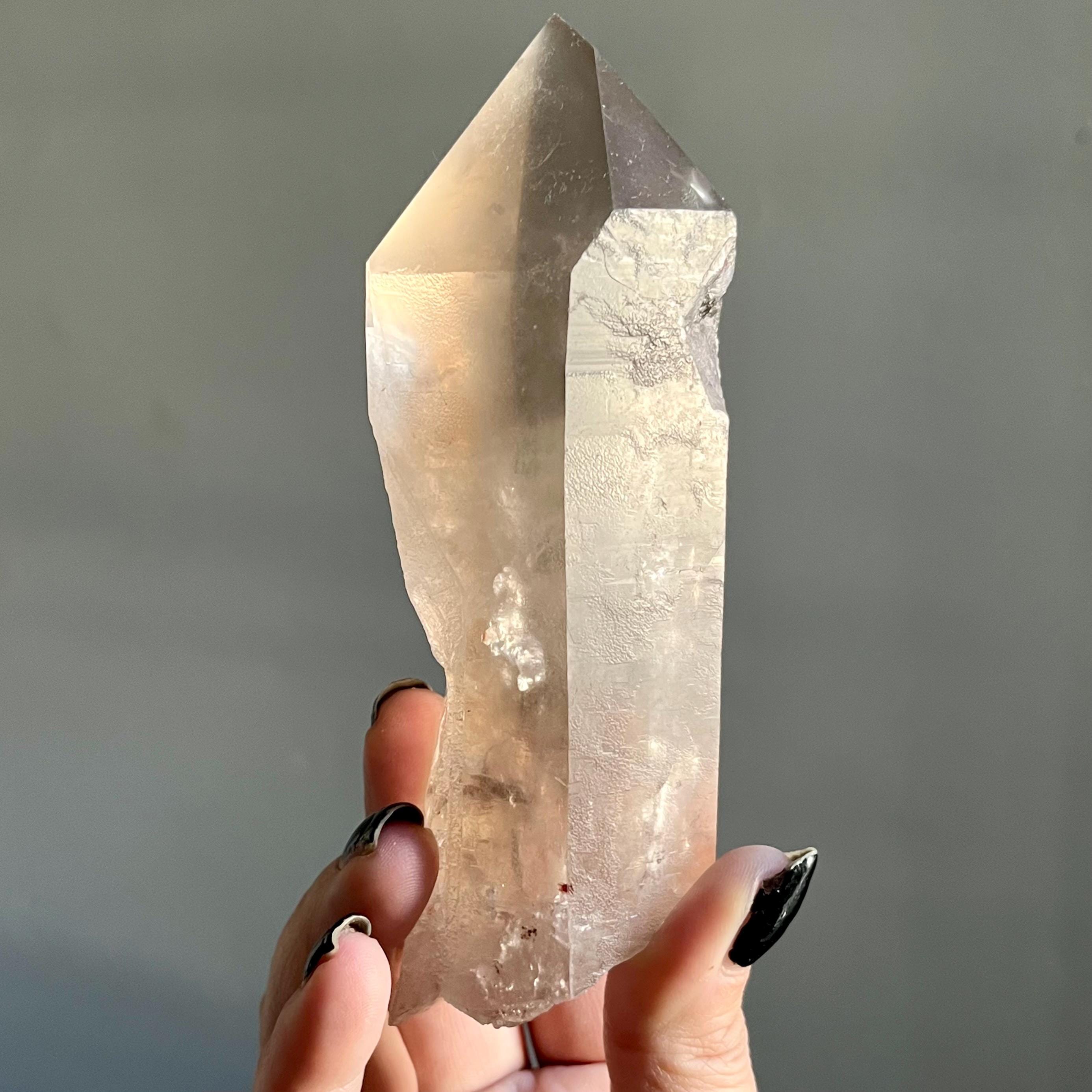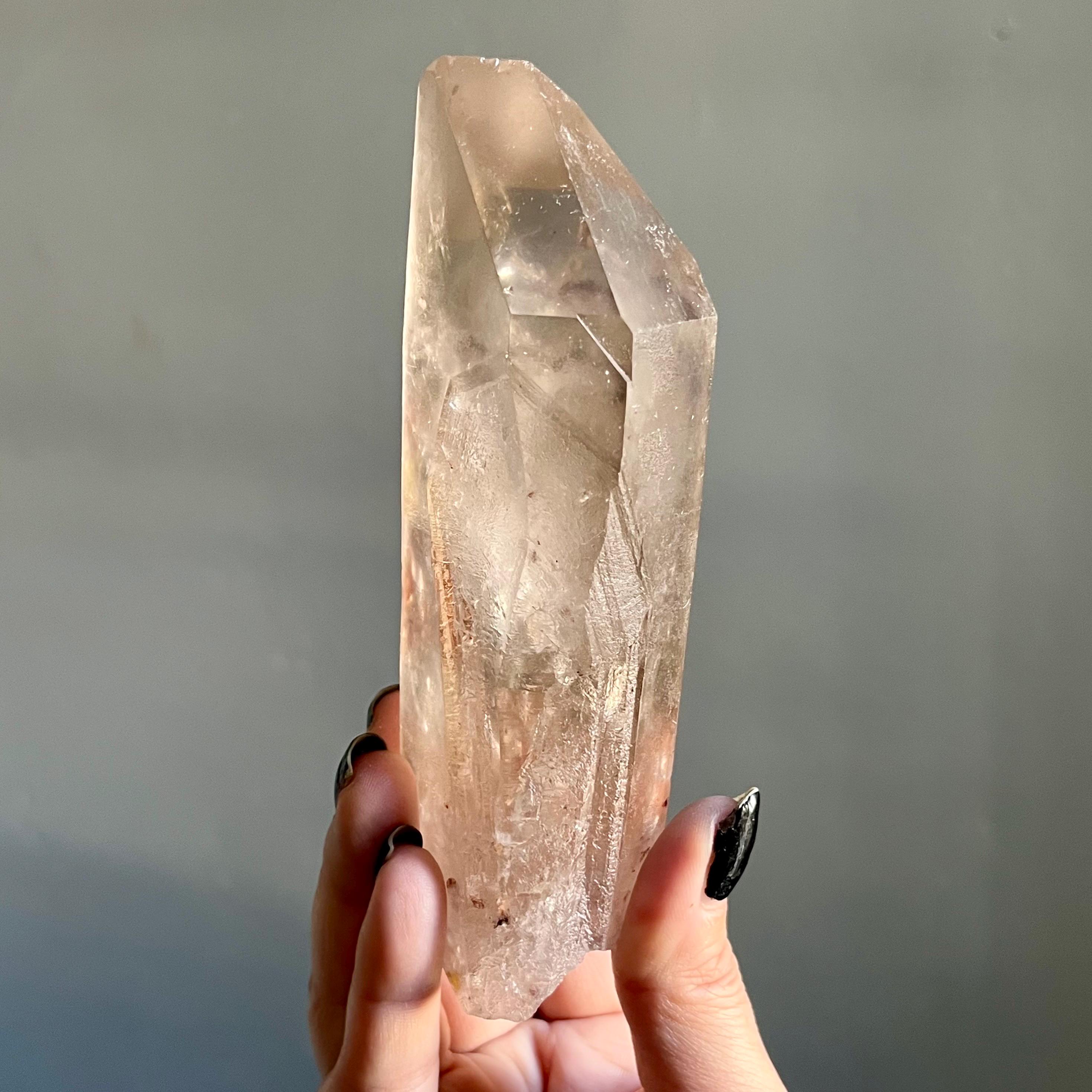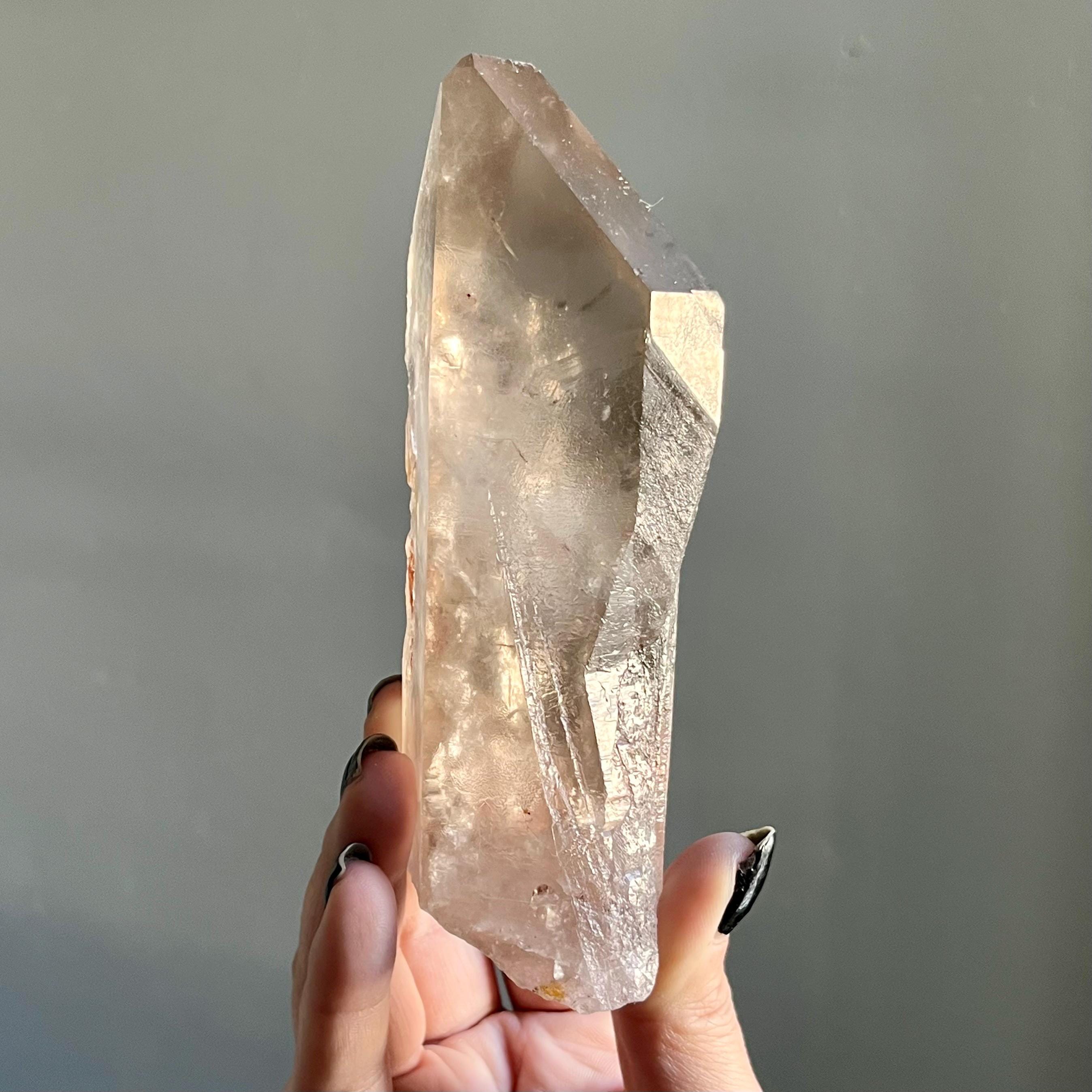 This large lighting strike lemurian laser quartz crystal point radiates in soft smoky champagne hues, natural citrine scrolled in the tangible language of energy.