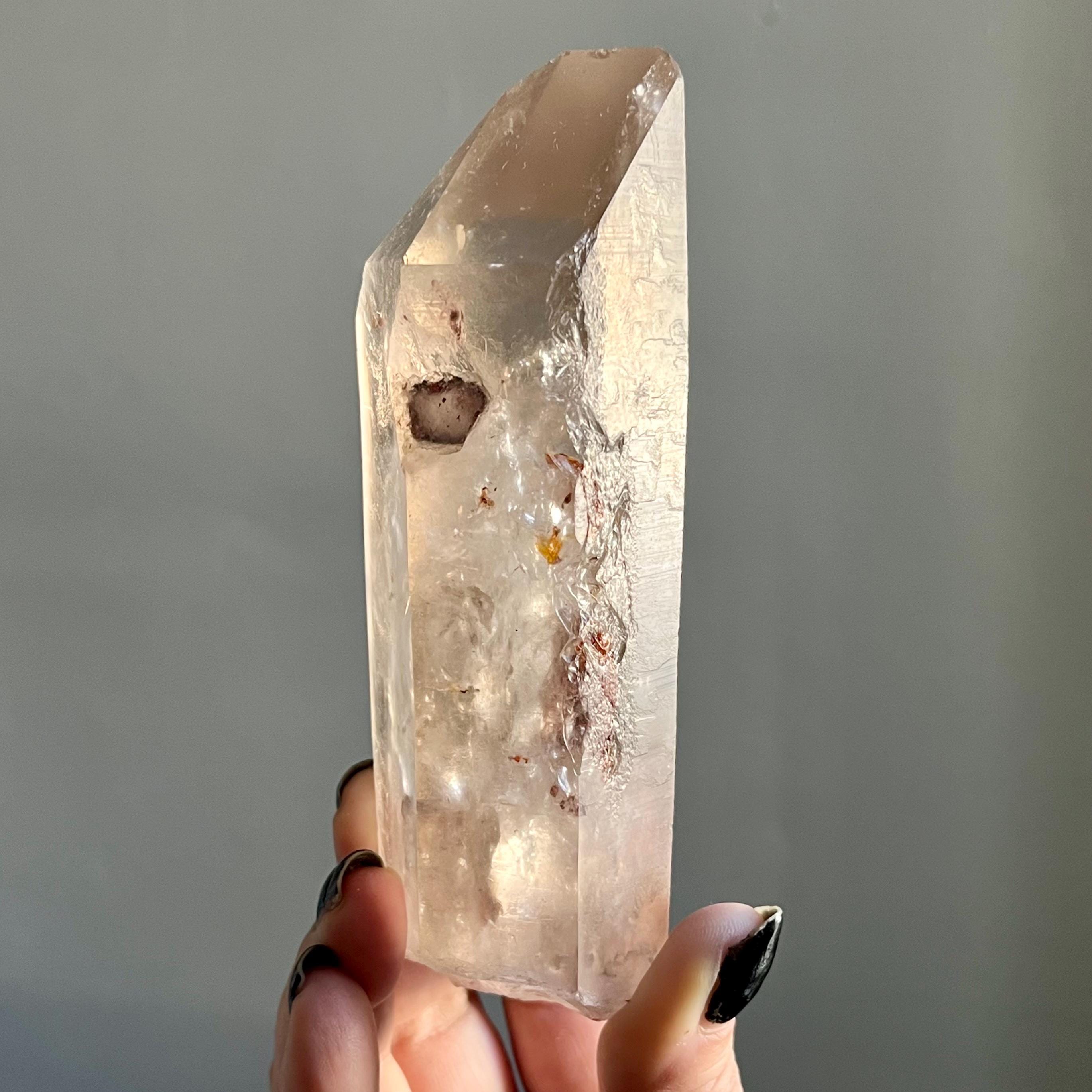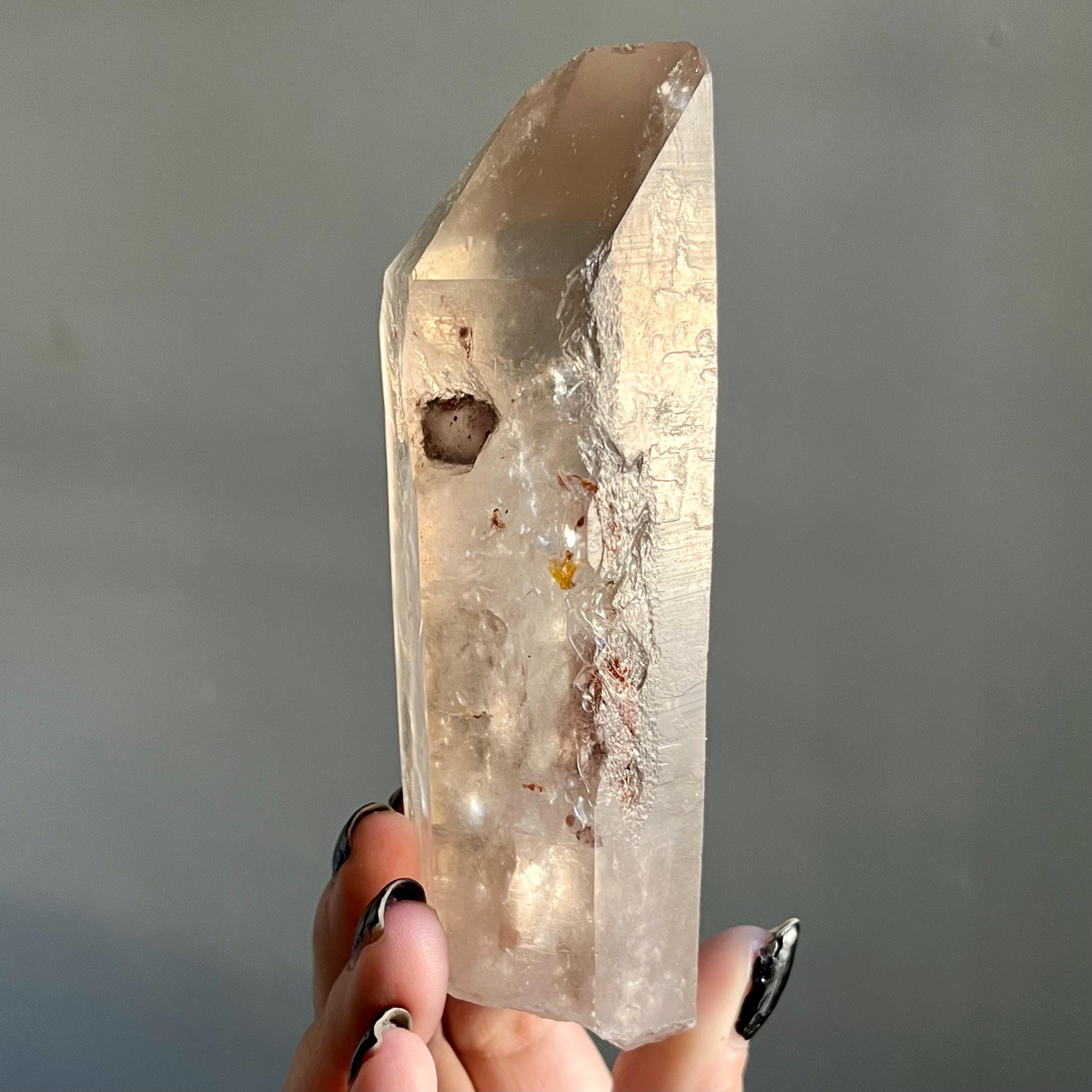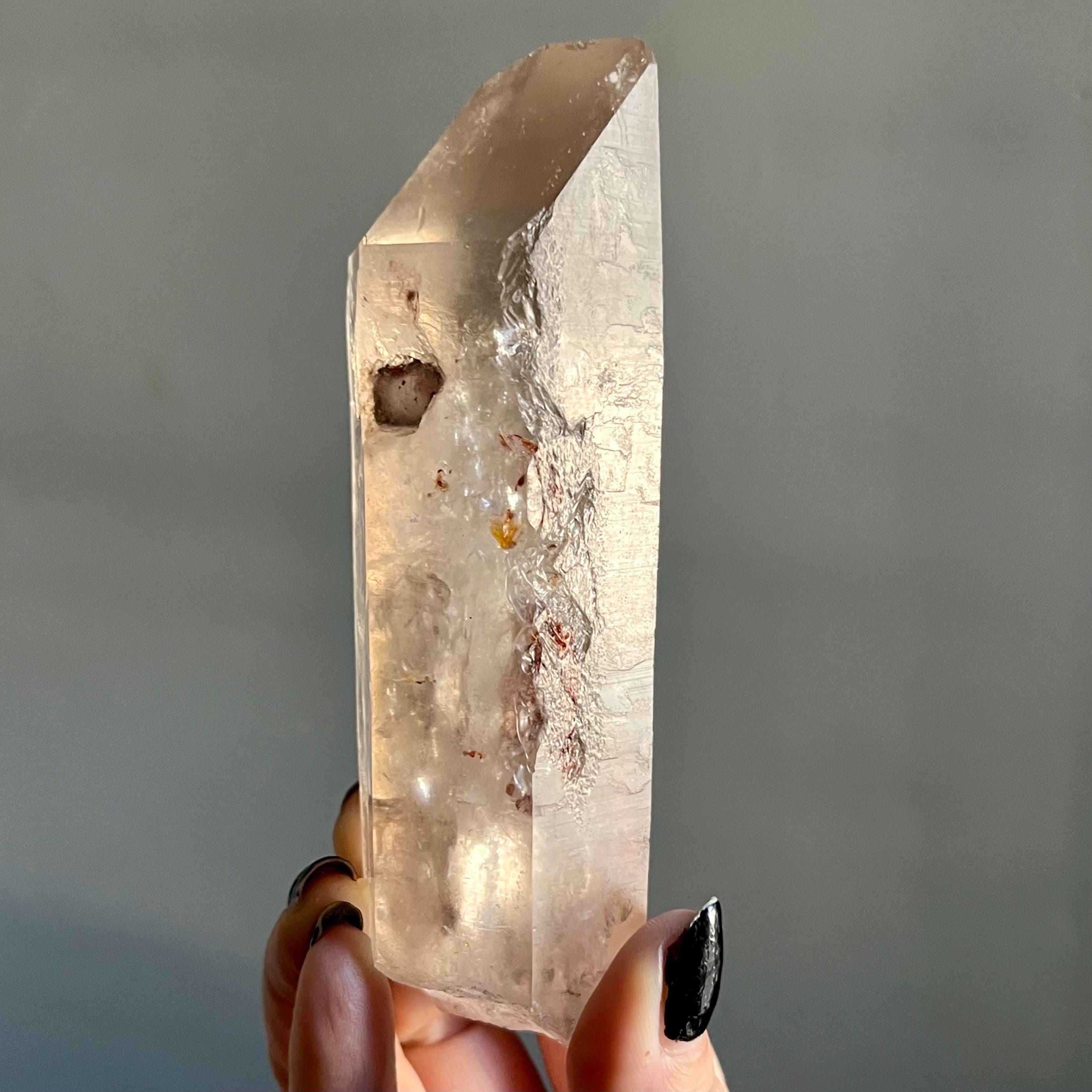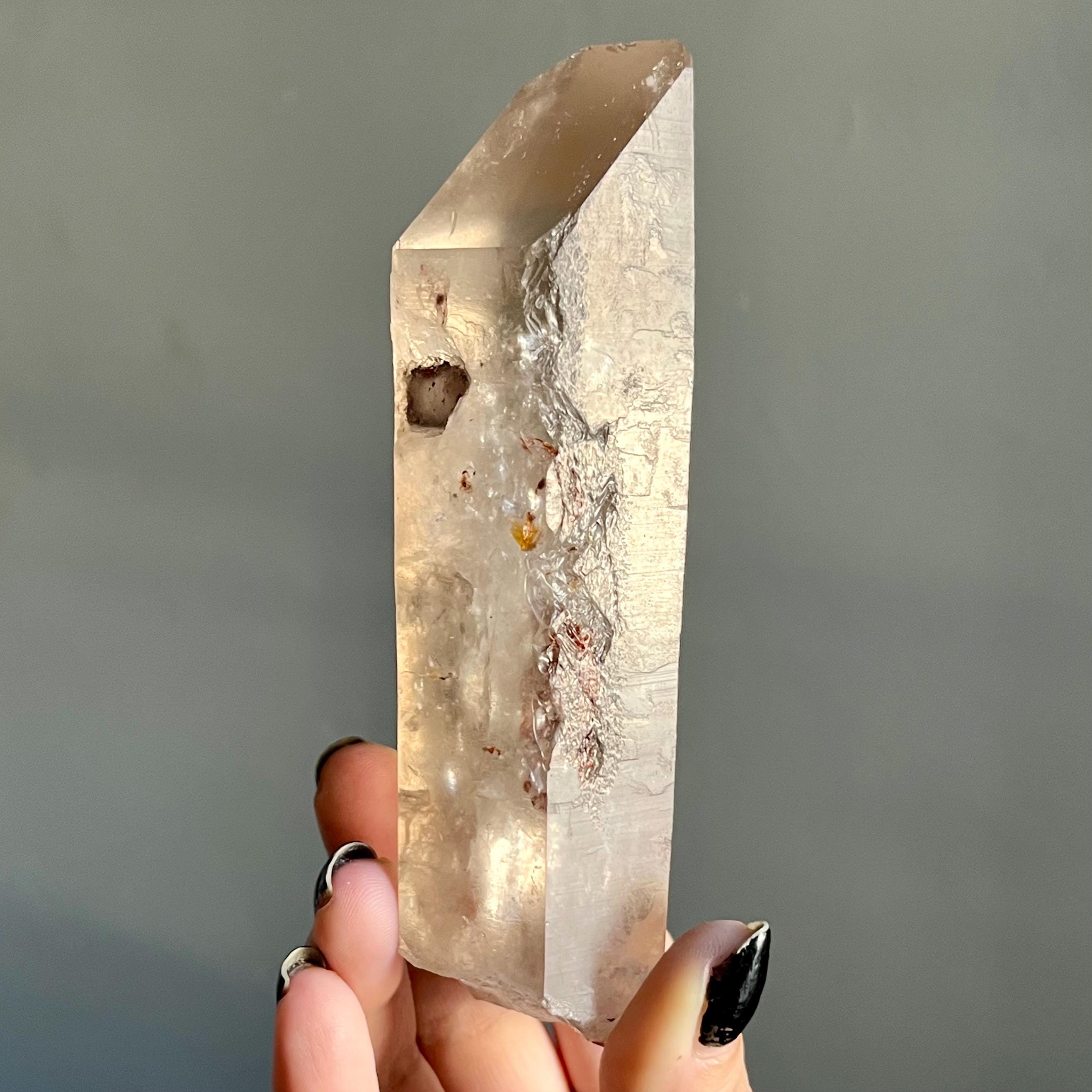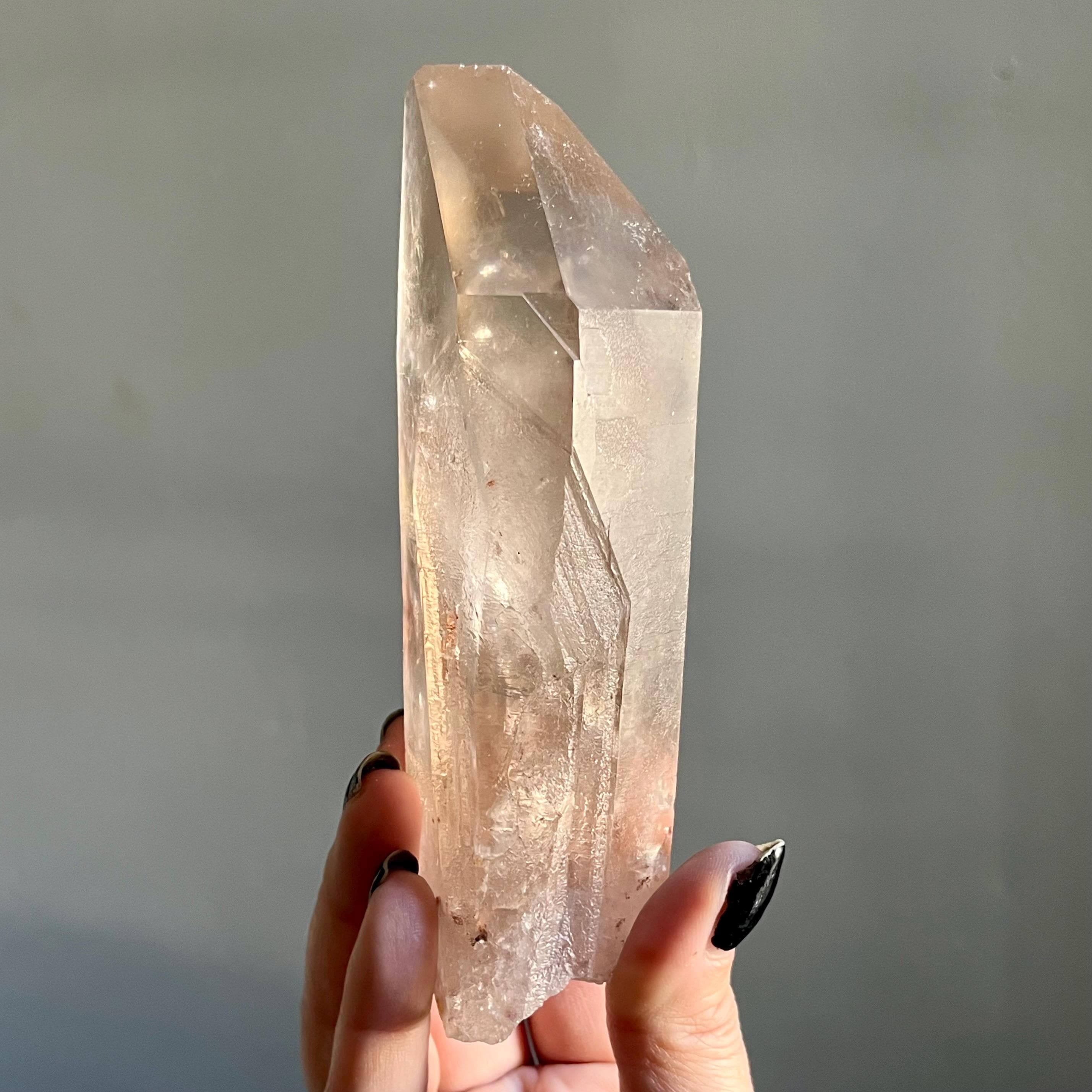 This large lighting strike lemurian laser quartz crystal point radiates in soft smoky champagne hues, natural citrine scrolled in the tangible language of energy.