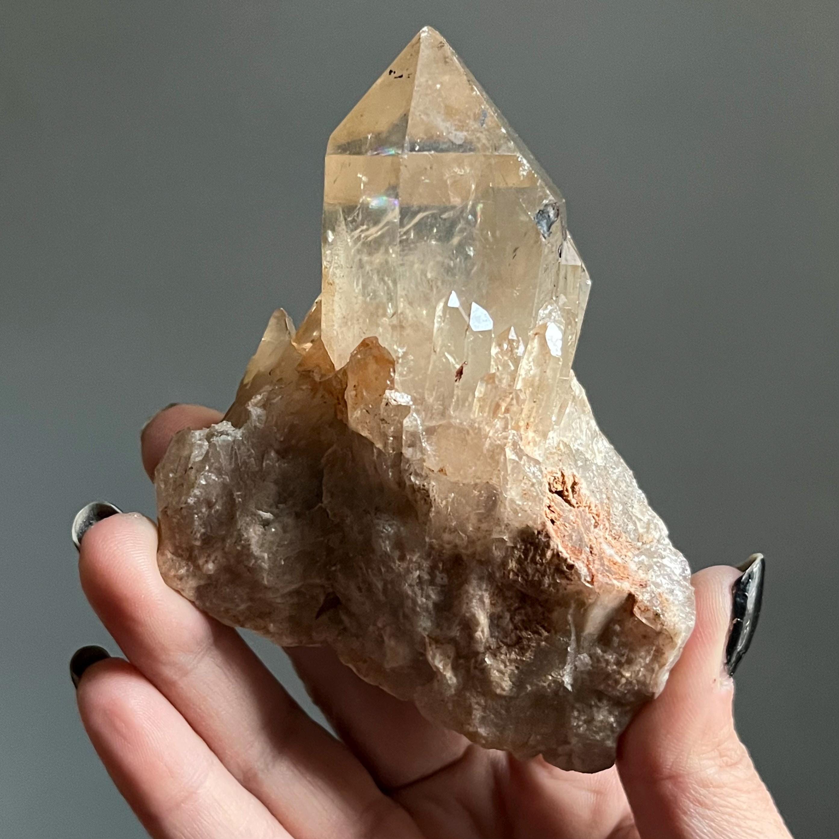 A master crystal, this natural five sided isis quartz crystal calls in the elemental spirit, the space where all of the elements meet. Coexist.