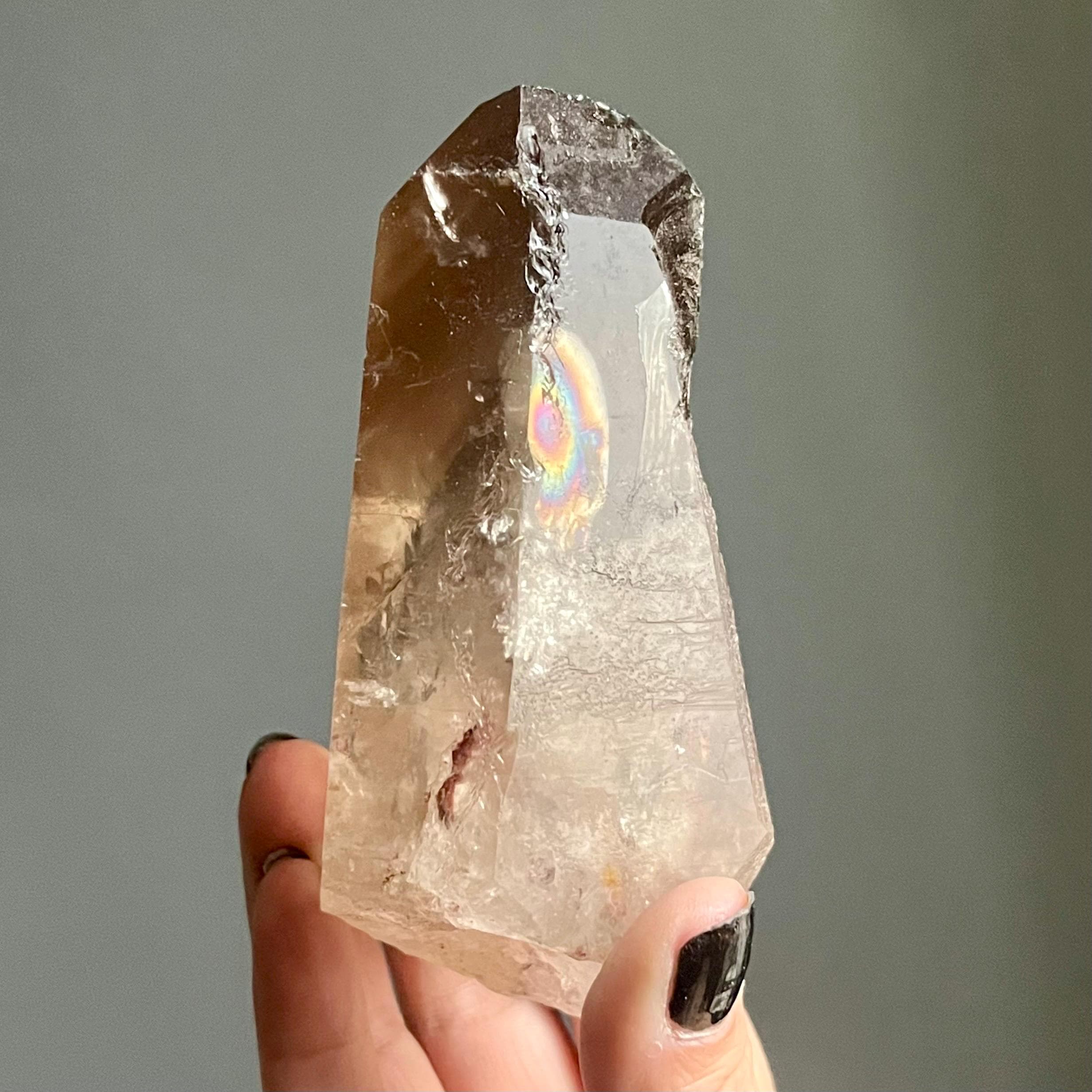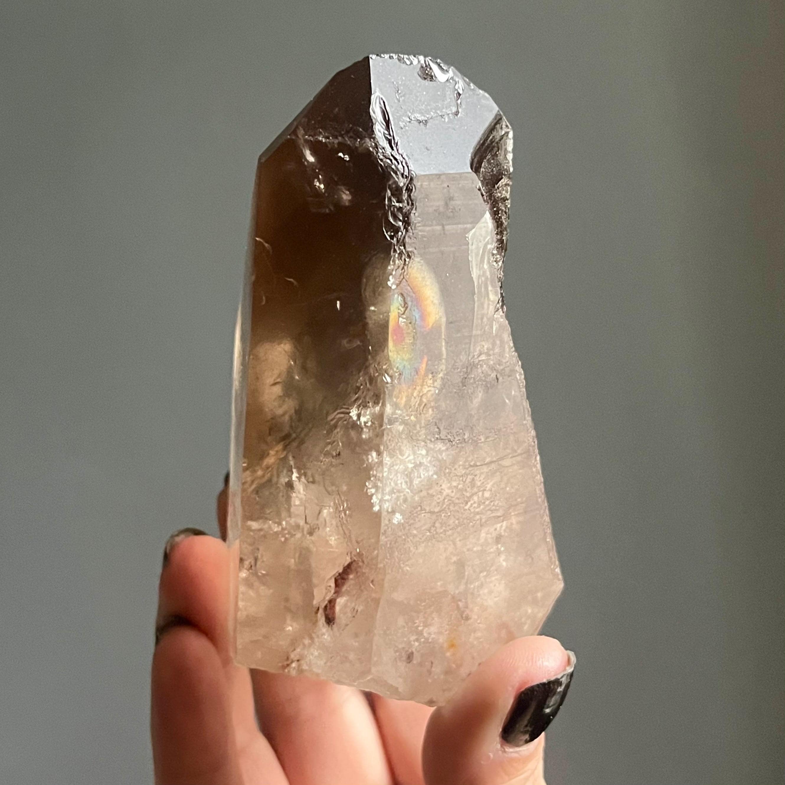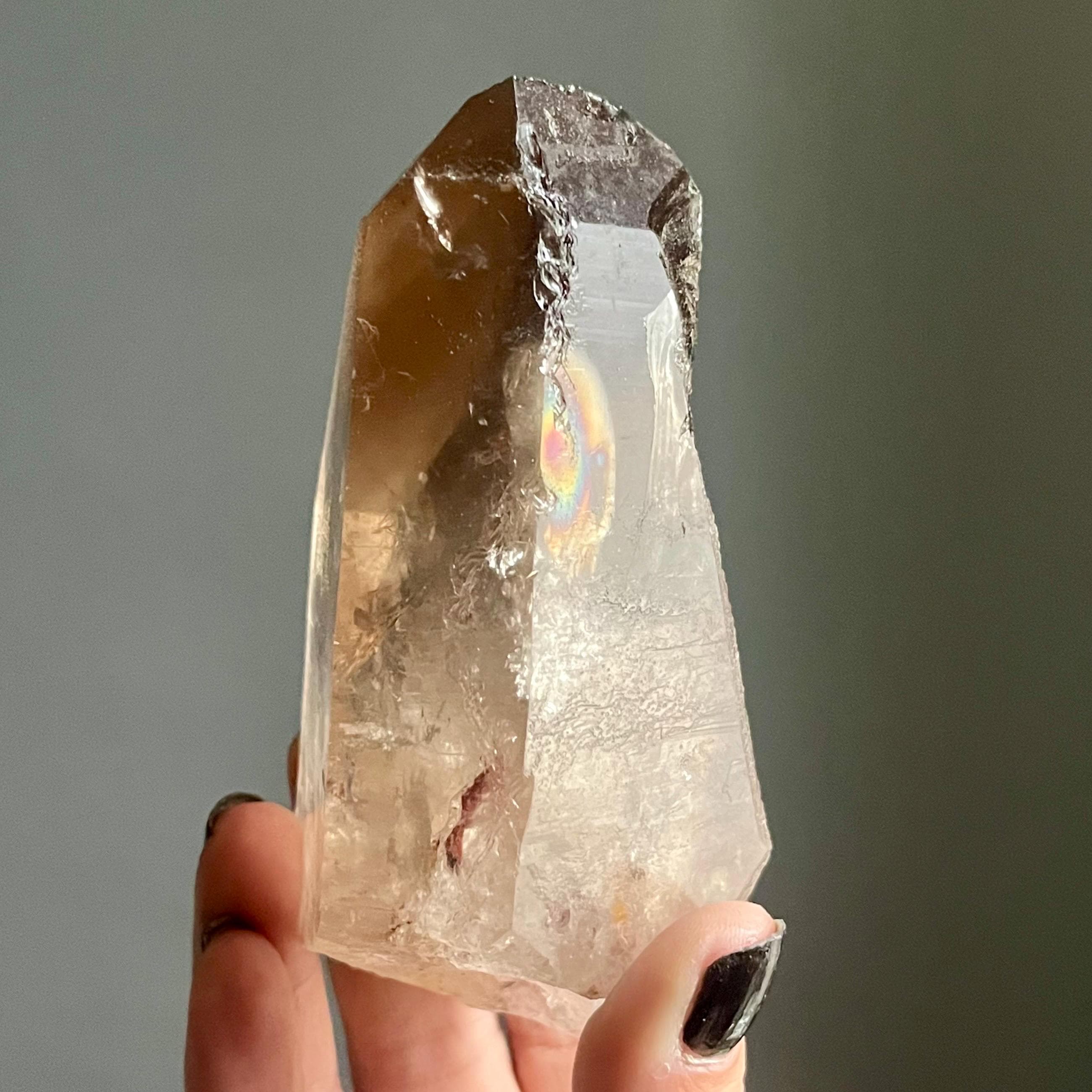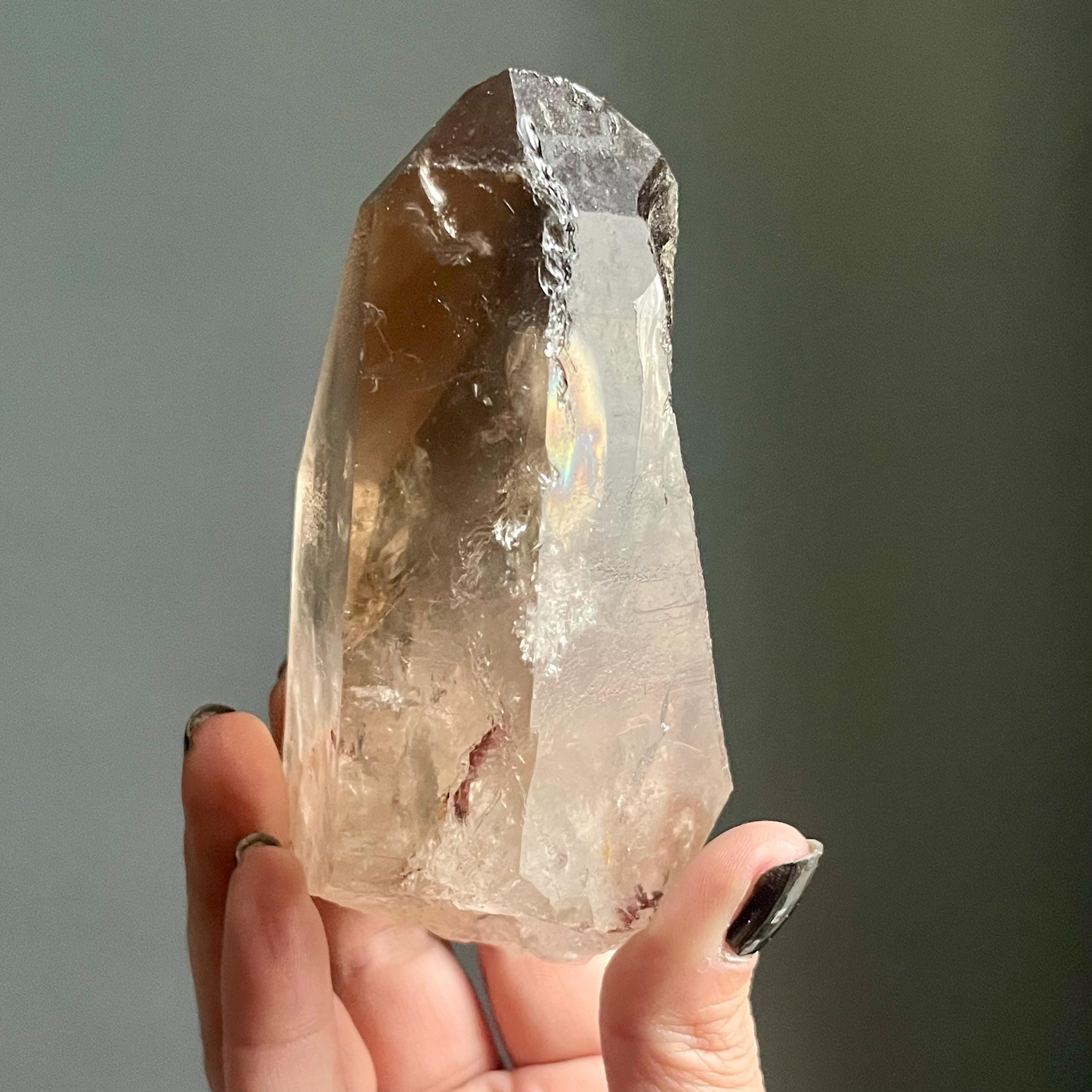 Wild lighting strike lemurian quartz manifests rarely in rich natural smoky citrine with generational phantoms, brilliant rainbows and sacred triangular record keepers stepping forward in uncommon form.