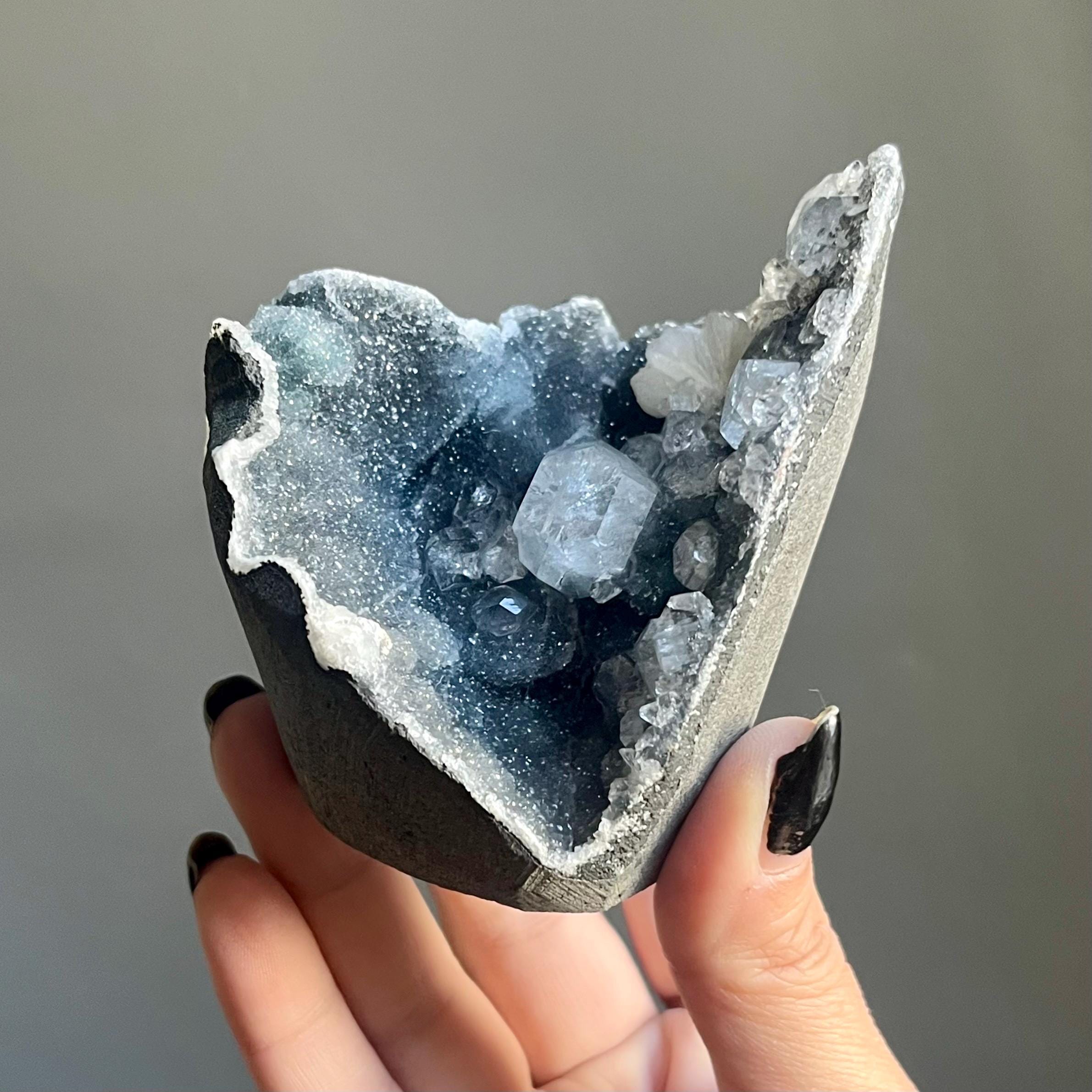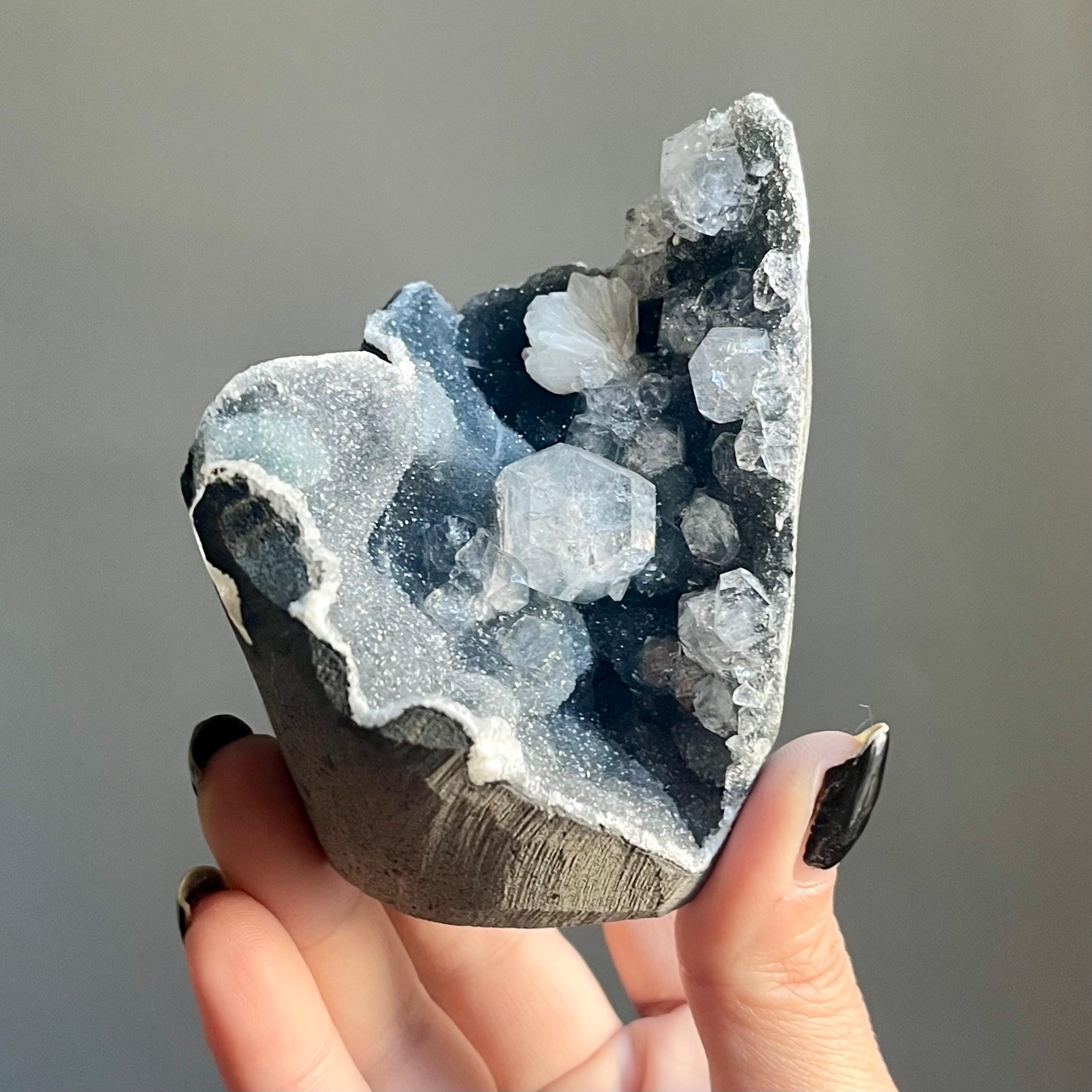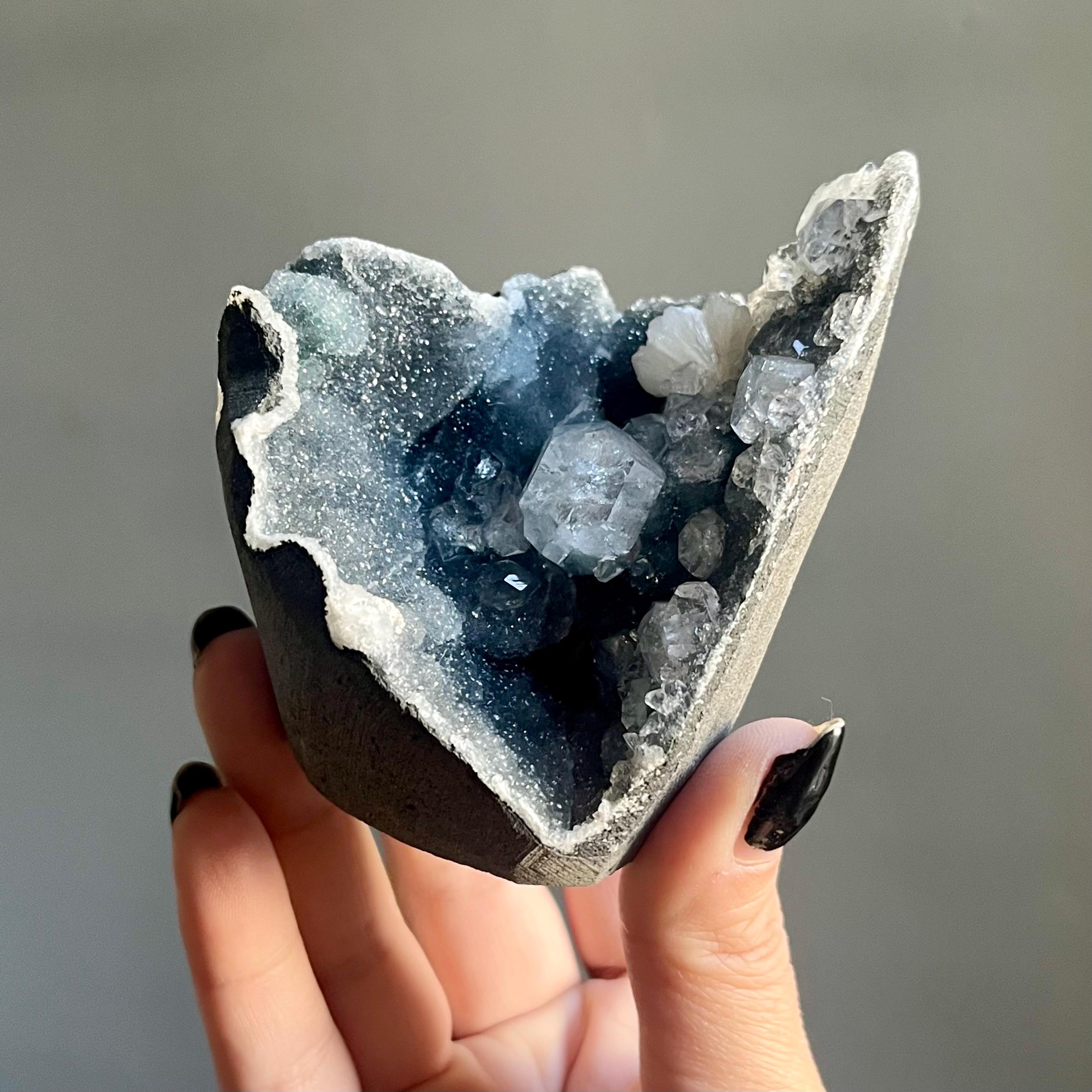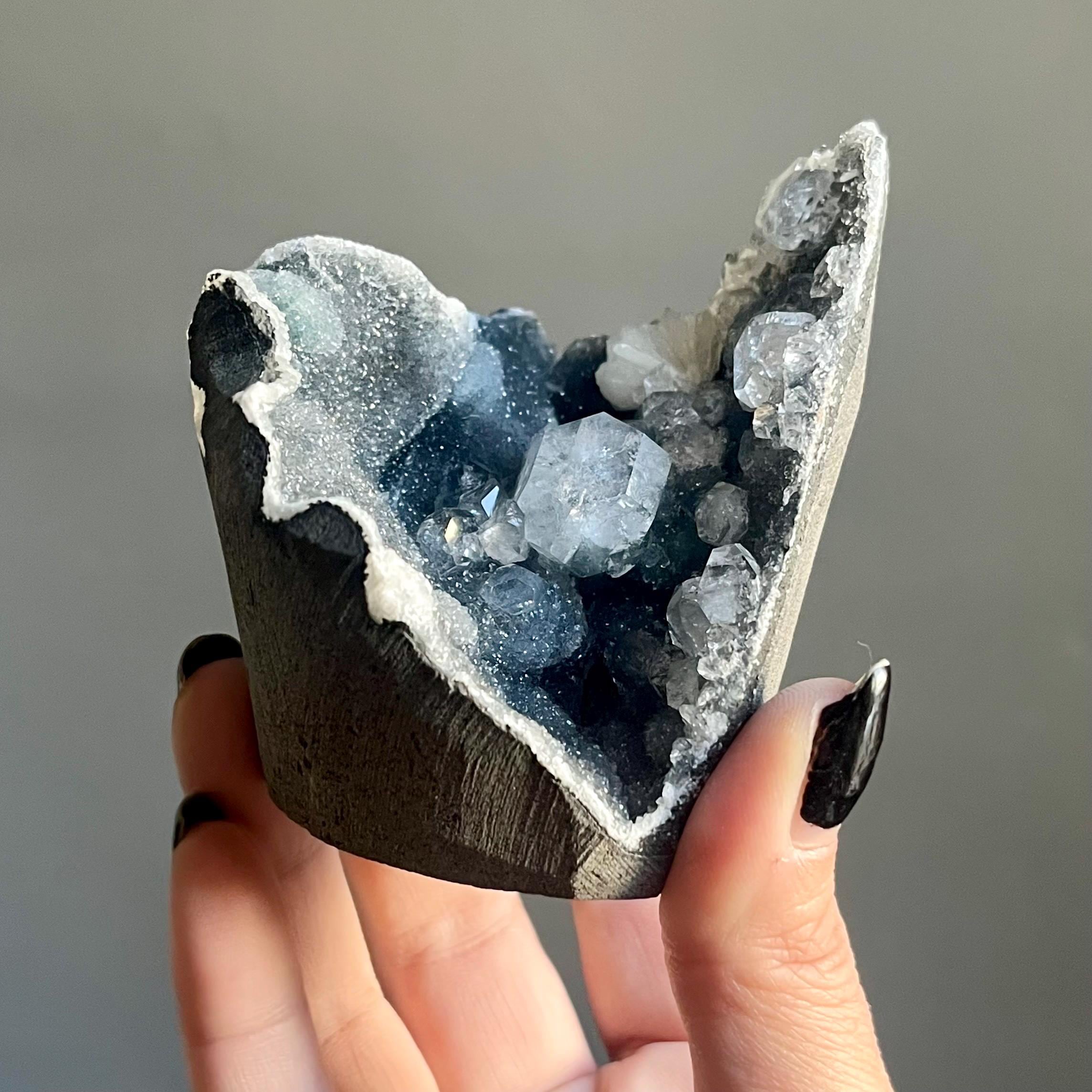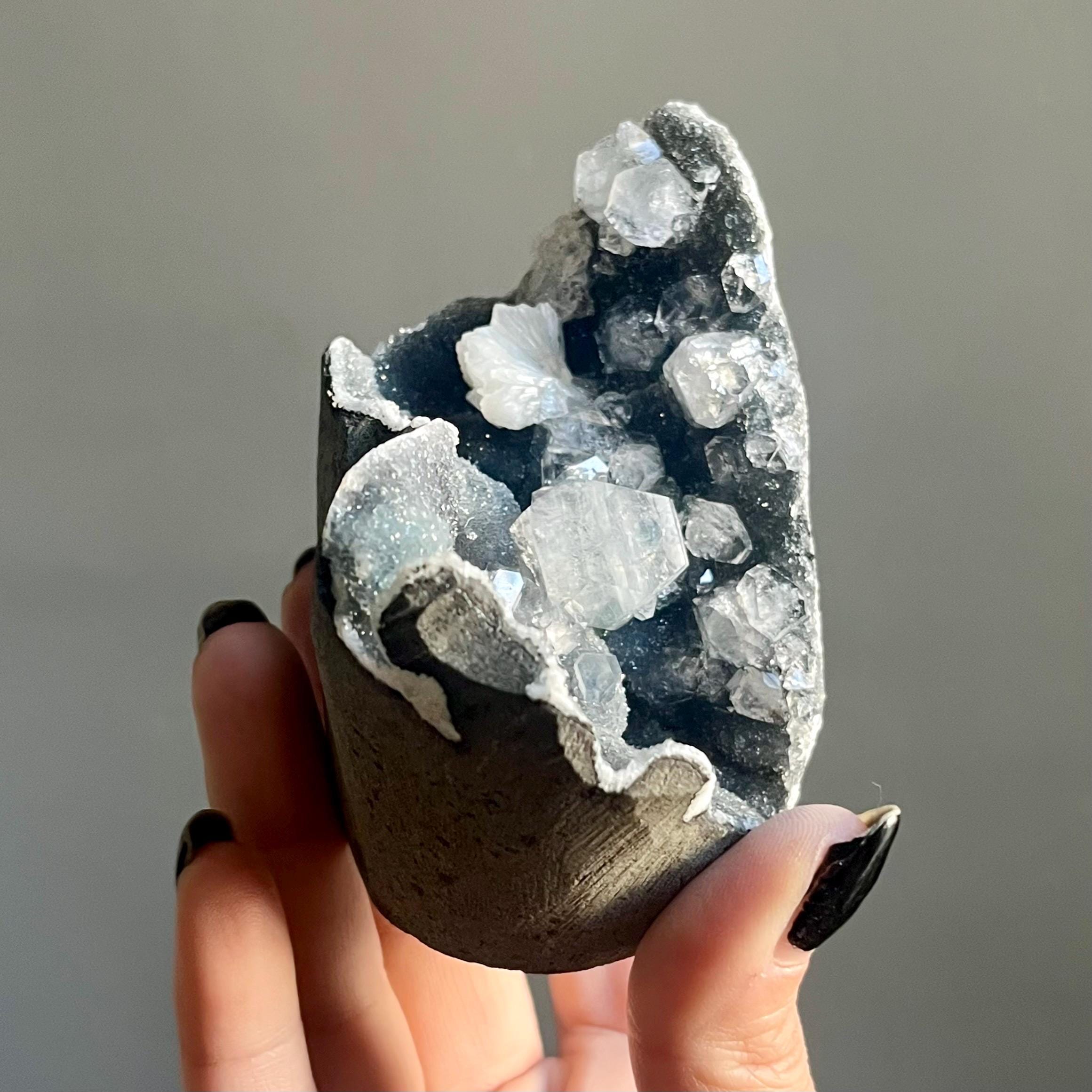 This extraordinary blue chalcedony apophyllite cluster manifests like an ancient vessel. Saturated in sparkling druzy, blue transitions to black chalcedony. Alchemy in tangible form.