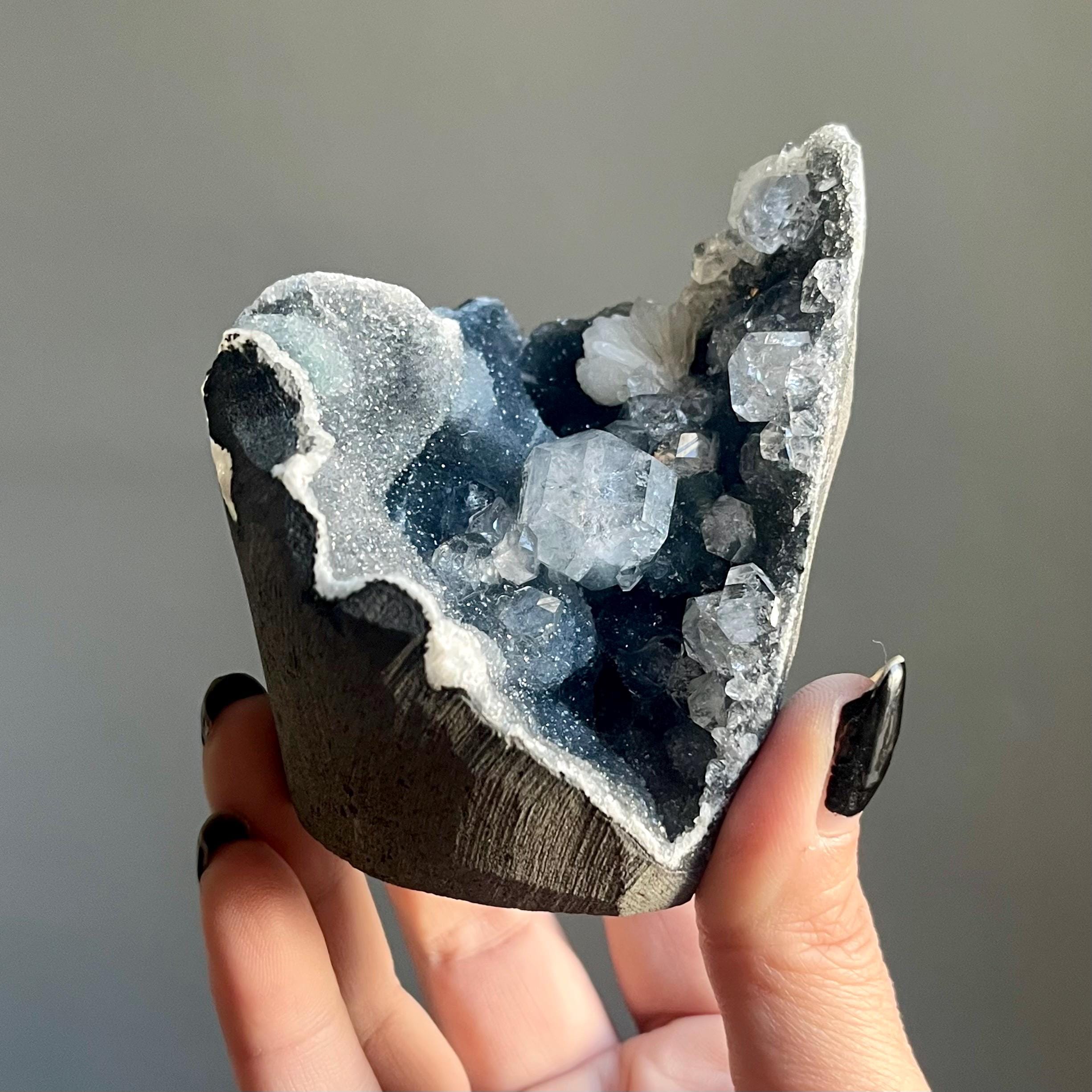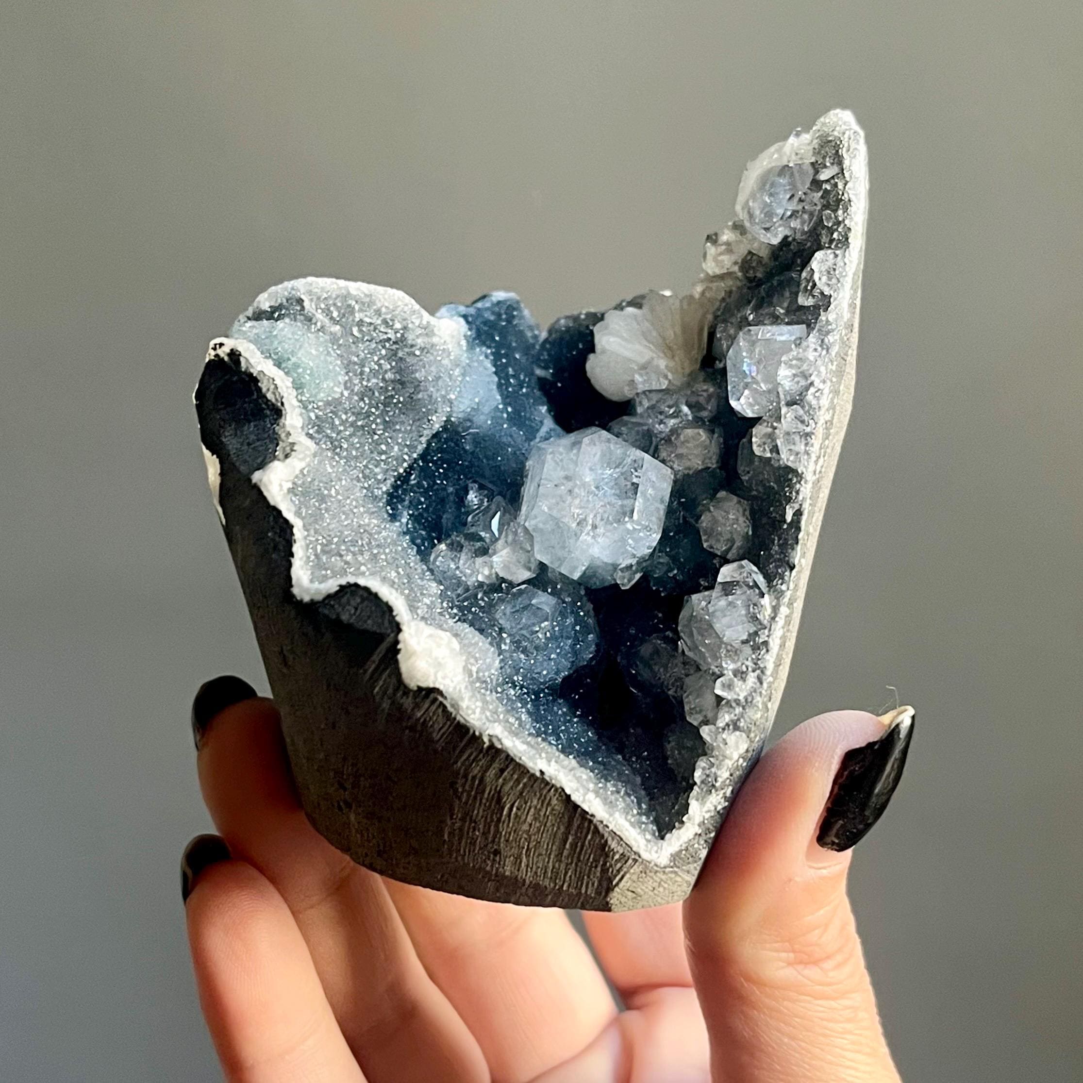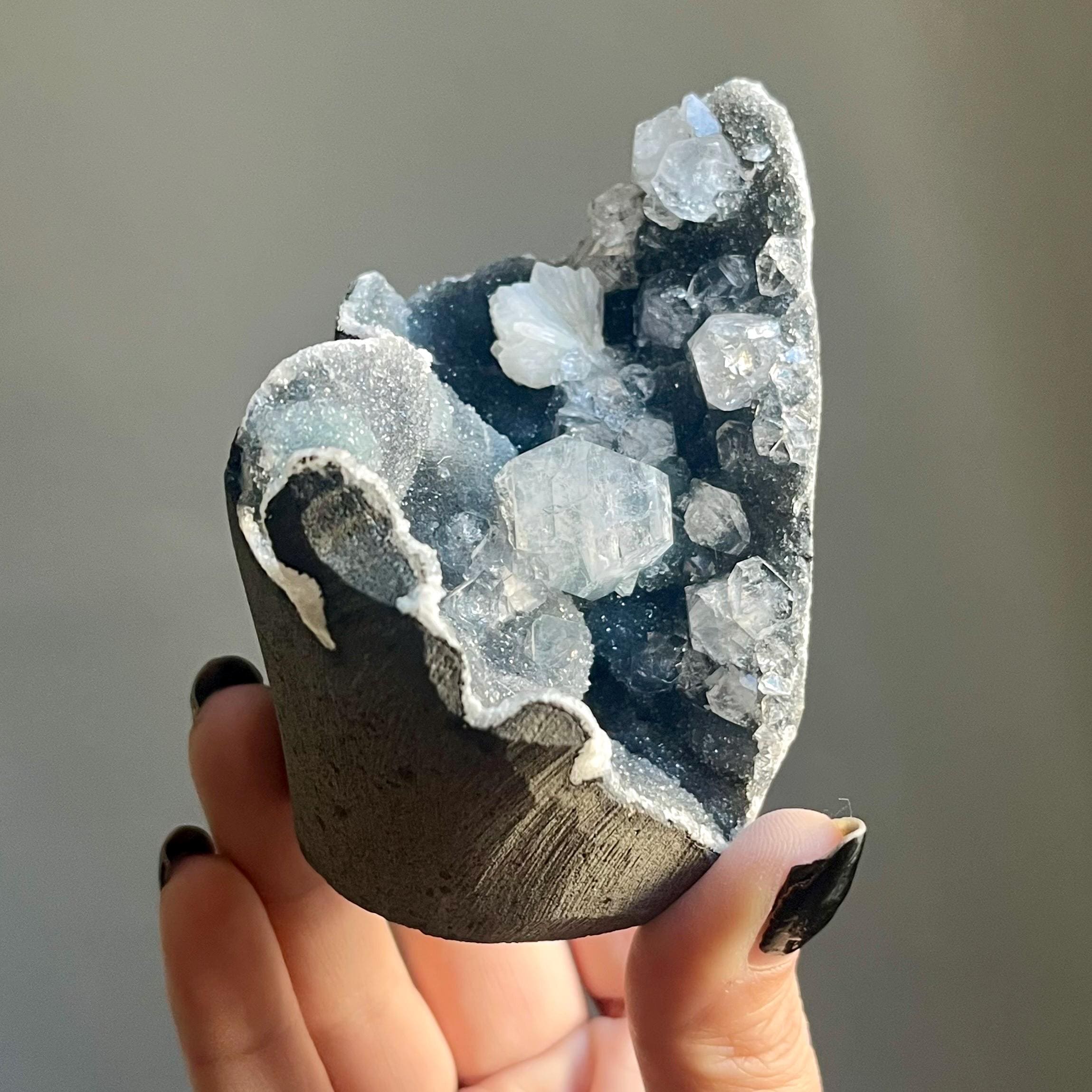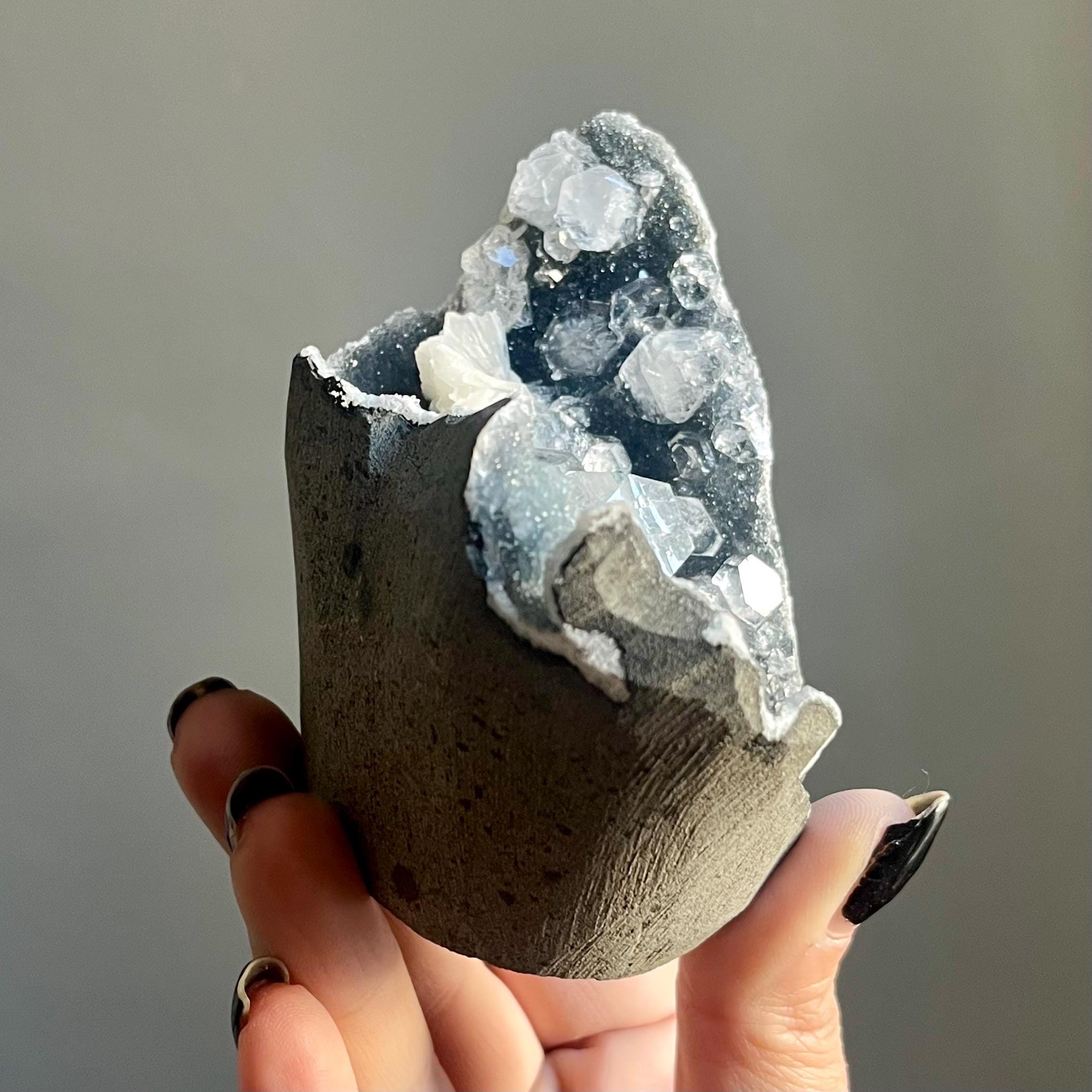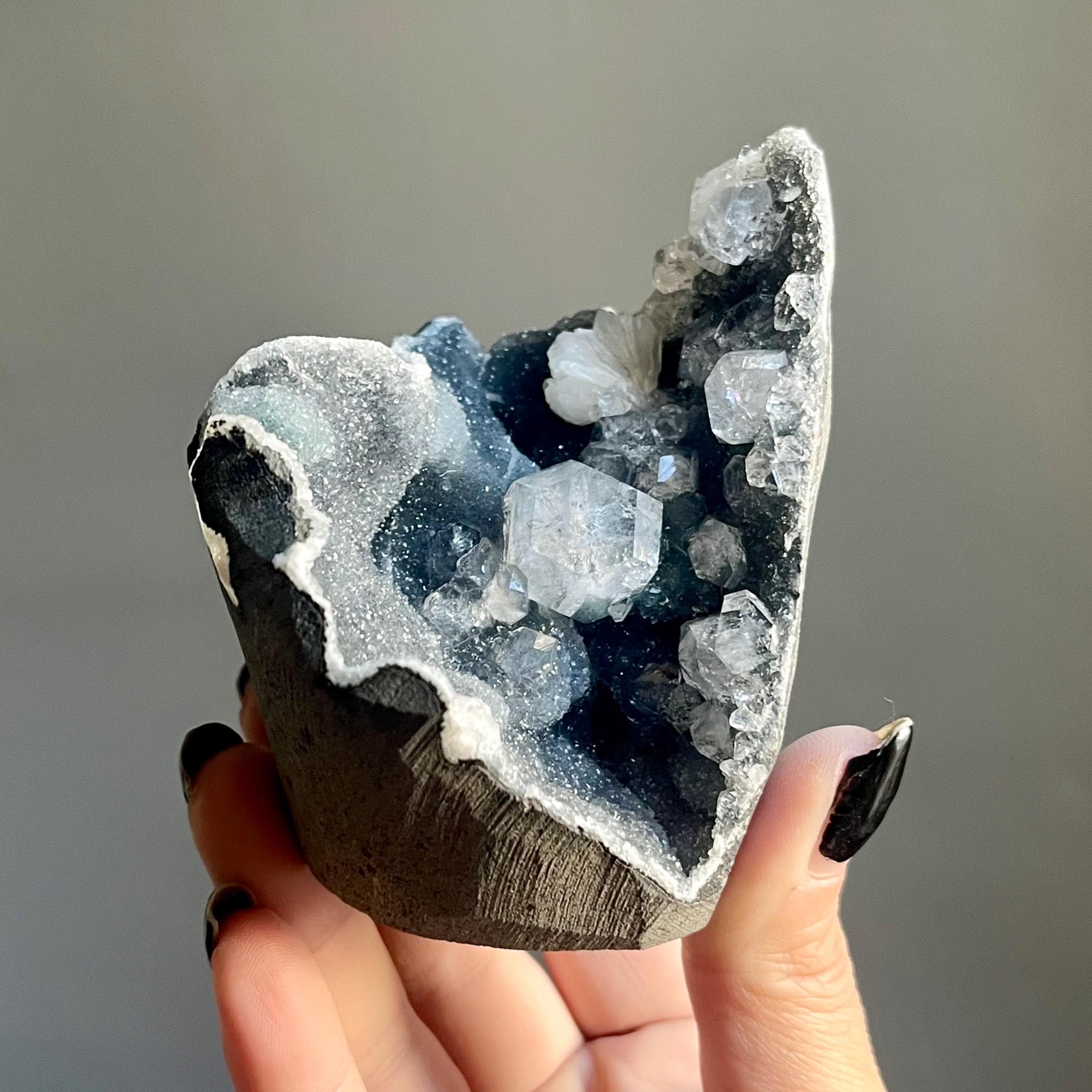This extraordinary blue chalcedony apophyllite cluster manifests like an ancient vessel. Saturated in sparkling druzy, blue transitions to black chalcedony. Alchemy in tangible form.