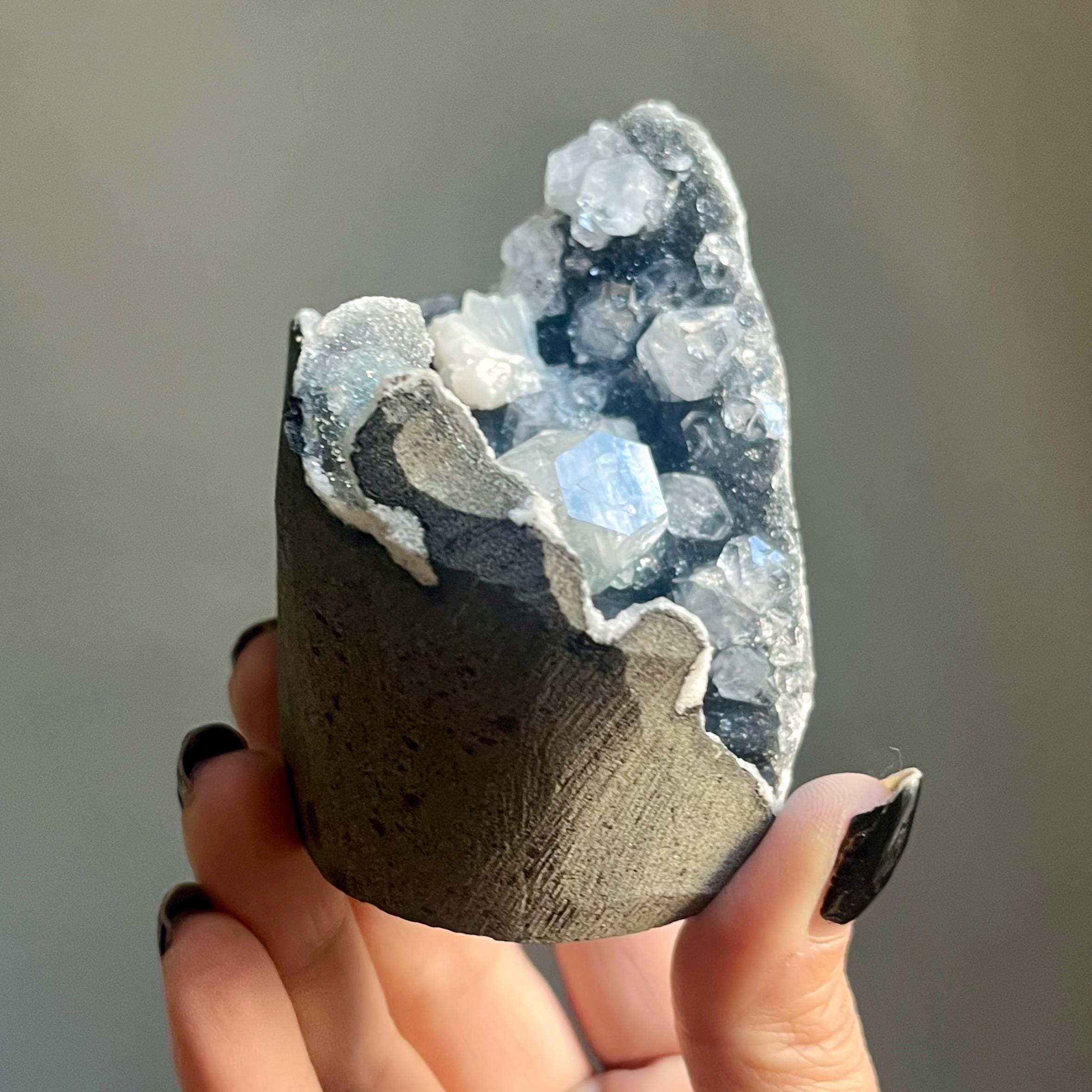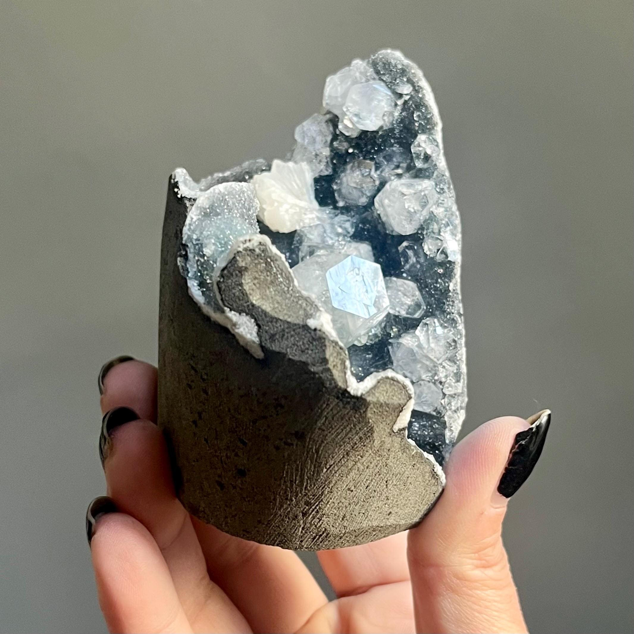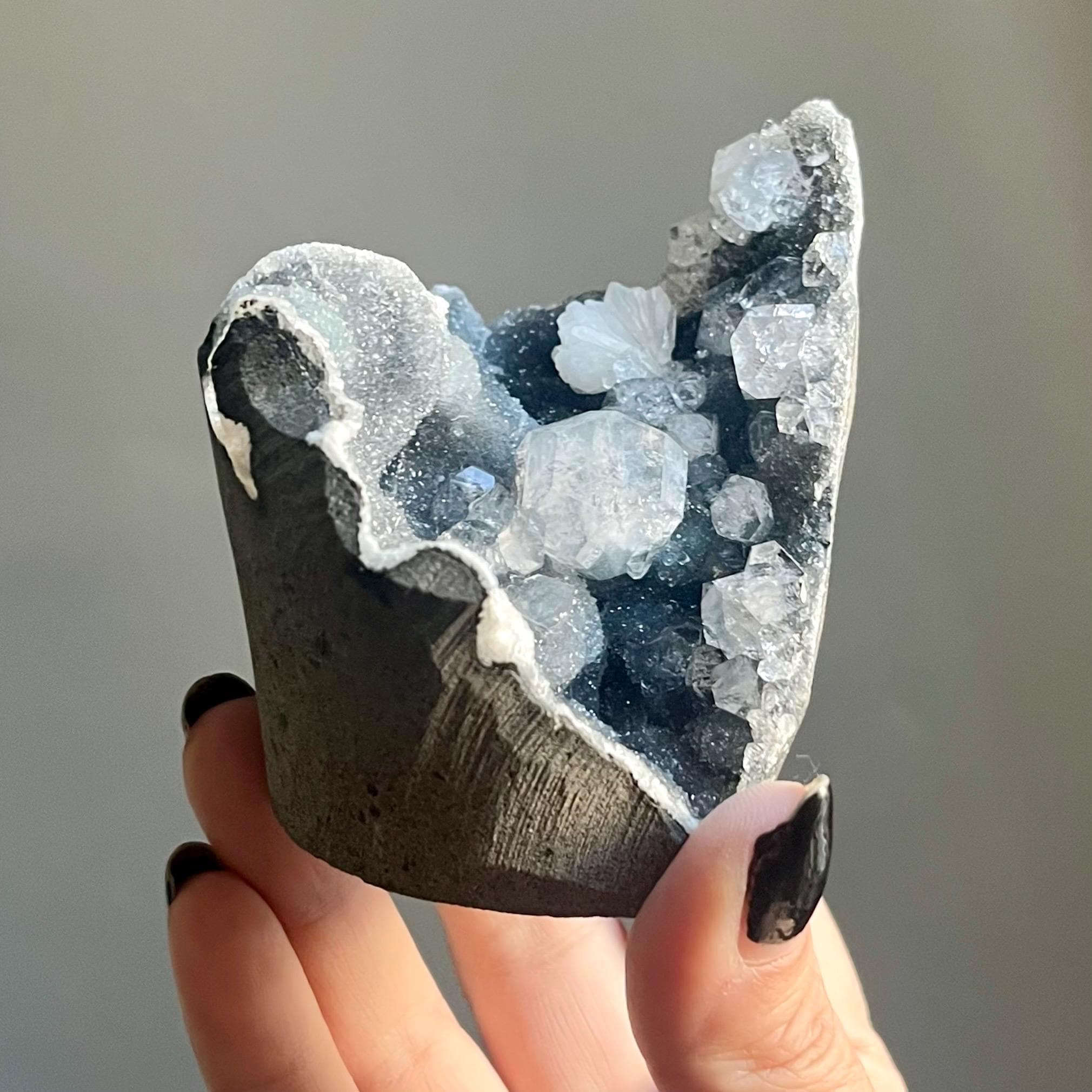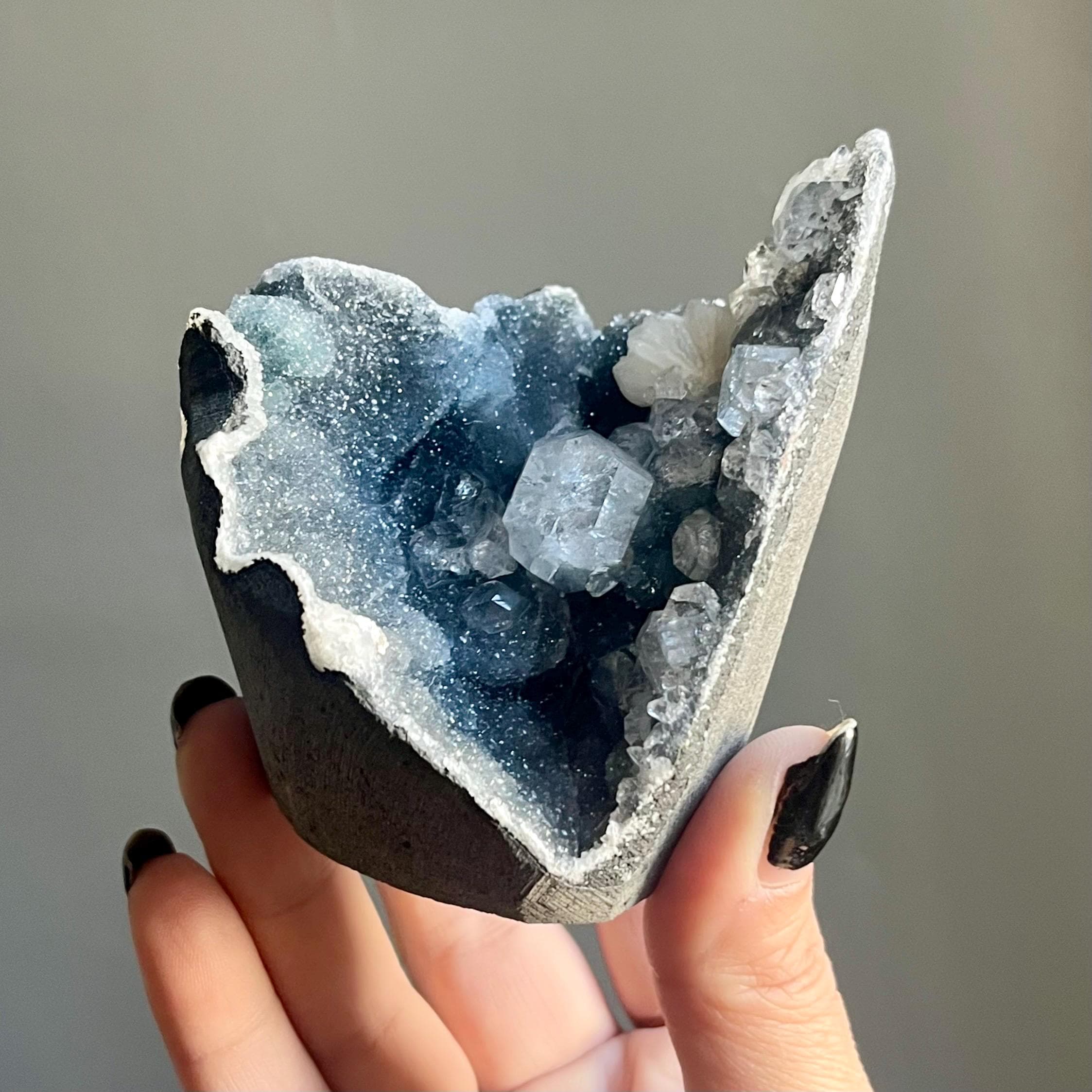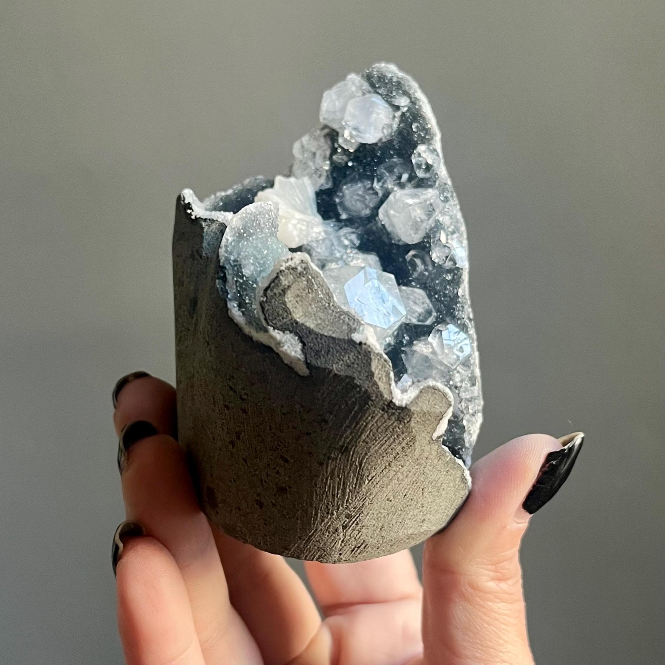 This extraordinary blue chalcedony apophyllite cluster manifests like an ancient vessel. Saturated in sparkling druzy, blue transitions to black chalcedony. Alchemy in tangible form.