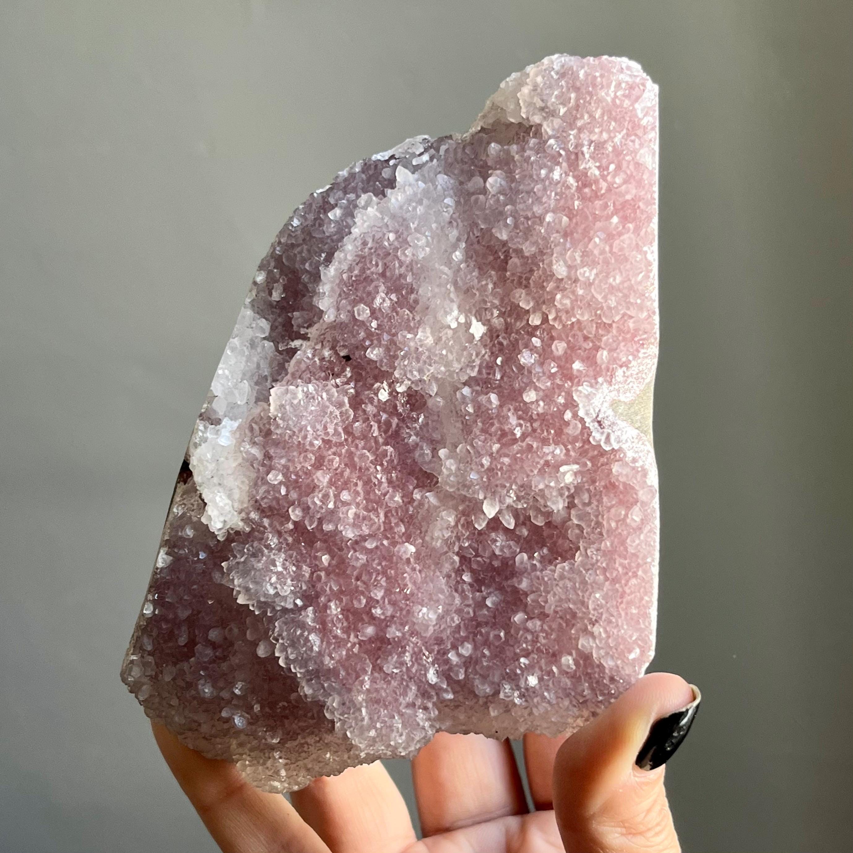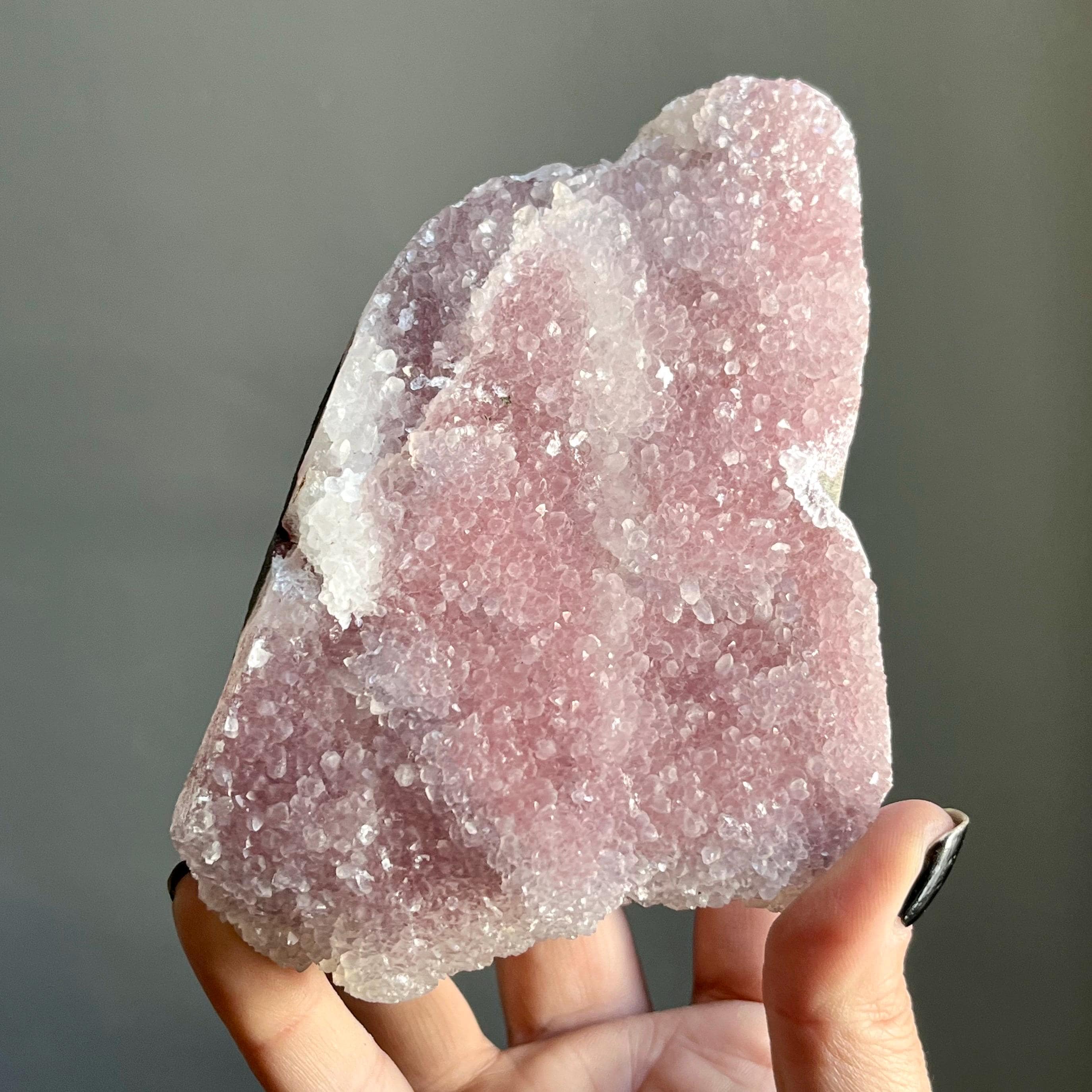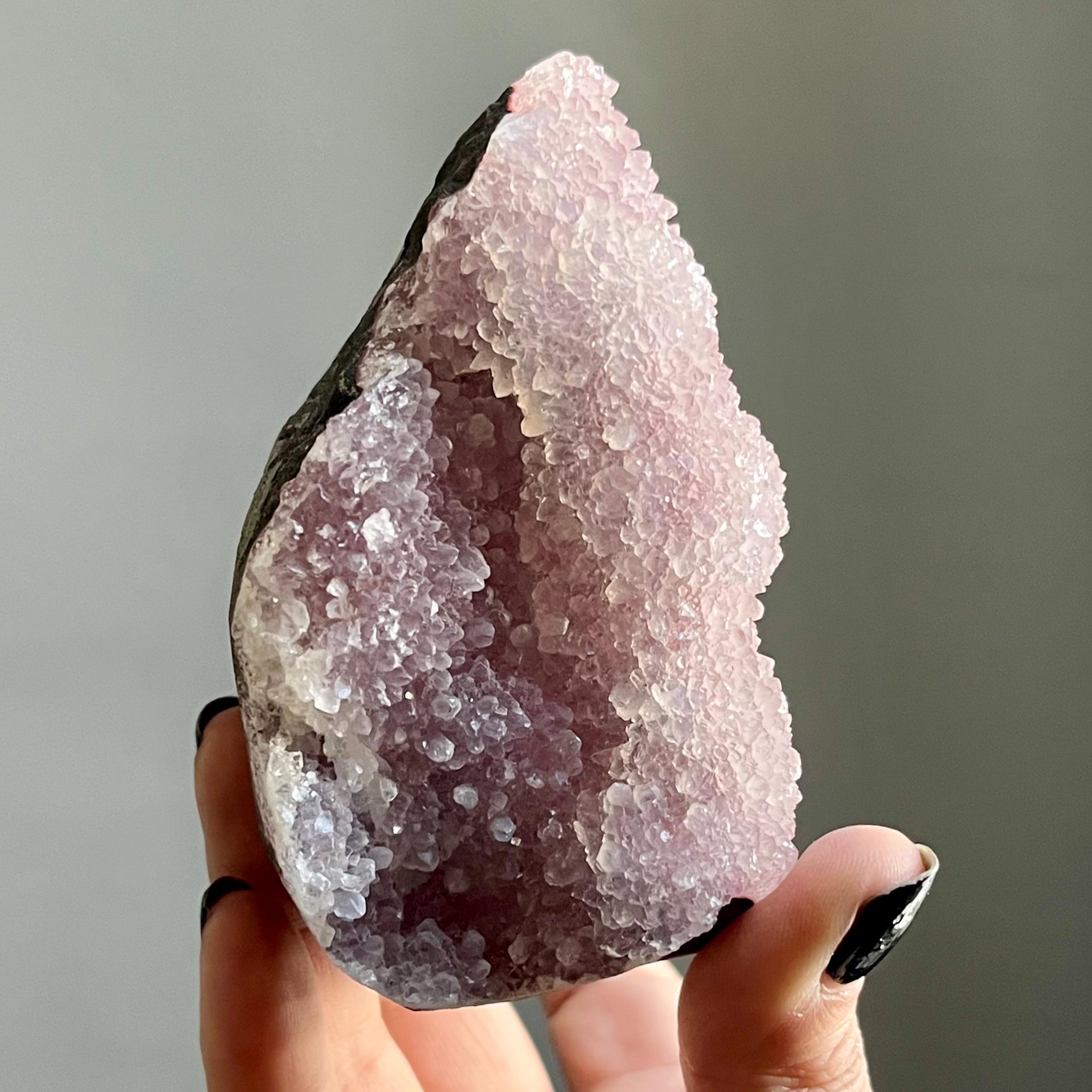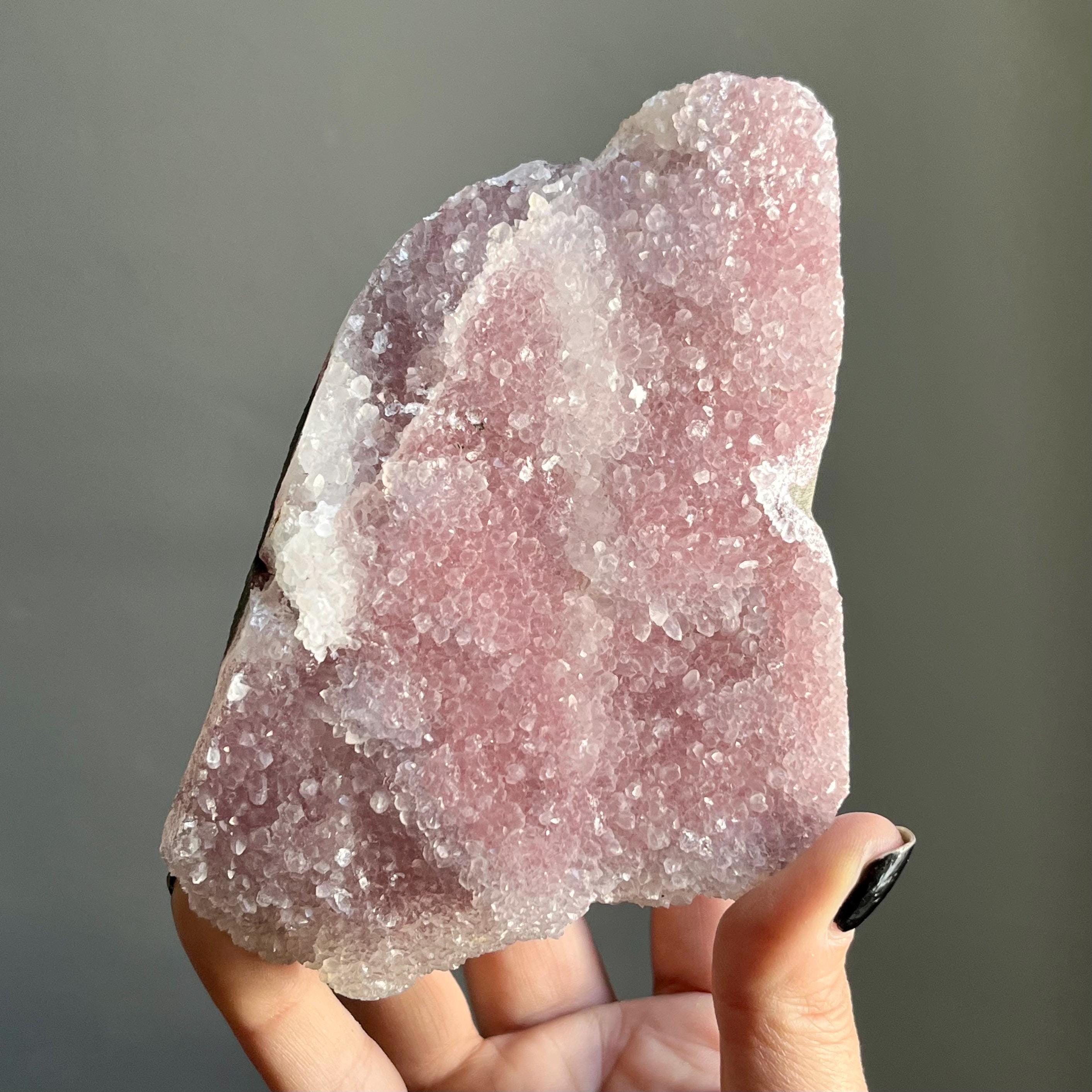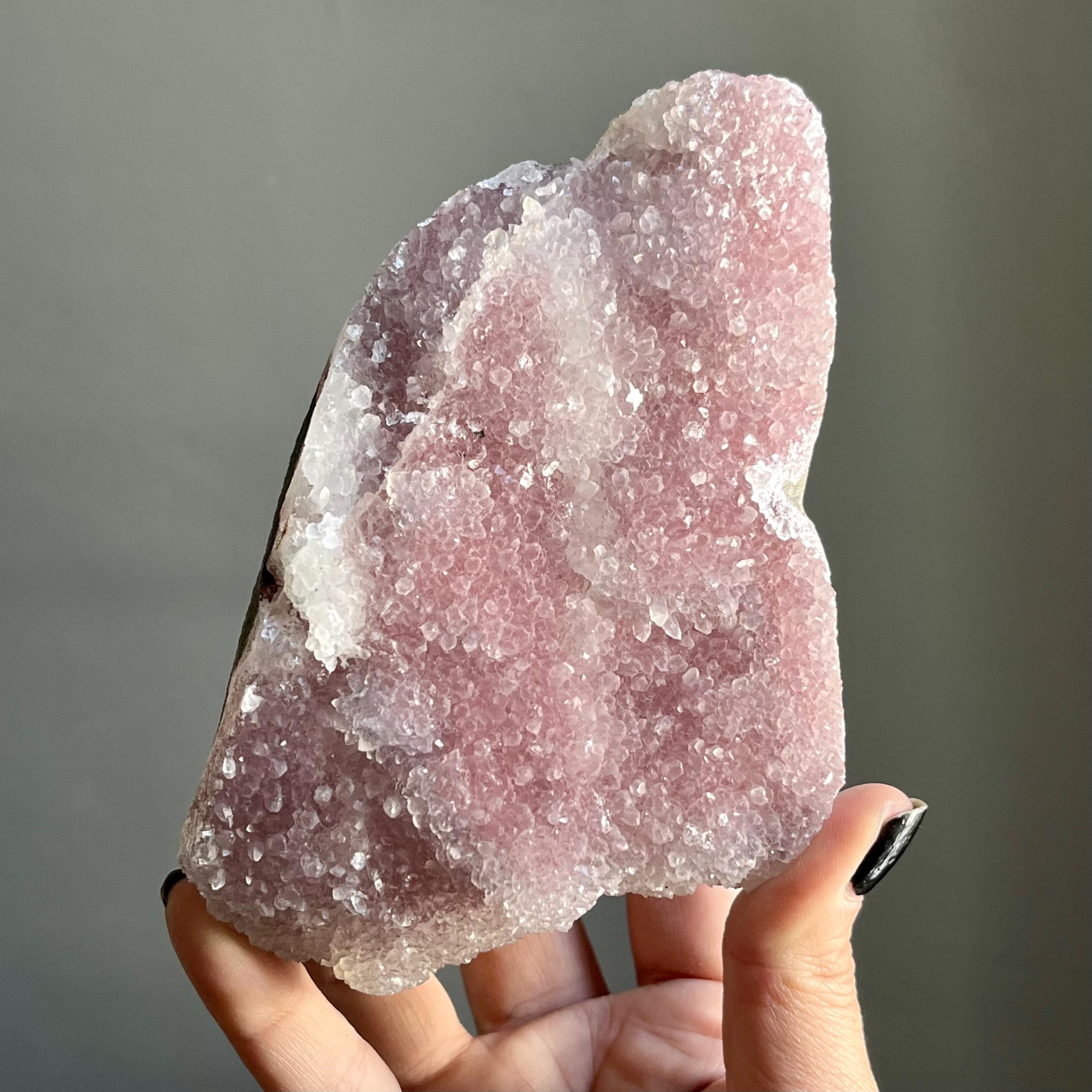 Small diamond apophyllite crystals shimmer, pink druzy which wraps around two sides of this large crystal being.