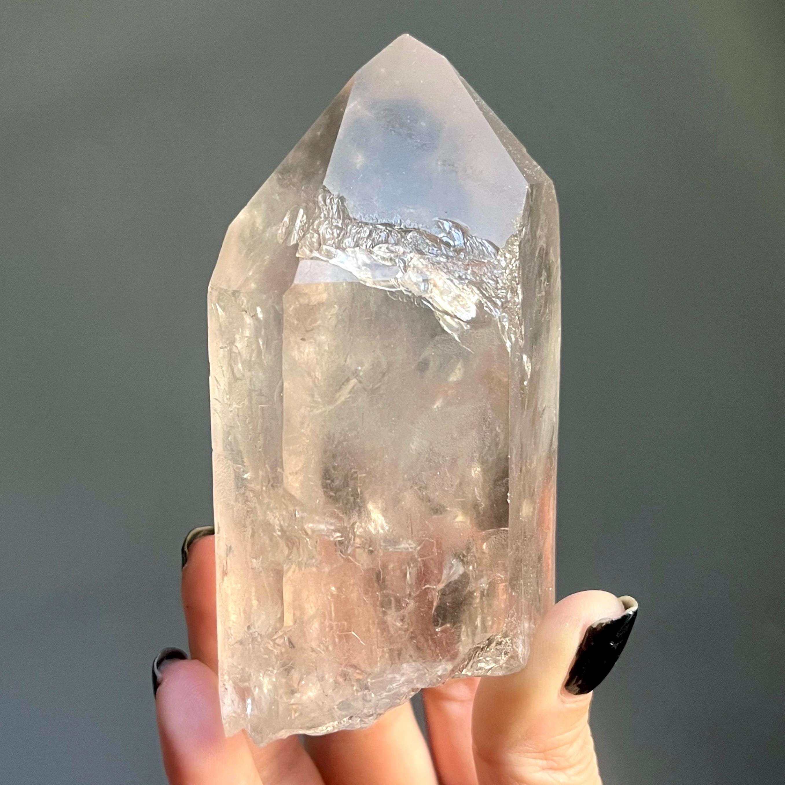 Weighing almost a pound, the story of this rare, large lemurian crystal point is written in the grooves of lemurian DNA, geometric keys, extraordinary glyph like etchings and deep lightning quartz marks.