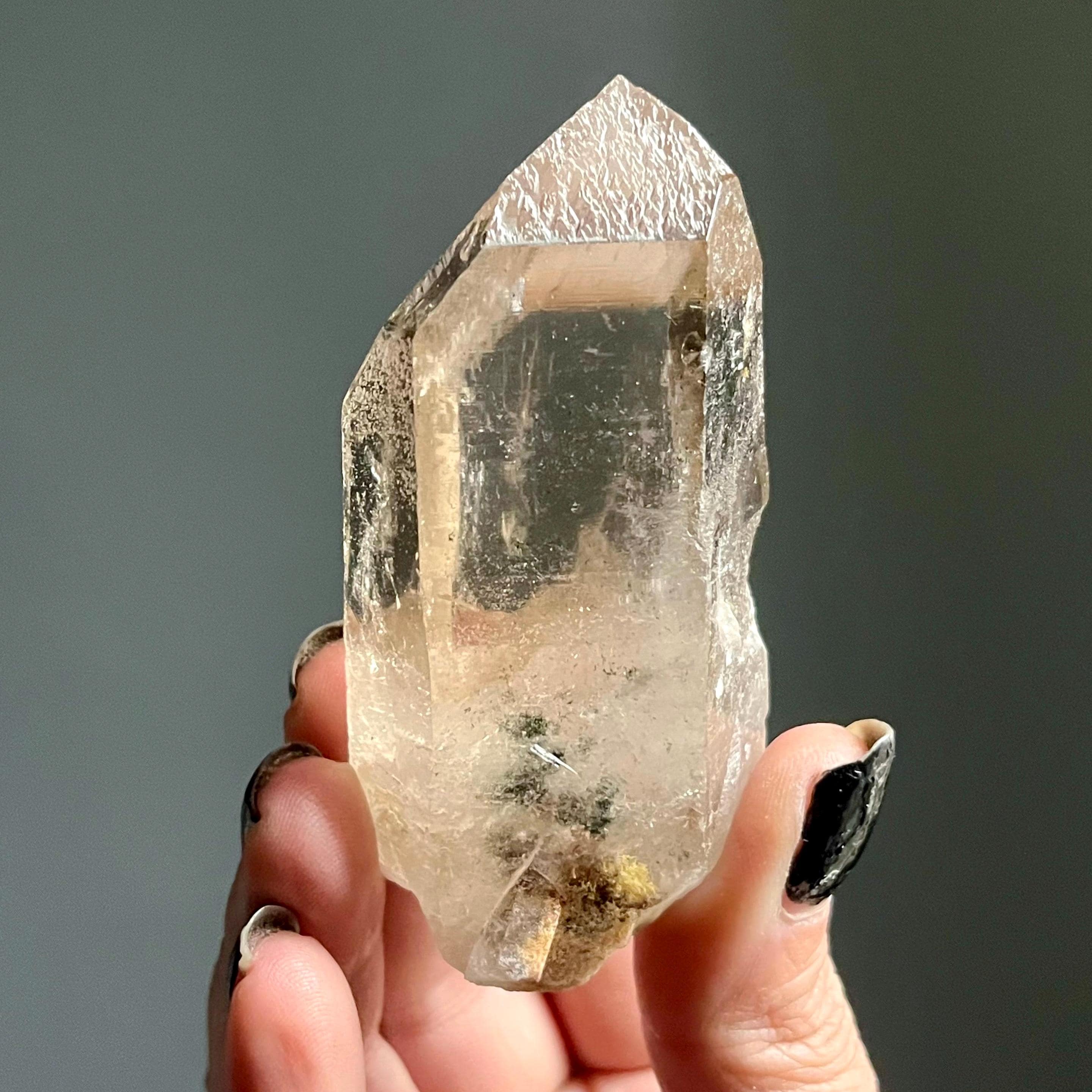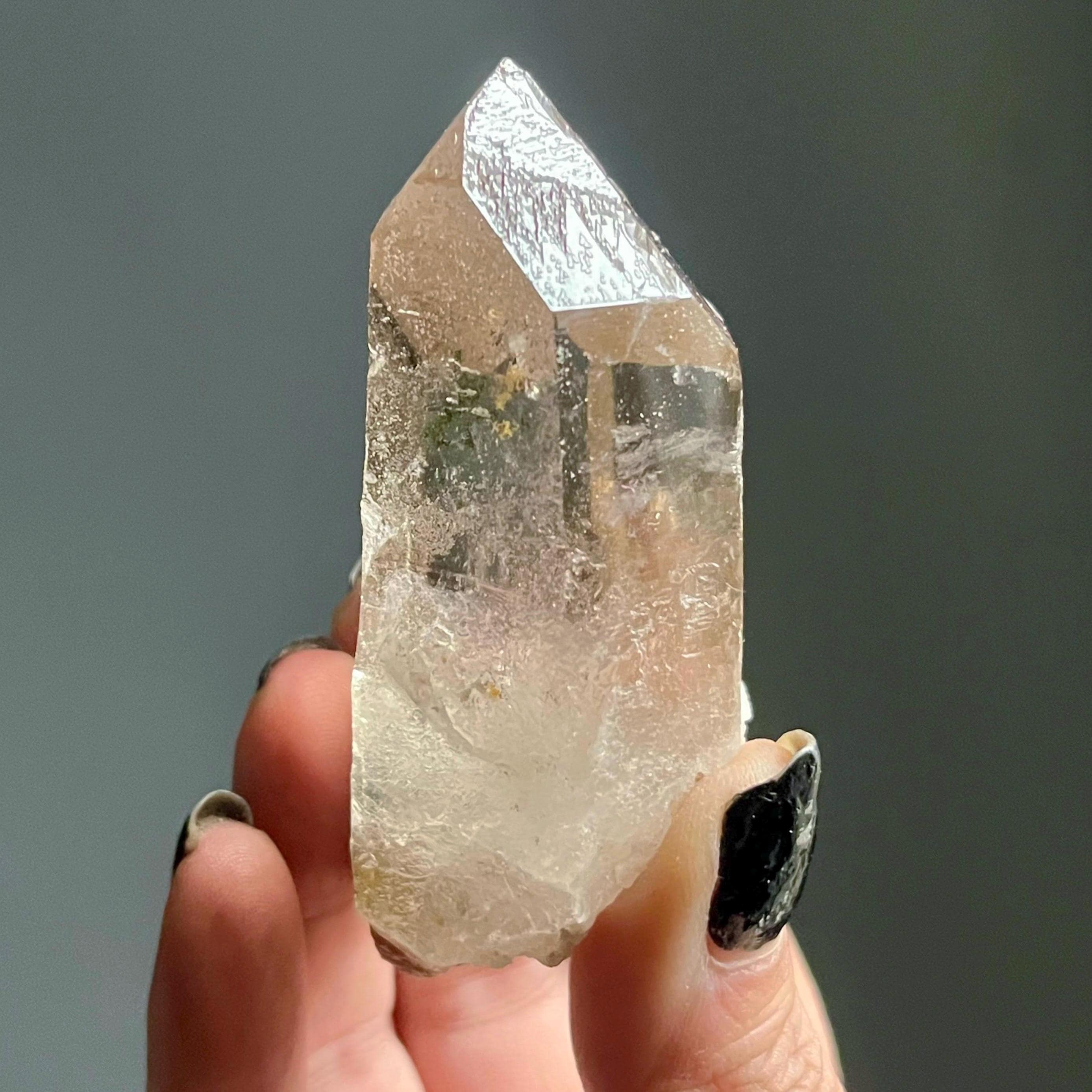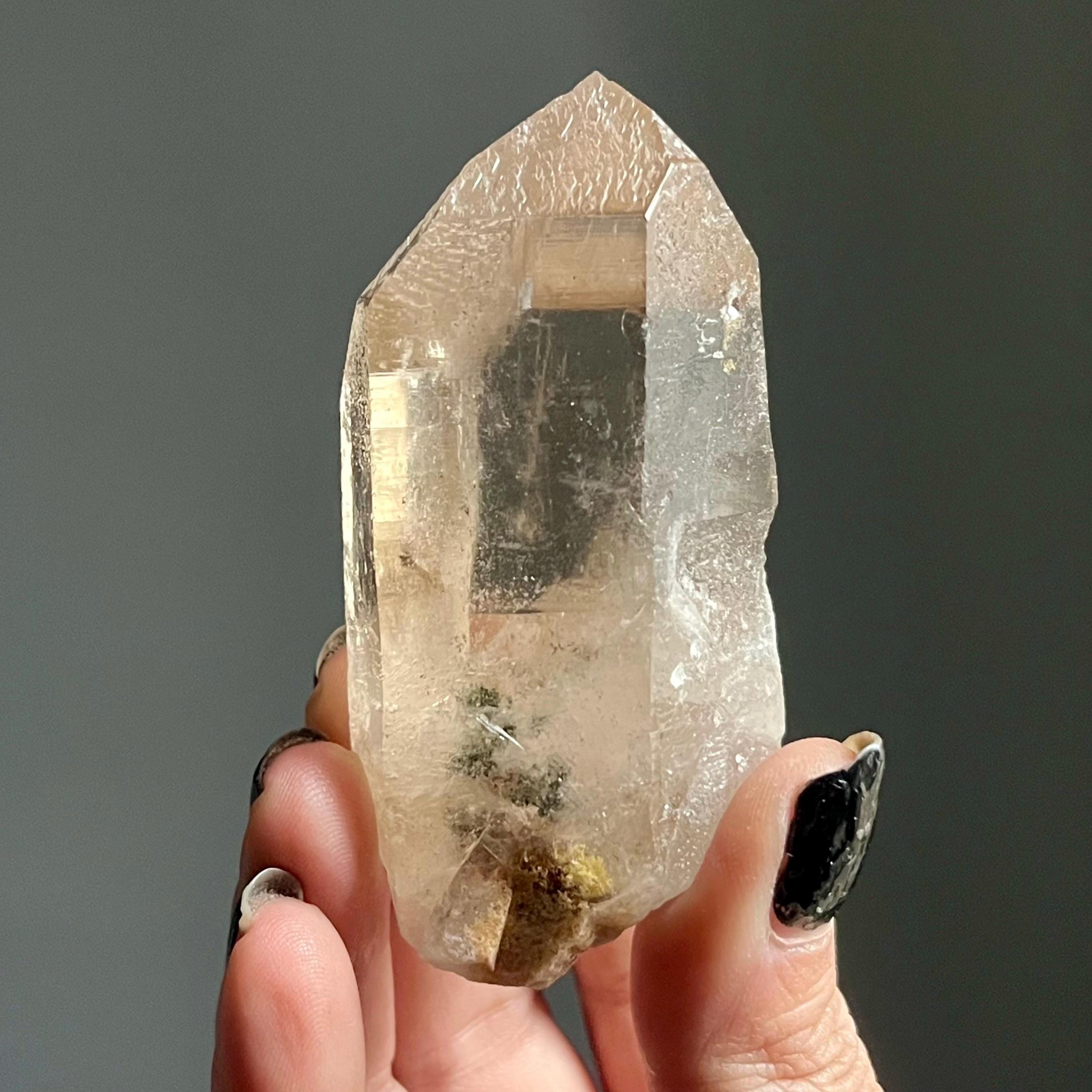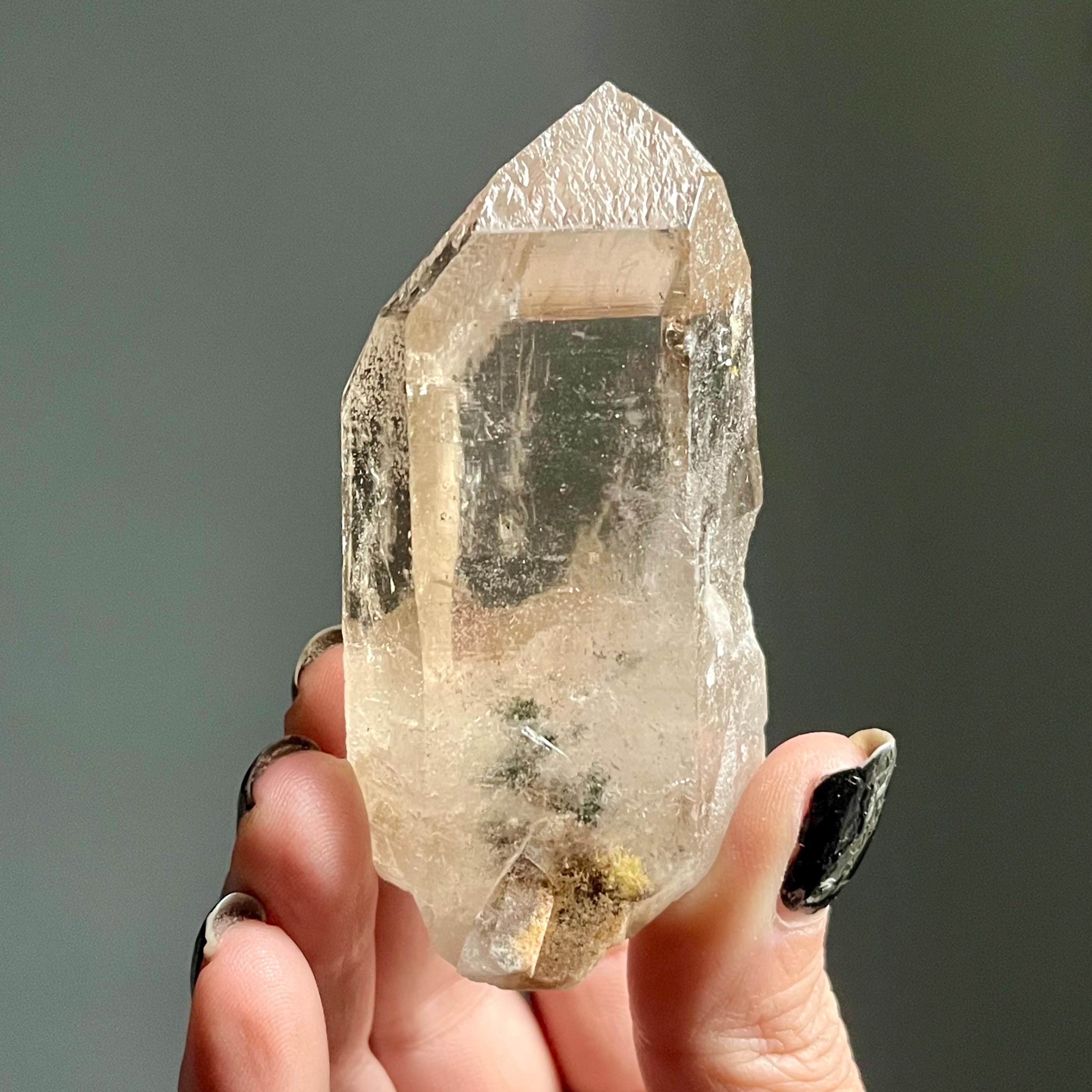 A master record keeper, this wild natural citrine lemurian quartz crystal point manifests with a channeling quartz termination and bold green chlorite phantoms.