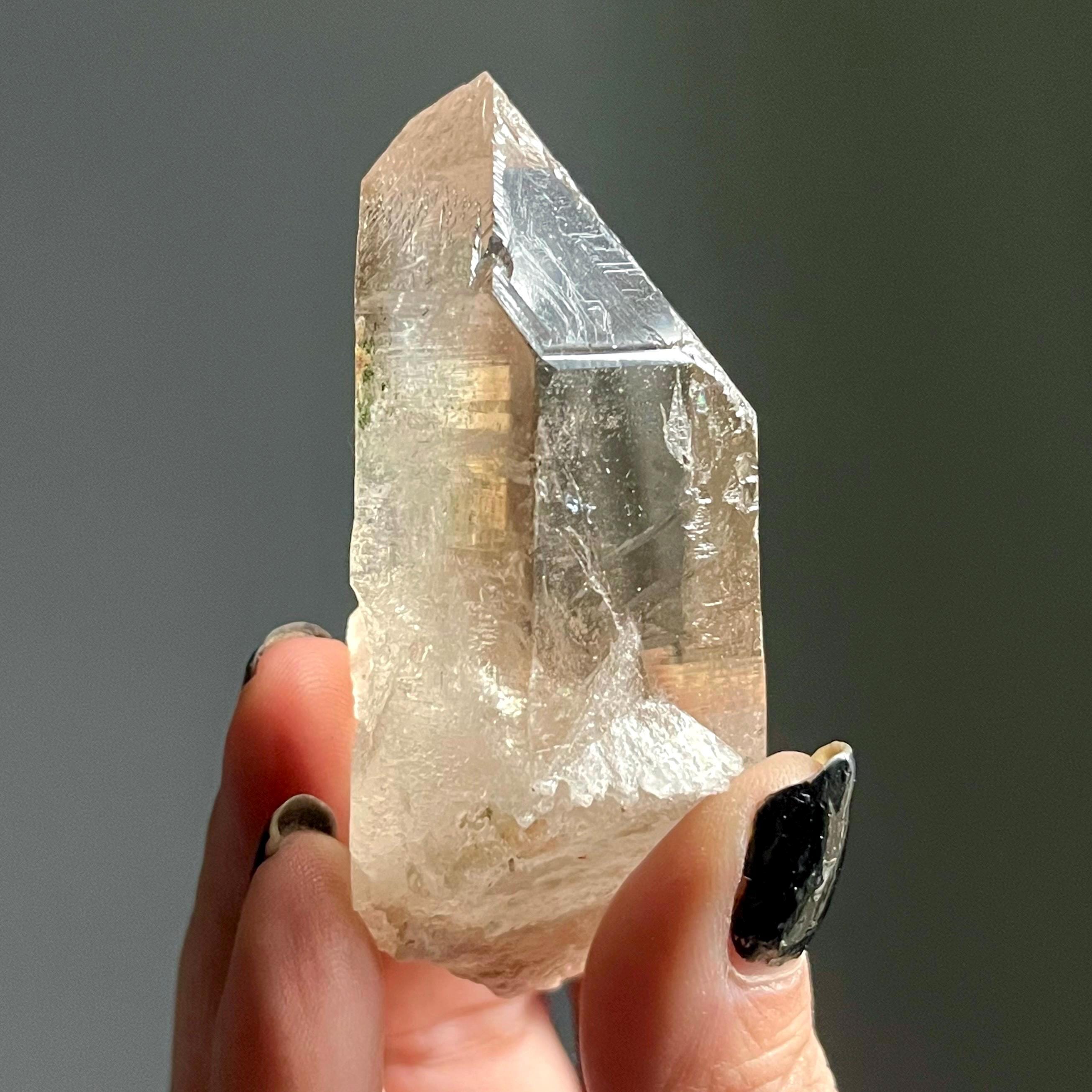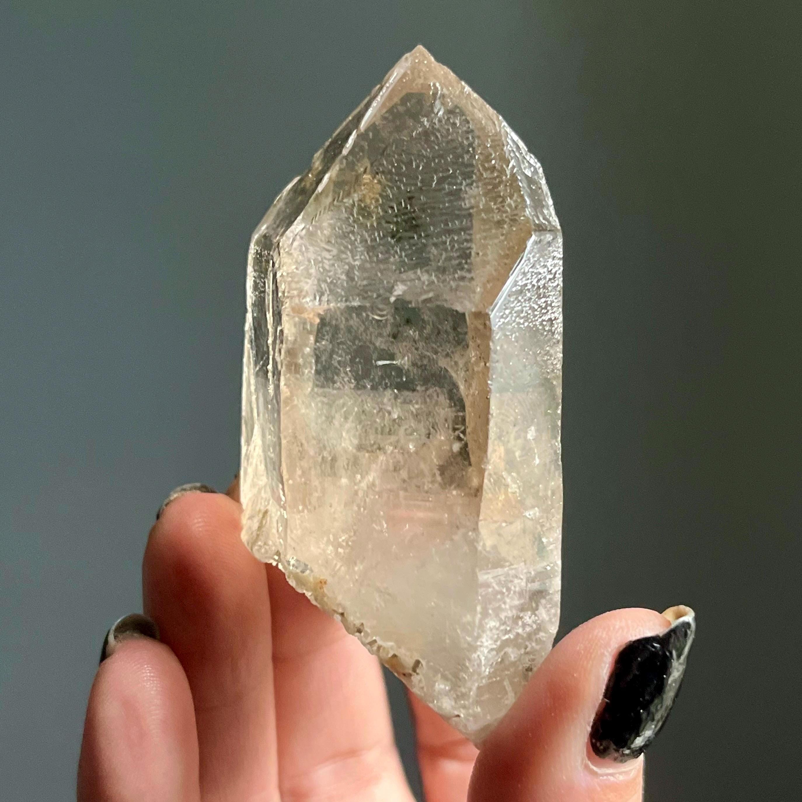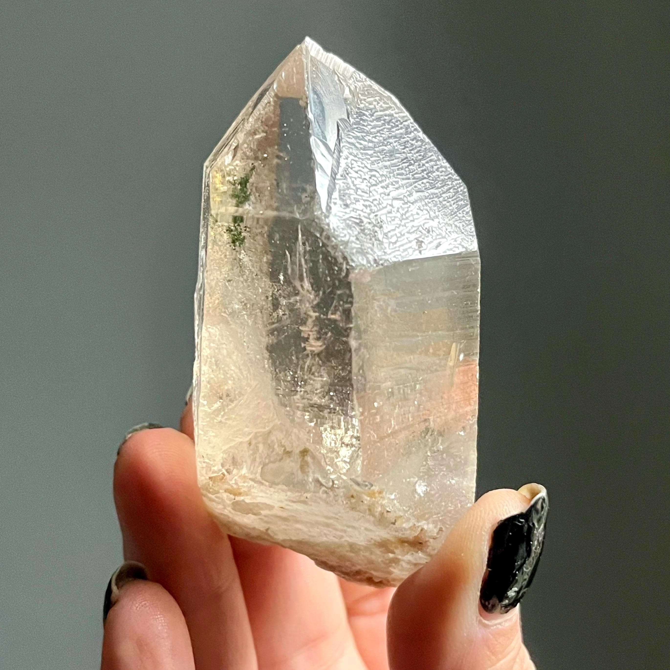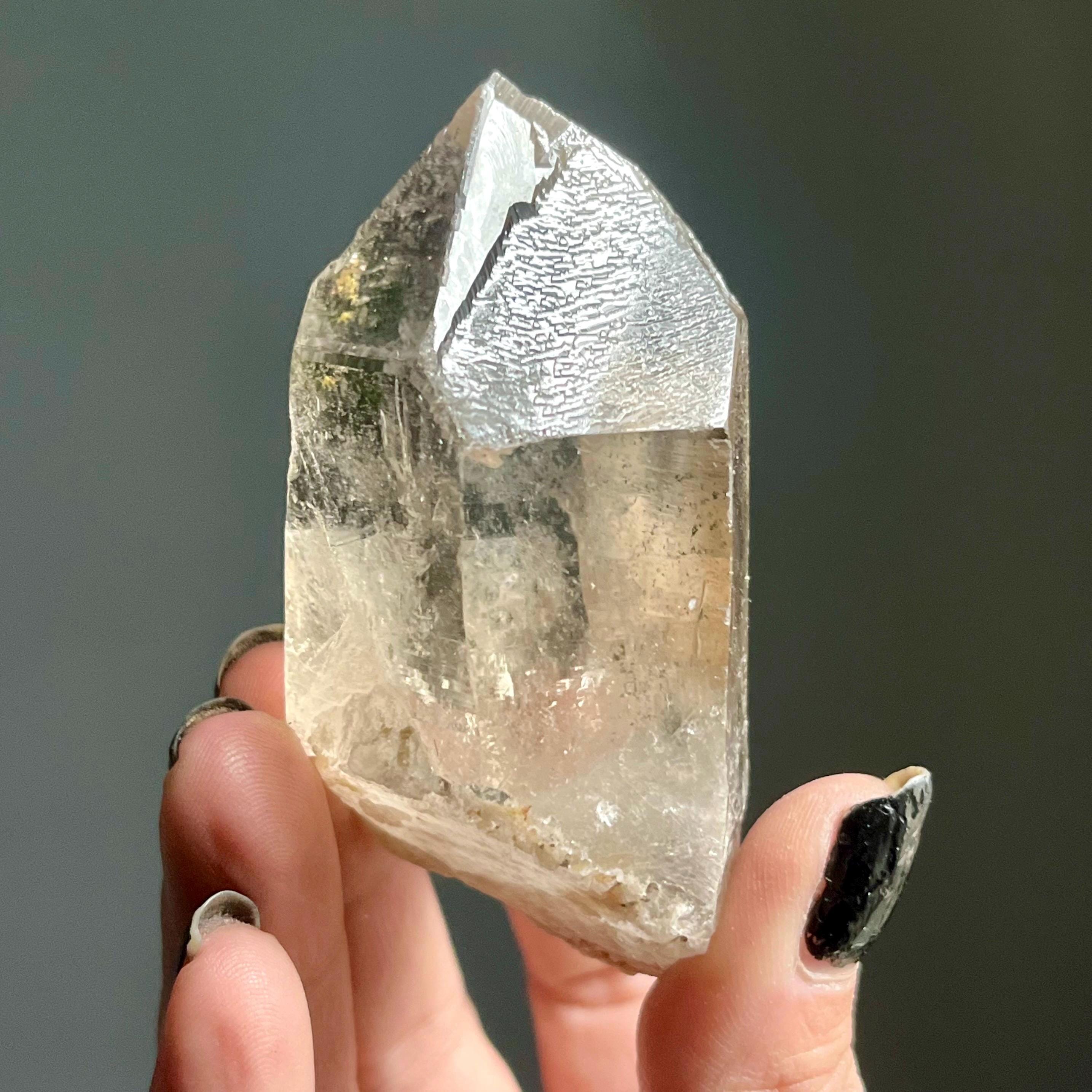 Wild and untreated, this wild stone manifests with a natural 7-3 channeling crystal termination. Channeling quartz is the first order in the master crystal triad.