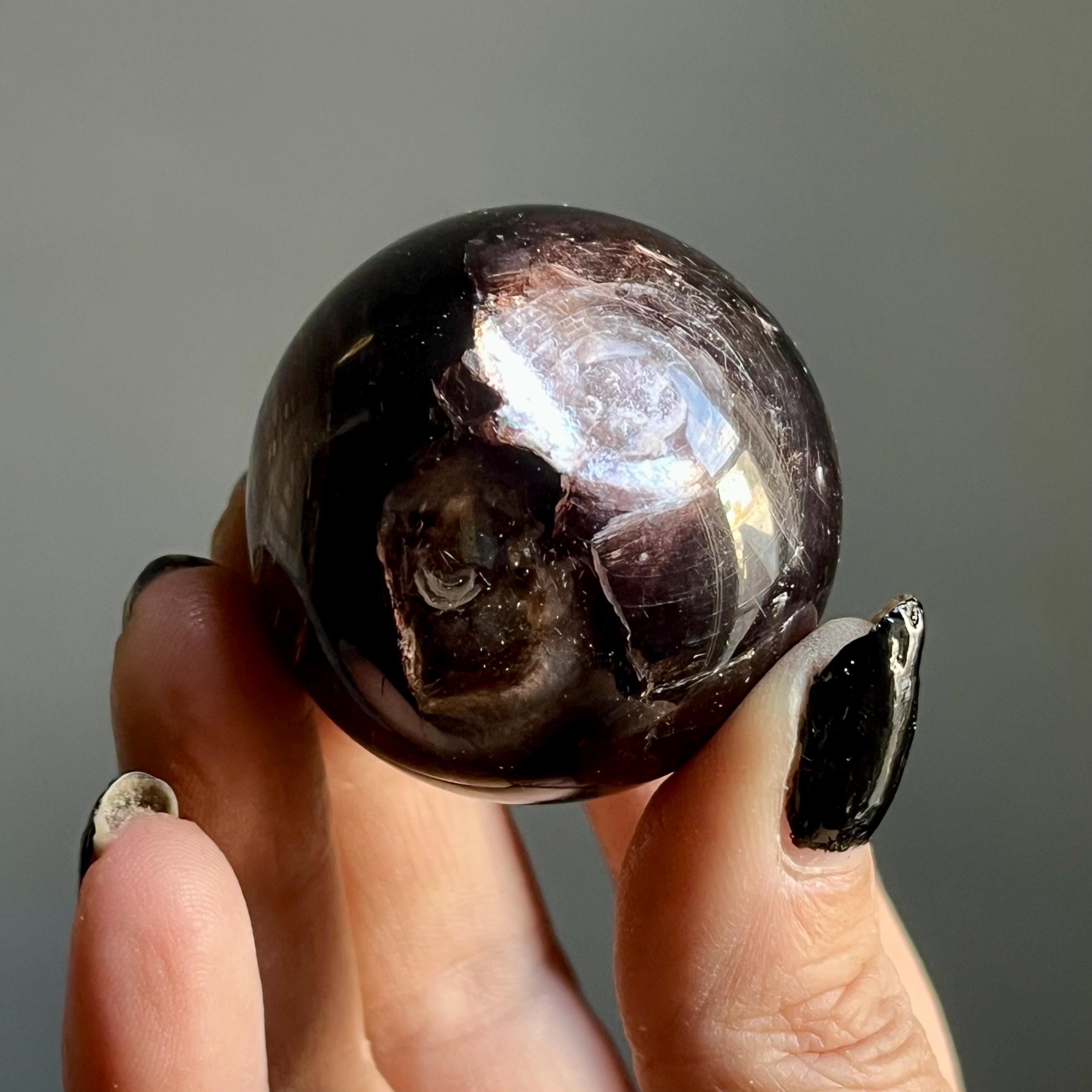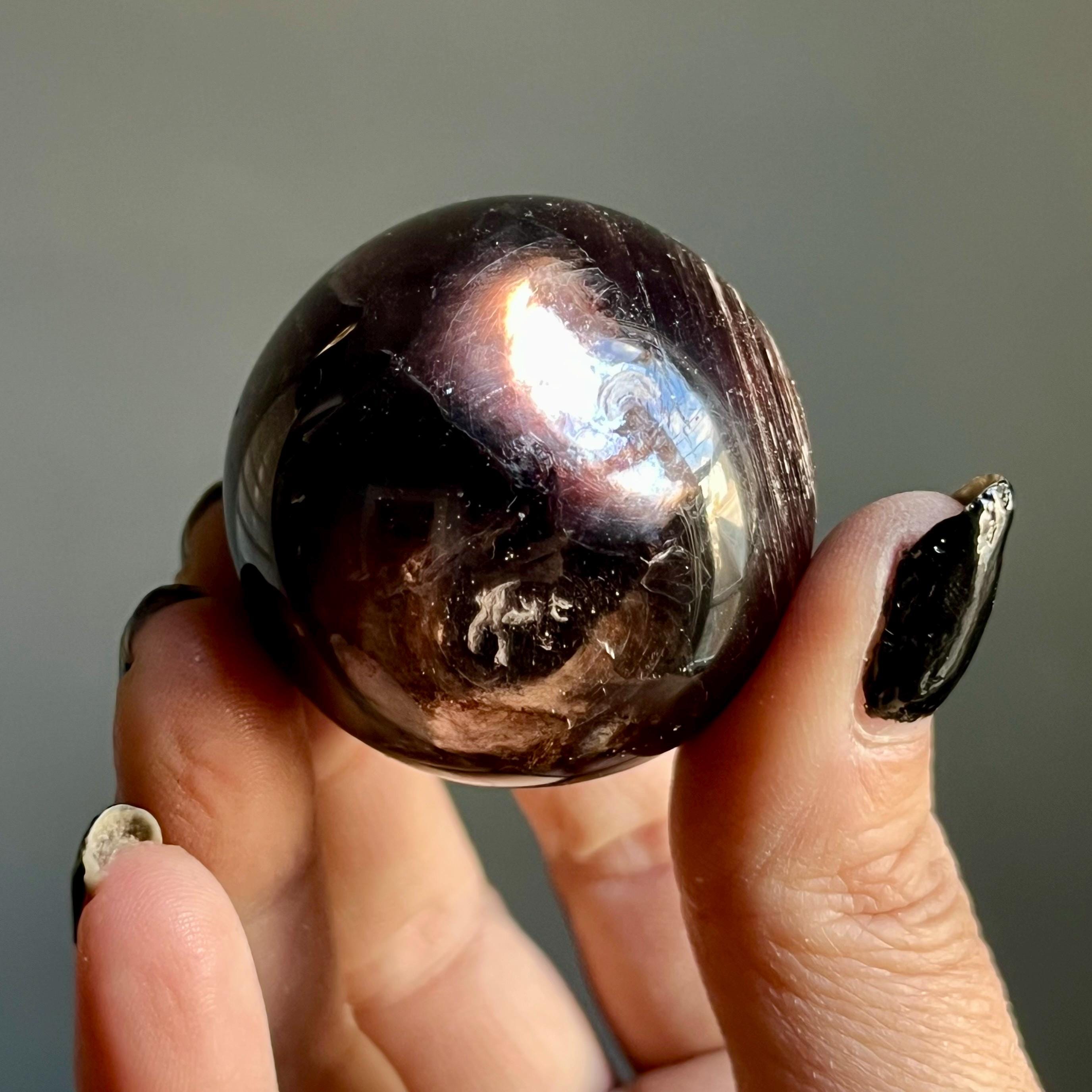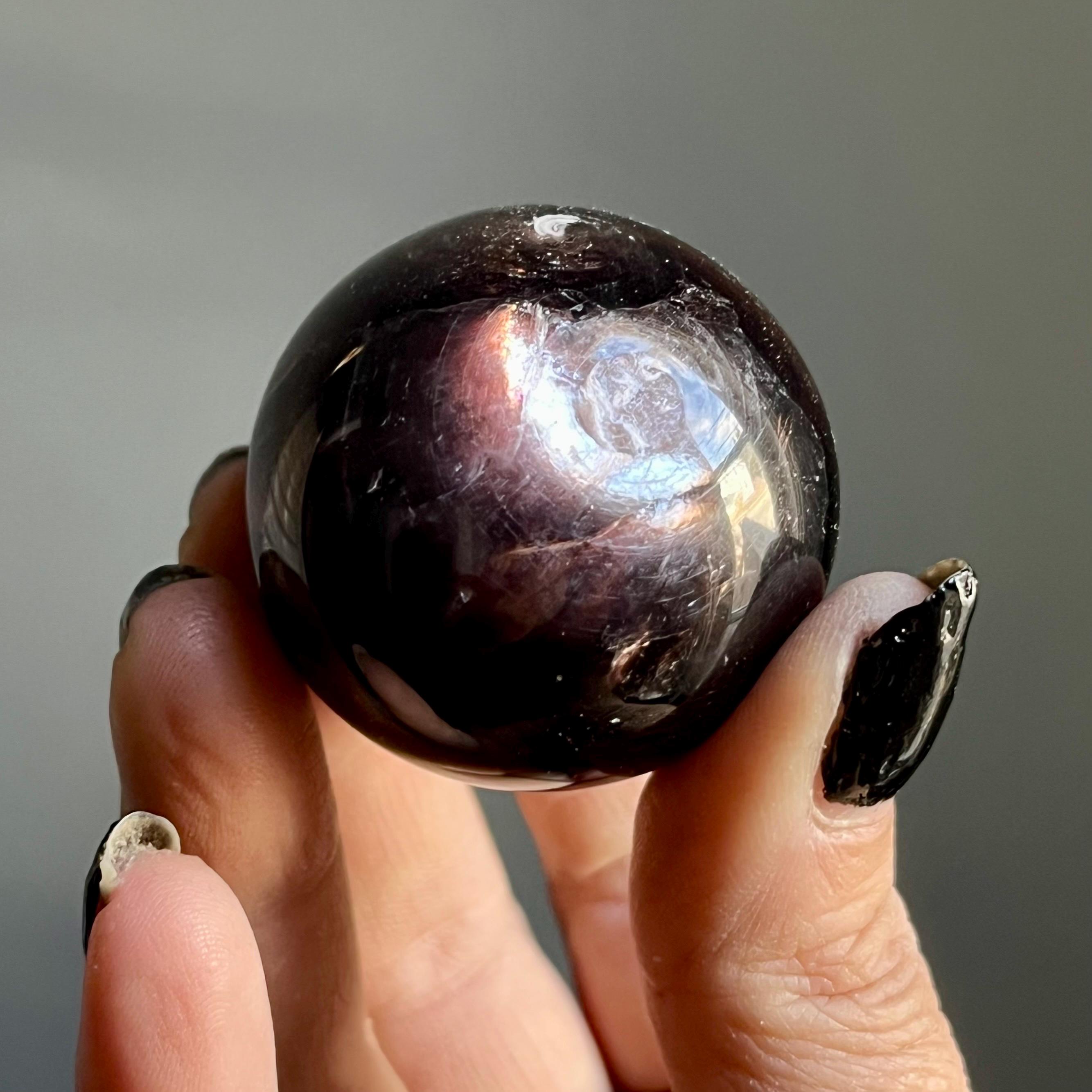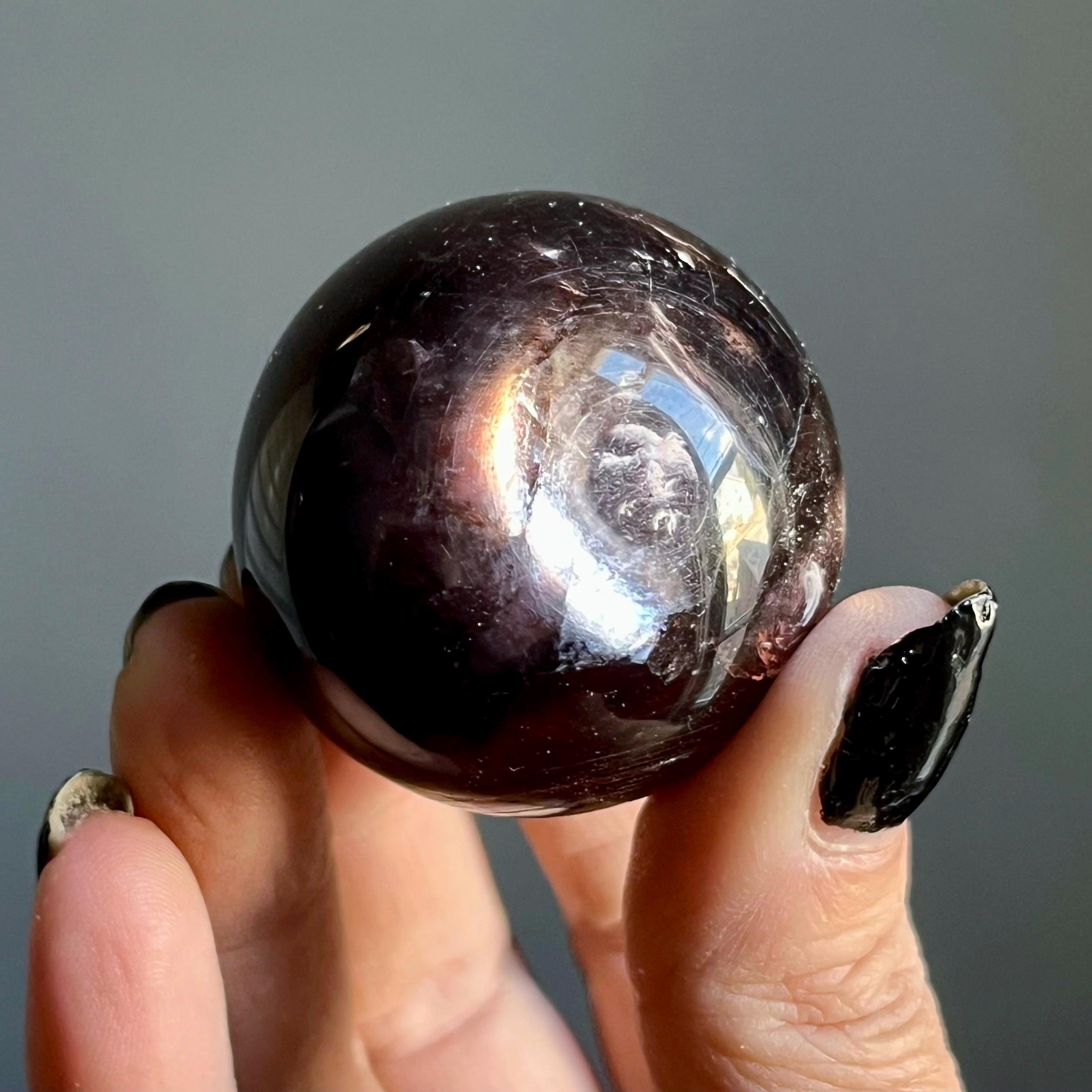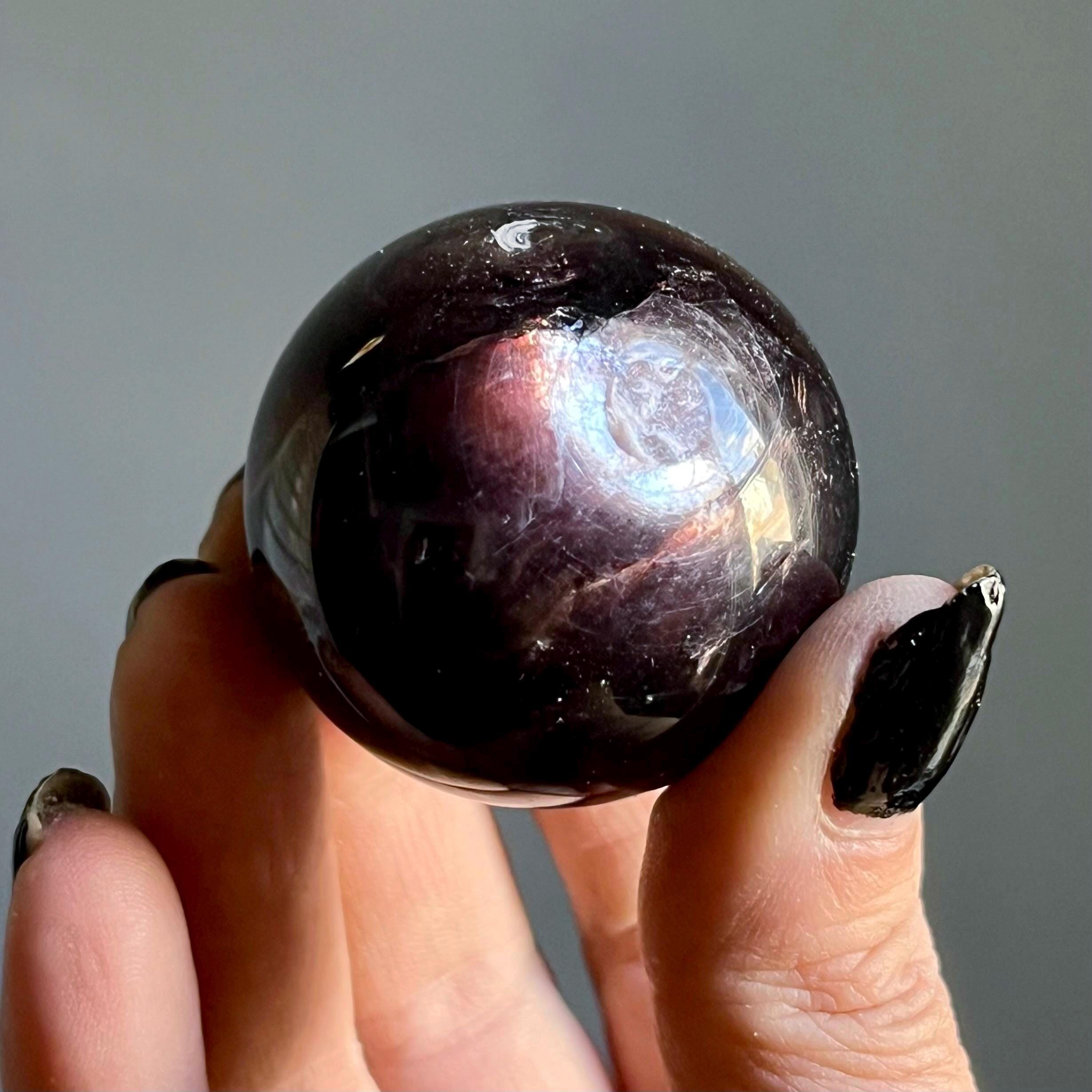 This rare, high quality gem lepidolite mica crystal sphere is electric. Rich purple mica erupts in a cacophony of colors, ruby red lepidolite flames dance around rainbow and brilliant blue flash.