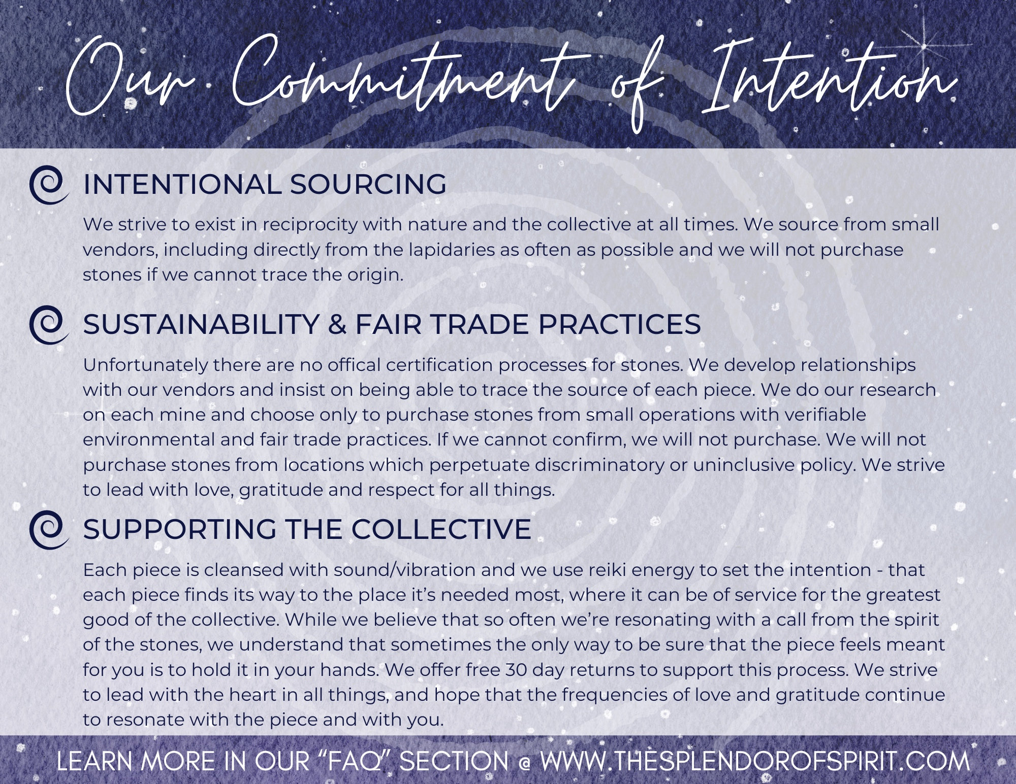 - All stones are cleansed and infused with reiki energy prior to shipping. Please see the shopโs โAboutโ section for details regarding our intentional practices.
