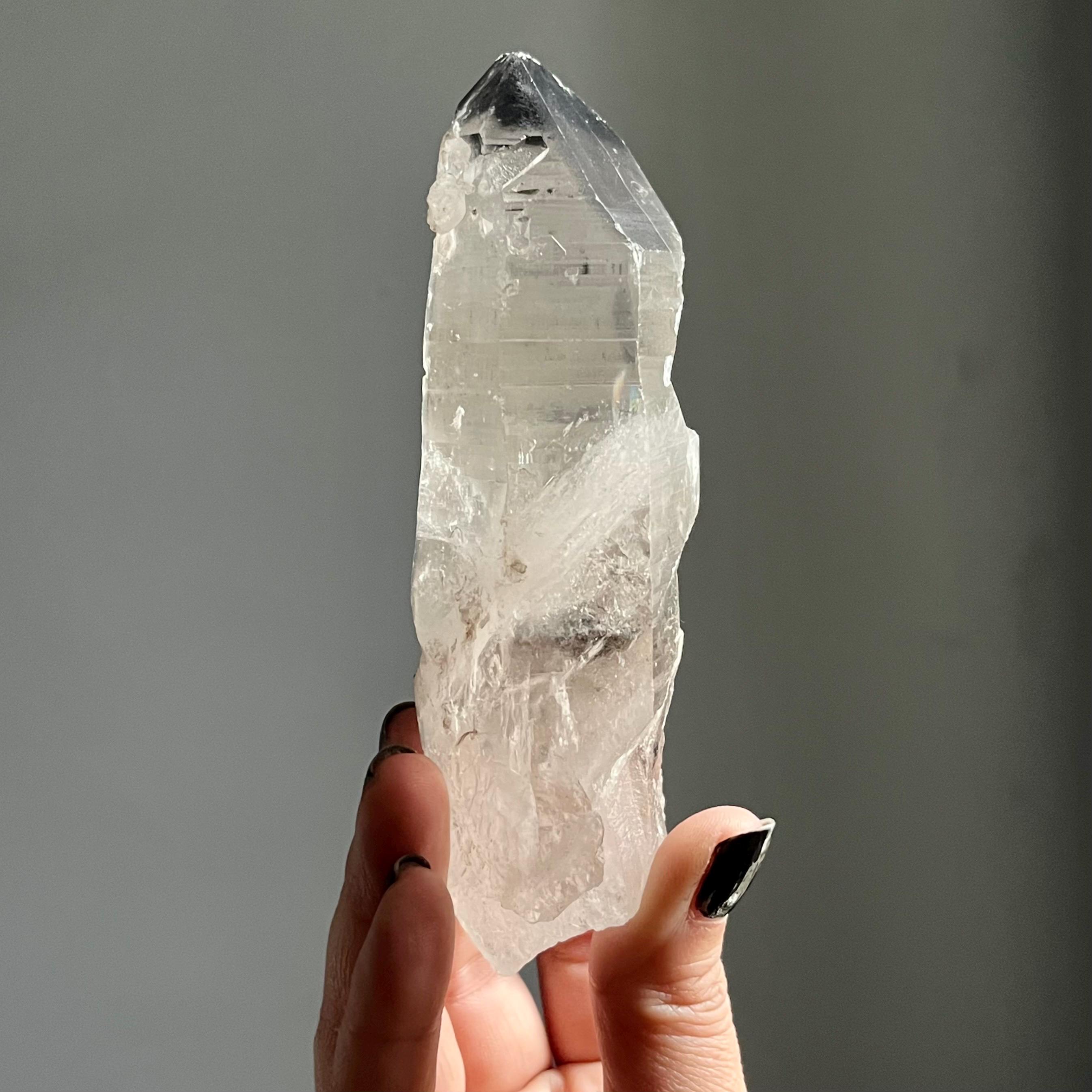Naturally curved, bent quartz manifests with a channeling crystal point with deep key portals and sacred record keepers.